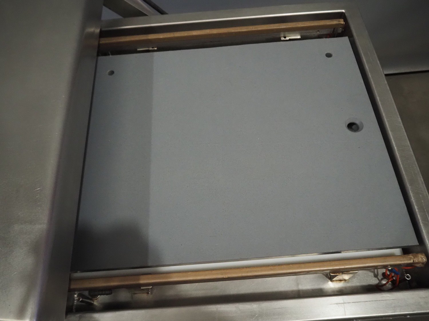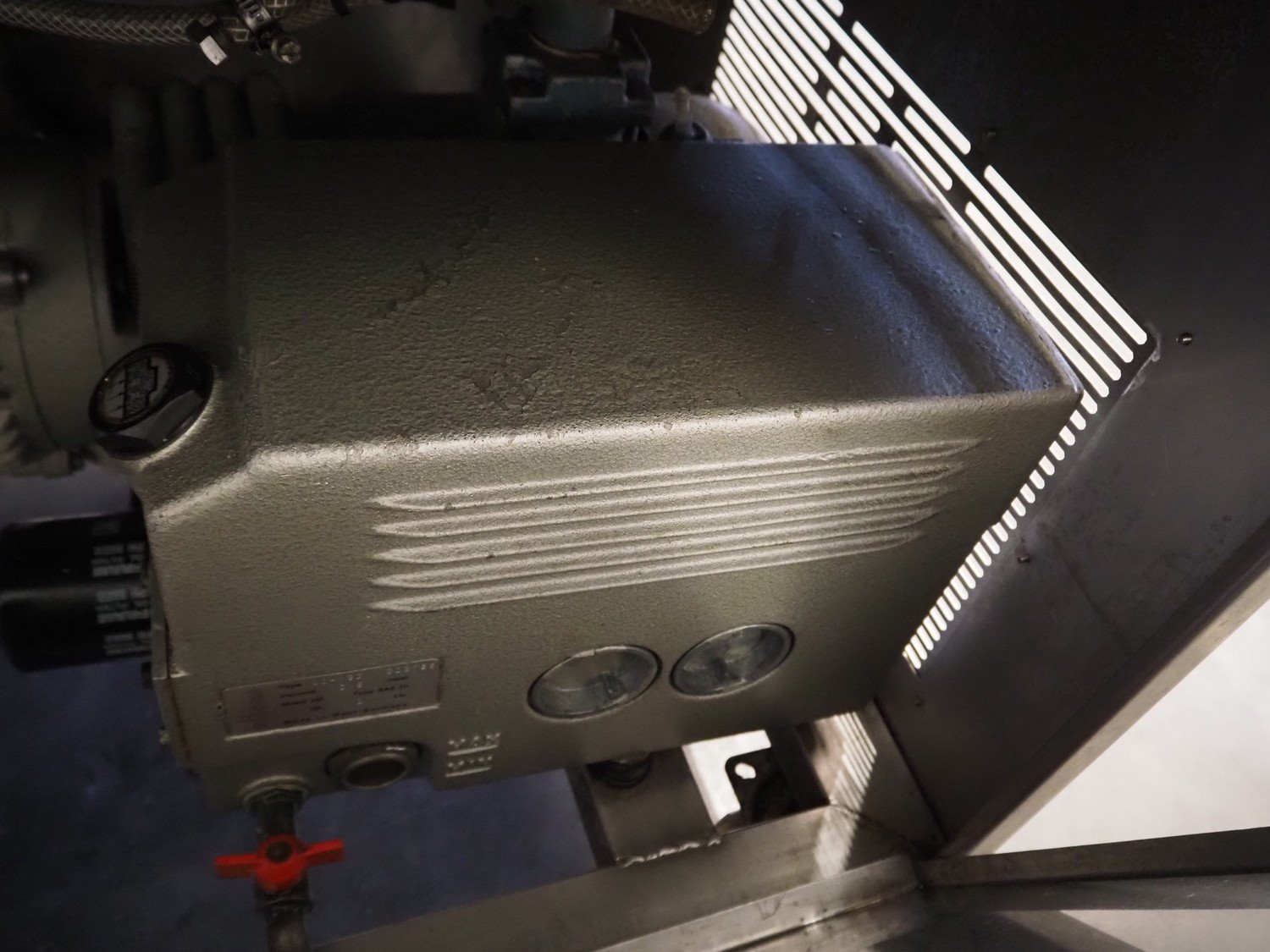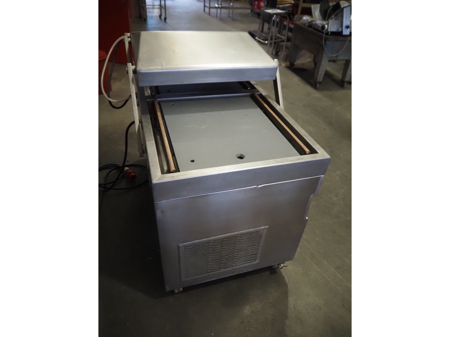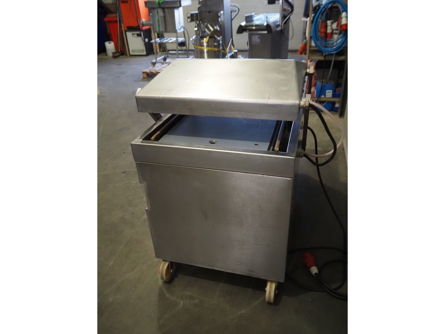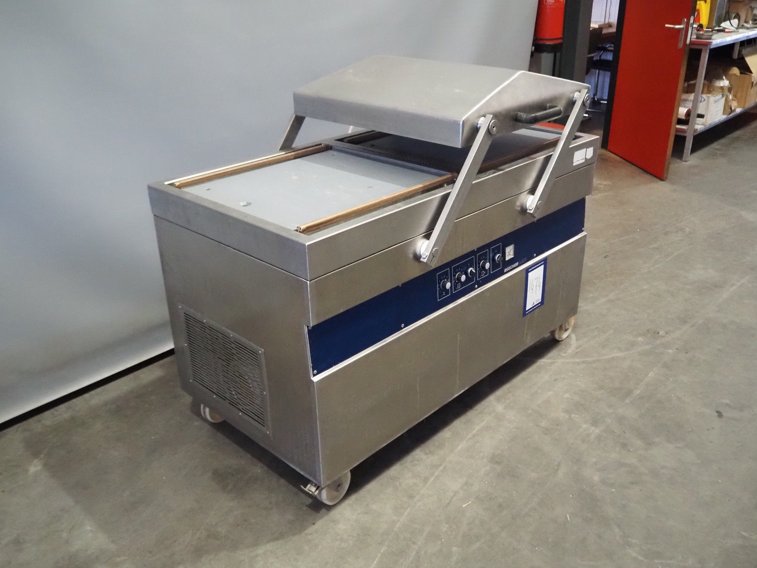 Röschermatic mobile double chamber vacuum machine, type: VM-45/2, number: 6600051, 380/220 V, 50 Hz, 2.2 kW, Busch vacuum pump, type: 100-132, capacity: 100 m³ per hour, dimensions: 750 mm x 1450 mm x 1200 mm. Kavel locatie: Scottweg 23, 4462 GS Goes, Nederland