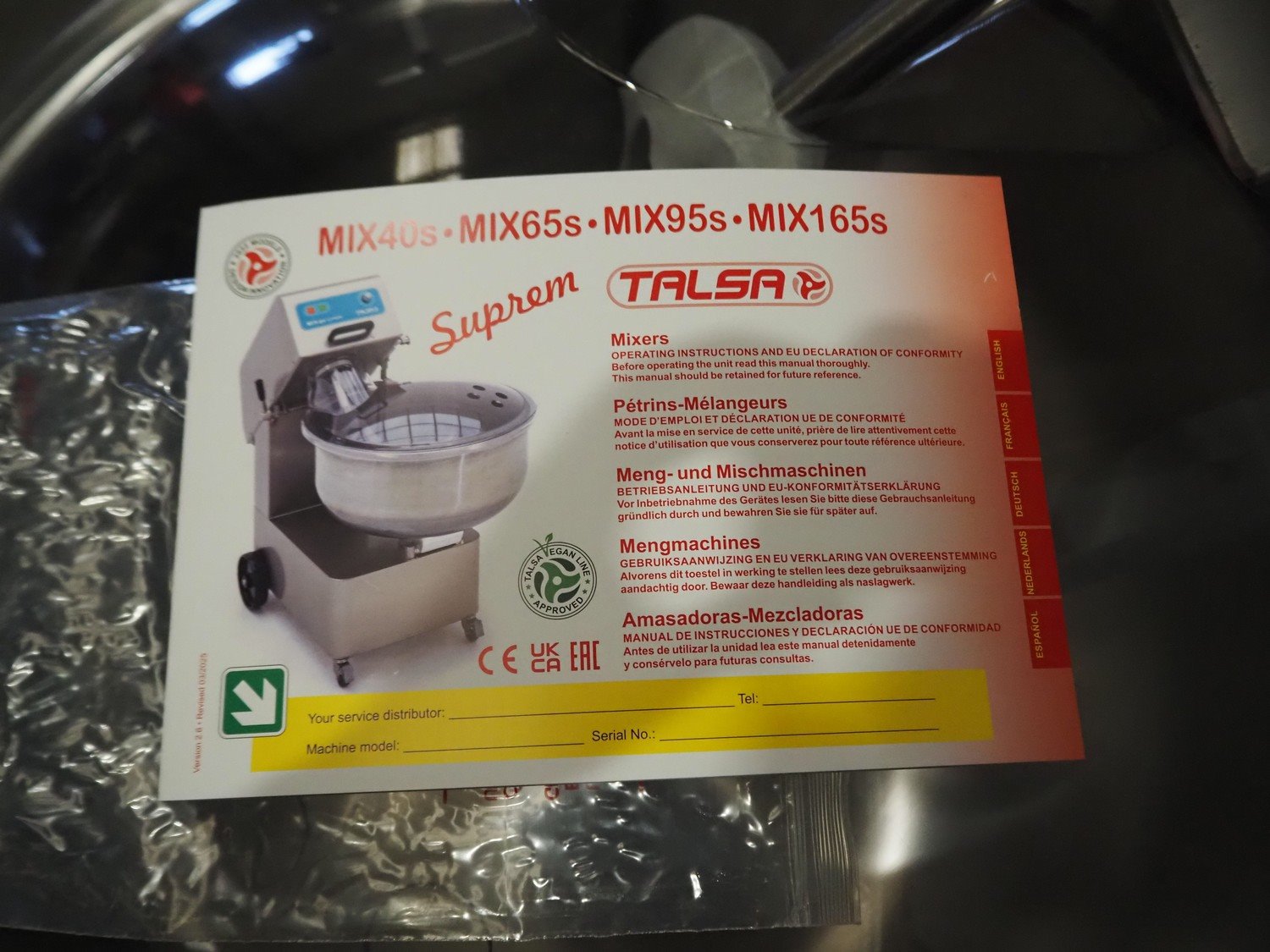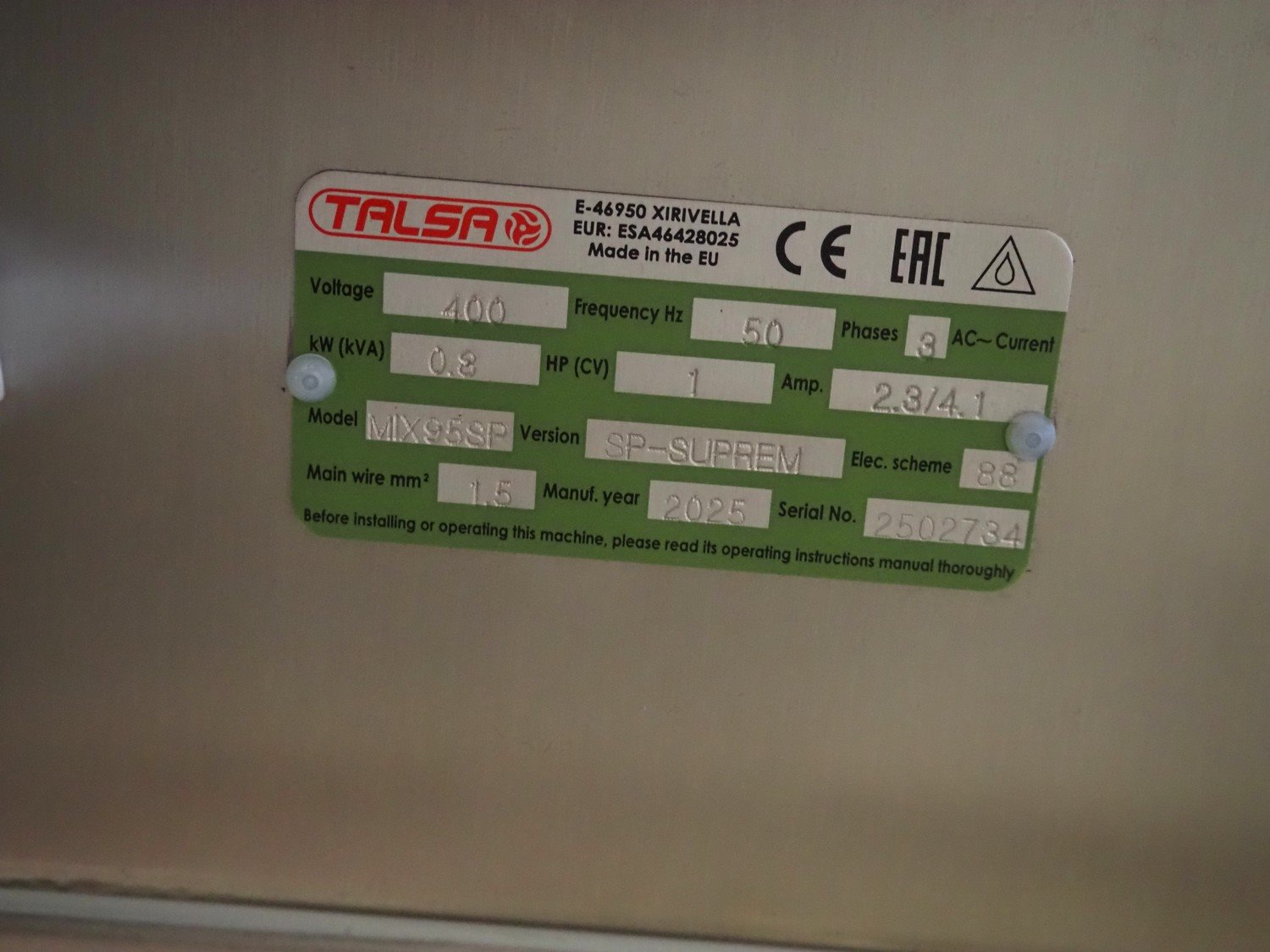Talsa mobile mixer, model: MIX95SP, version: SP-SUPREM, serial number: 2502734, year of construction: 2025, 400 V, 3 Ph, 50 Hz, 2.3/4.1 A, 0.8 kW, volume: 95 liter, dimensions: 1100 mm x 770 mm x 1170 mm. Kavel locatie: Scottweg 23, 4462 GS Goes, Nederland