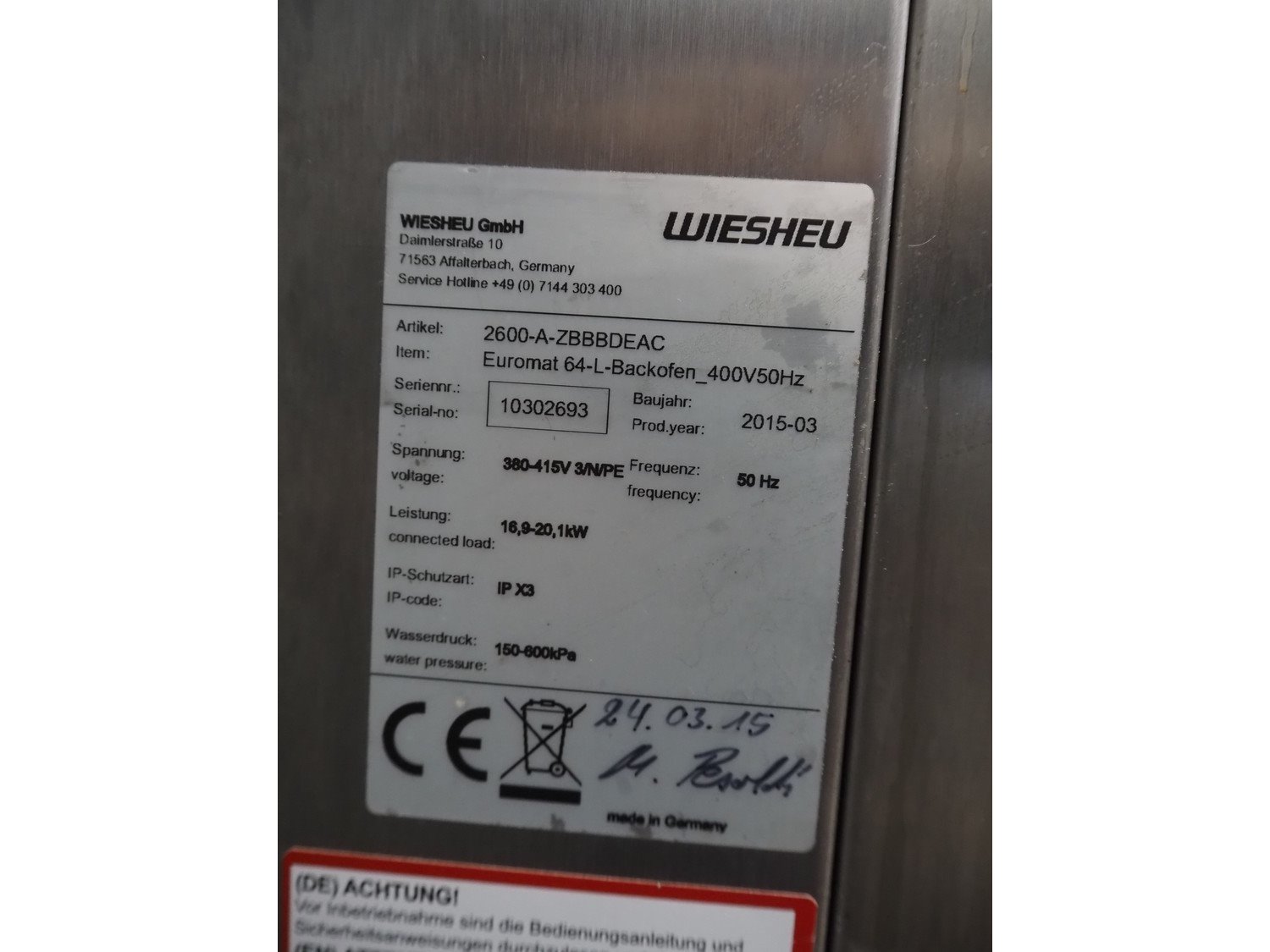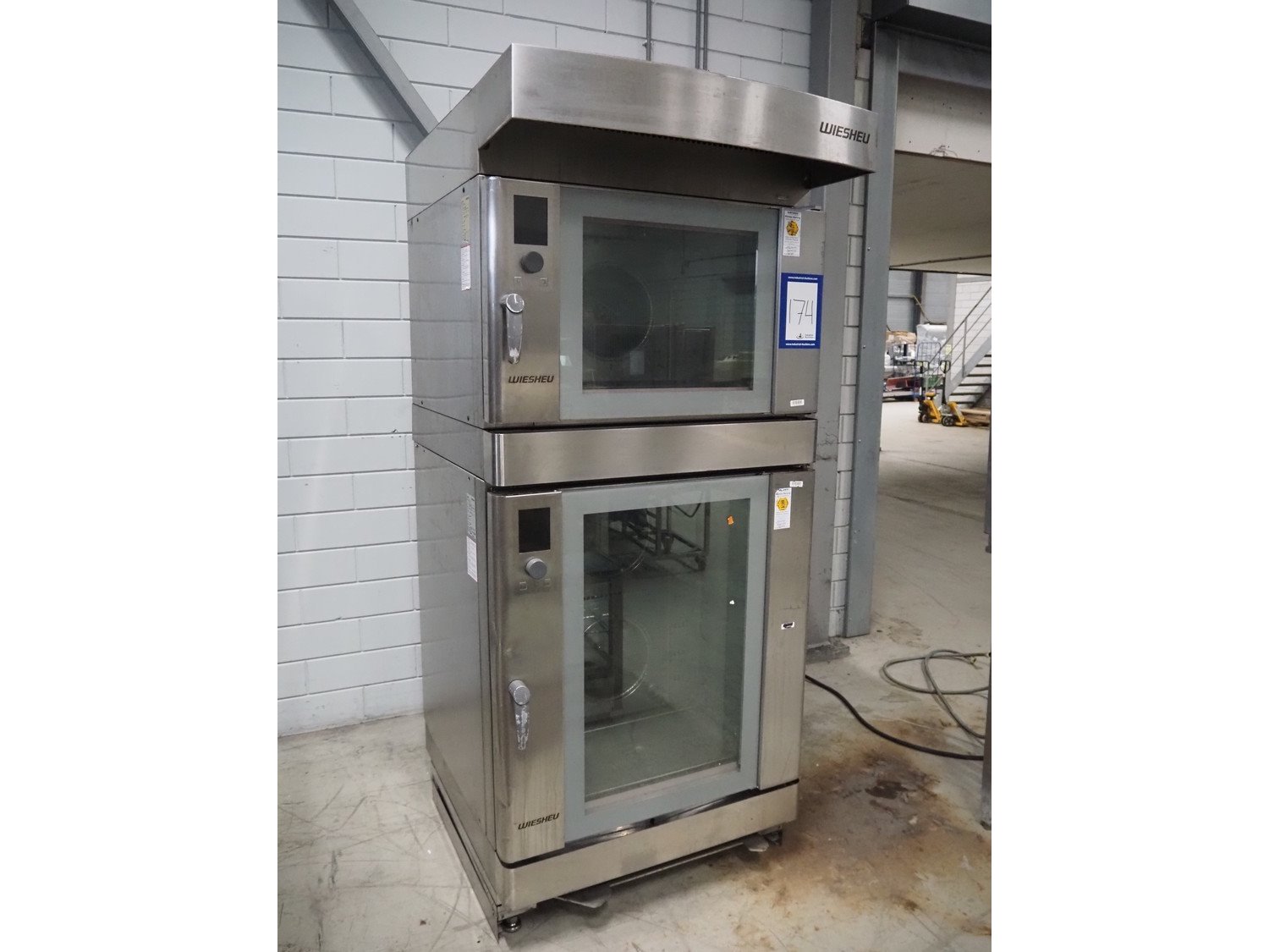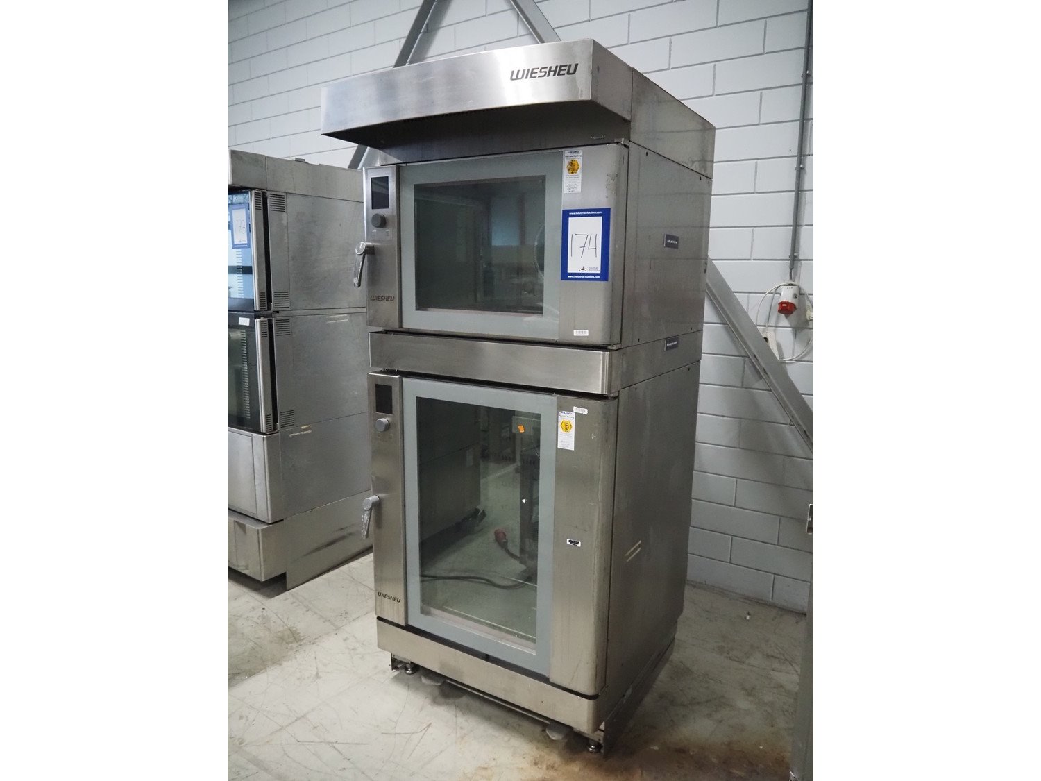 Wiesheu GmbH double stacked oven, type: Euromat 64-S /Euromat 64-L, serial number: 10302701 / 10302693, year of construction: 2015-03, 380-415 V, 3 Ph, 50 Hz, 8.5-10.1 / 16.9-20.1 kW, inside dimensions: 690 mm x 410 mm x 420 mm / 650 mm x 400 mm x 750 mm, total dimensions: 1280 mm x 950 mm x 2140 mm. Kavel locatie: Looyenbeemd 11, 5652 BH Eindhoven, Nederland