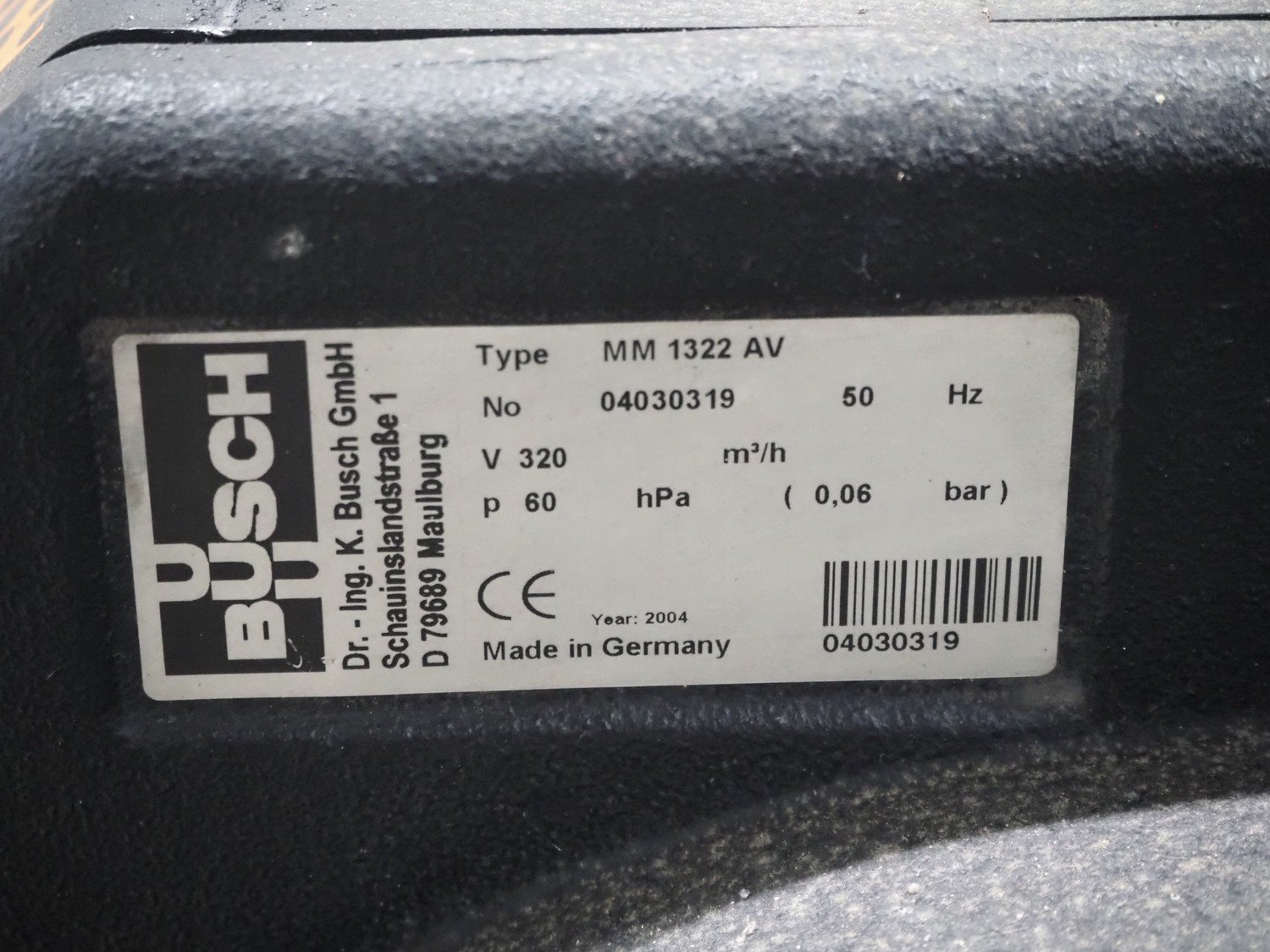 Busch vacuum pump, type: MM 1322 AV, number: 04030319, capacity: 320 m³ per hour, dimensions: 400 mm x 570 mm x 680 mm. Kavel locatie: Looyenbeemd 11, 5652 BH Eindhoven, Nederland