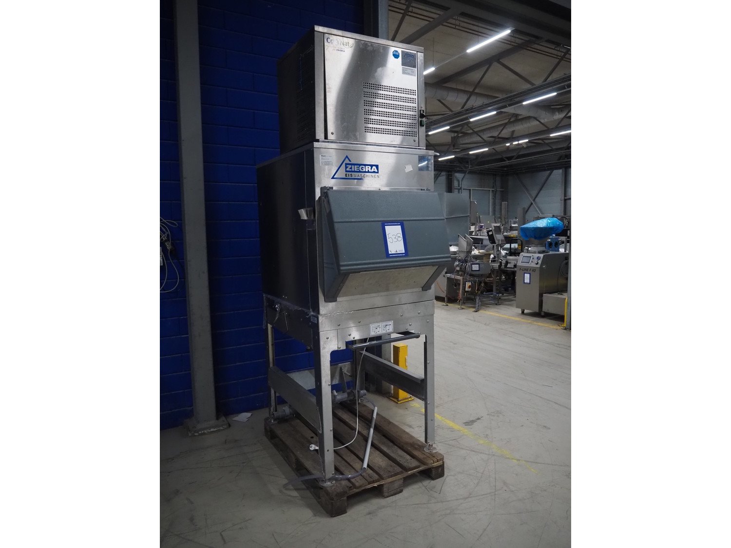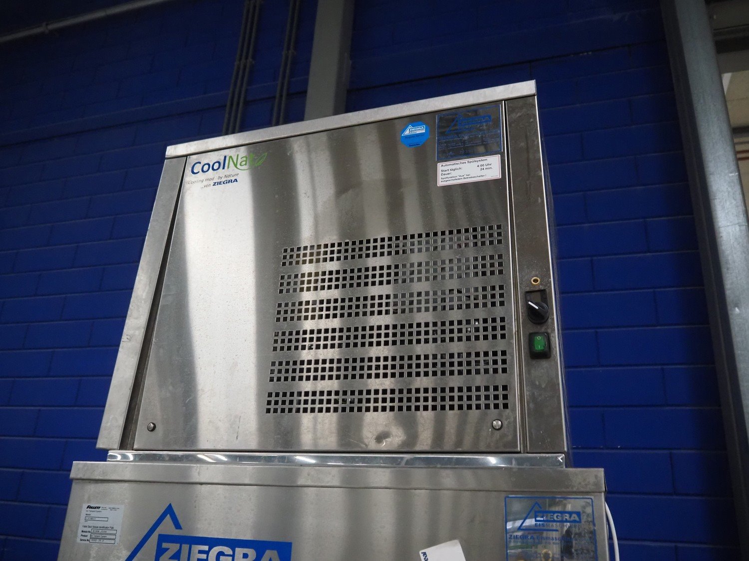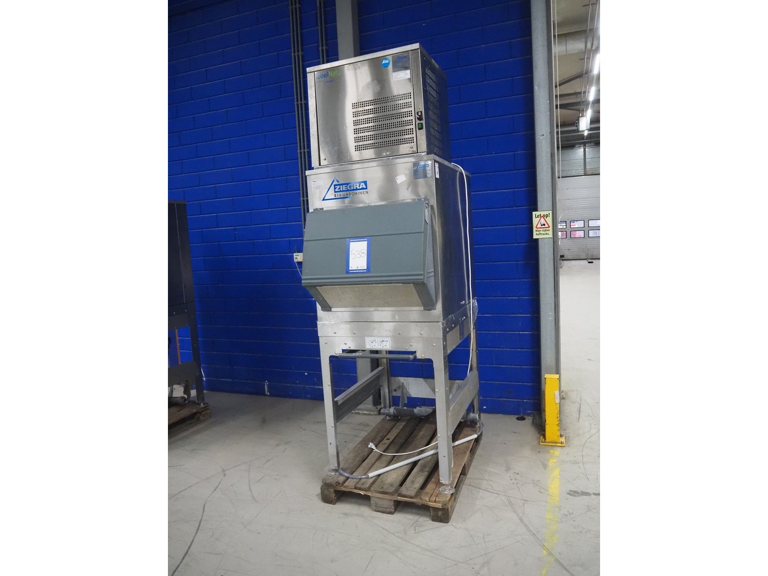 Ziegra Eismaschinen ice machine with bunker, serial number bunker: 223975/223976, model ice machine: ZBE 550 EV, serial number: 151286, 400 V, 3 Ph, 50 Hz, 6 A, refrigerant: R404A, dimensions bunker: 850 mm x 1250 mm x 2500, dimensions ice machine: 950 mm x 500 mm x 850 mm. Kavel locatie: Looyenbeemd 11, 5652 BH Eindhoven, Nederland