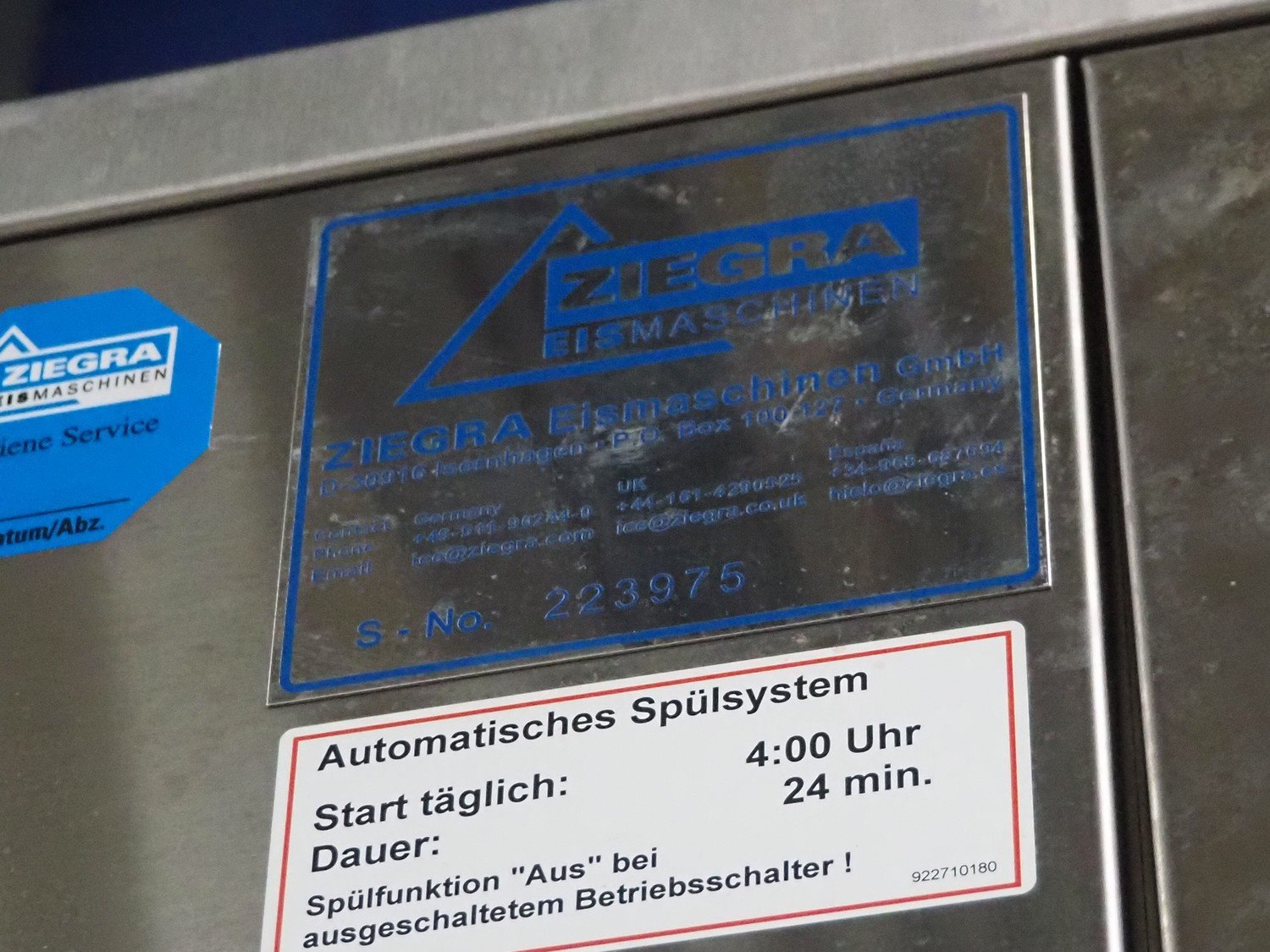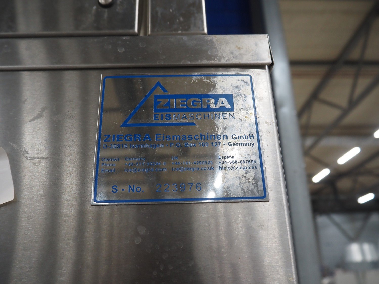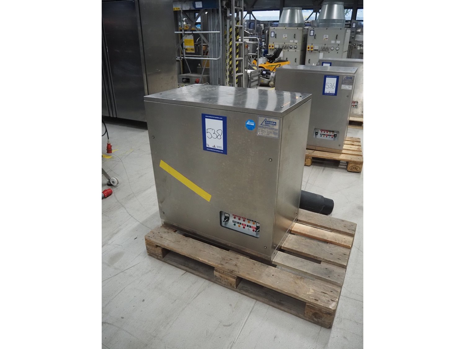 Ziegra Eismaschinen ice machine with bunker, serial number bunker: 223975/223976, model ice machine: ZBE 550 EV, serial number: 151286, 400 V, 3 Ph, 50 Hz, 6 A, refrigerant: R404A, dimensions bunker: 850 mm x 1250 mm x 2500, dimensions ice machine: 950 mm x 500 mm x 850 mm. Kavel locatie: Looyenbeemd 11, 5652 BH Eindhoven, Nederland