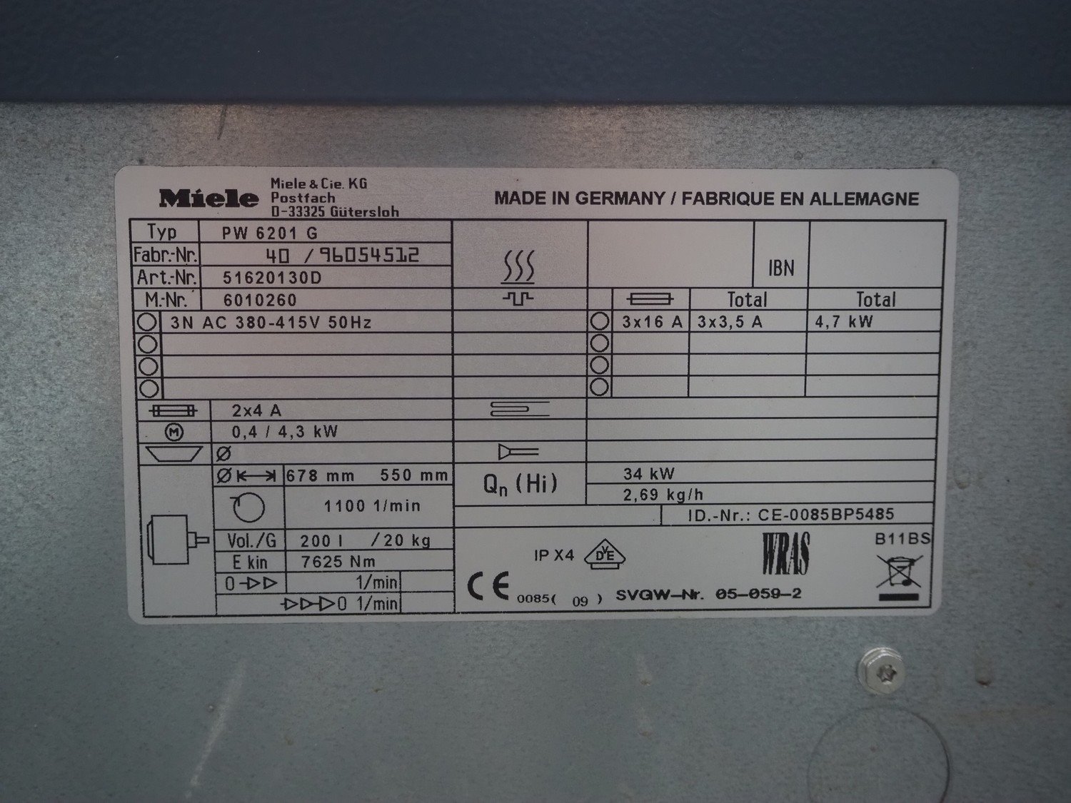 Miele washing machine, type: PW 6201 G, fabrication number: 40/96054512 , 380/415 V, 3 Ph, 50 Hz, 3.5 A, 4.7 kW, volume: 200 liter, dimensions: 1500 mm x 900 mm x 1400 mm. Kavel locatie: Looyenbeemd 11, 5652 BH Eindhoven, Nederland