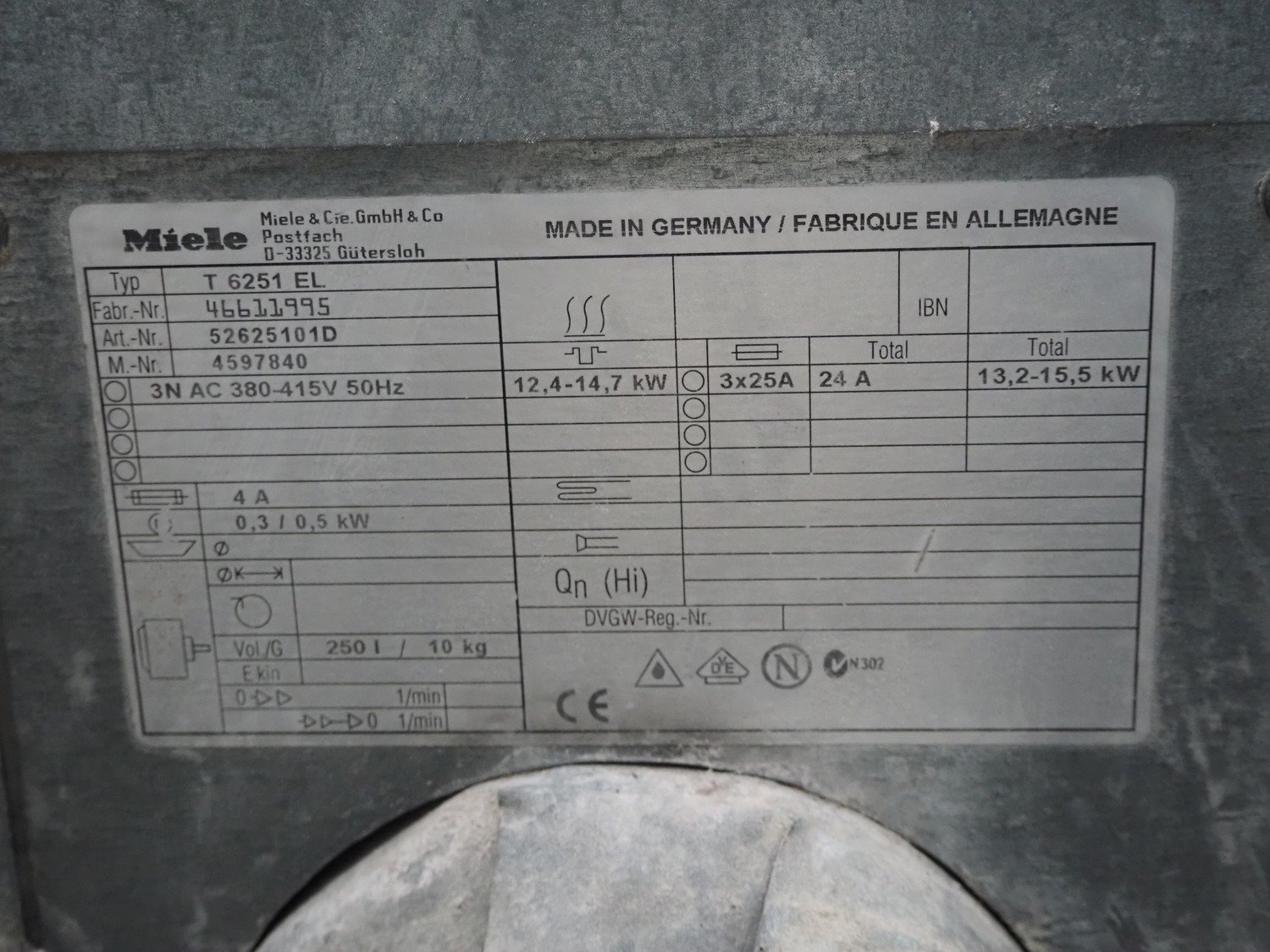 Miele dryer, type: T 6251 EL, fabrication number: 46611995, 380/415 V, 3 Ph, 50 Hz, 24 A, 13.2/15.5 kW, volume: 250 liter, dimensions: 900 mm x 820 mm x 1440 mm. Kavel locatie: Looyenbeemd 11, 5652 BH Eindhoven, Nederland
