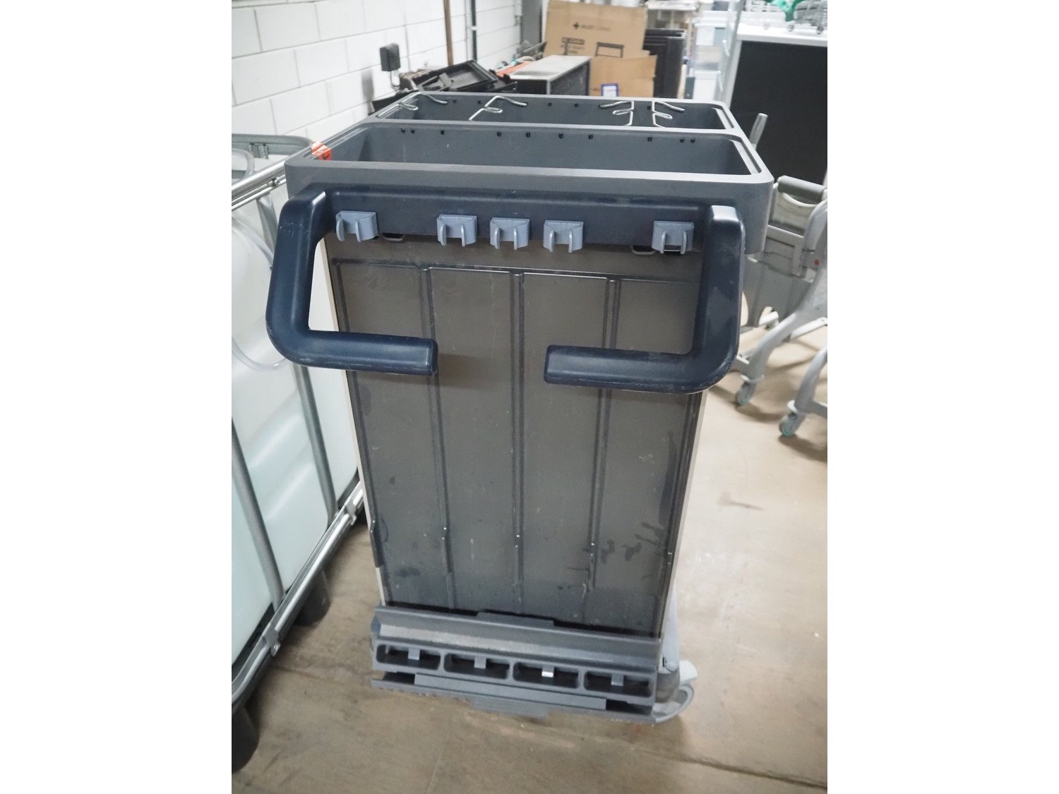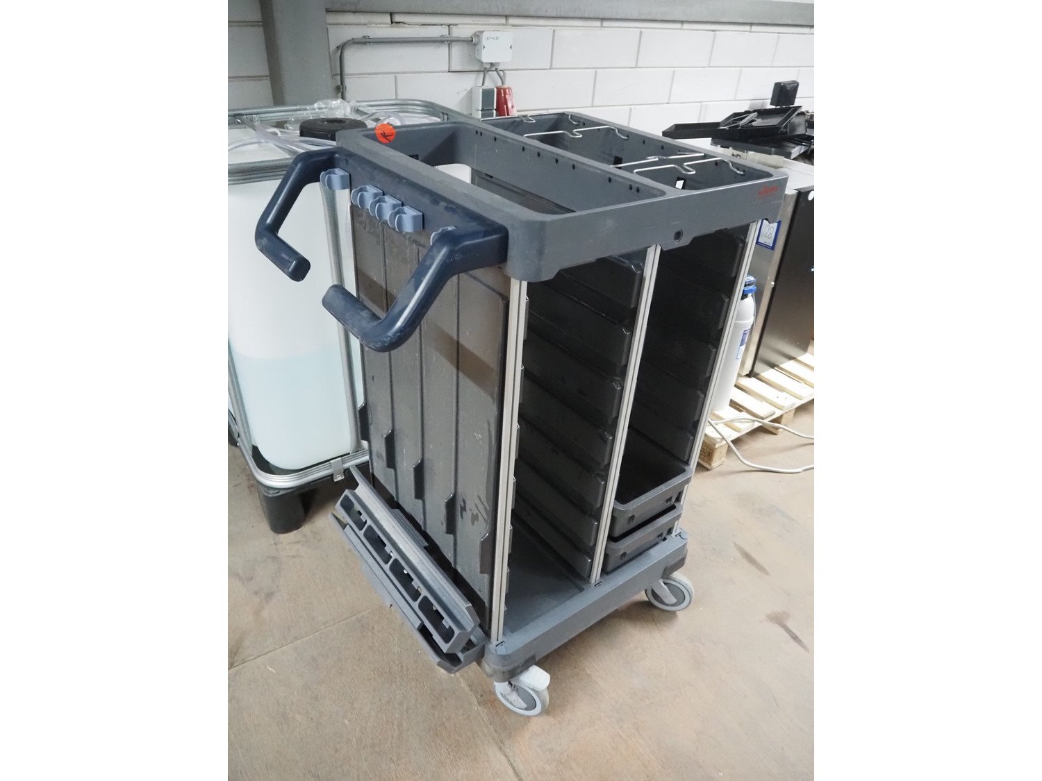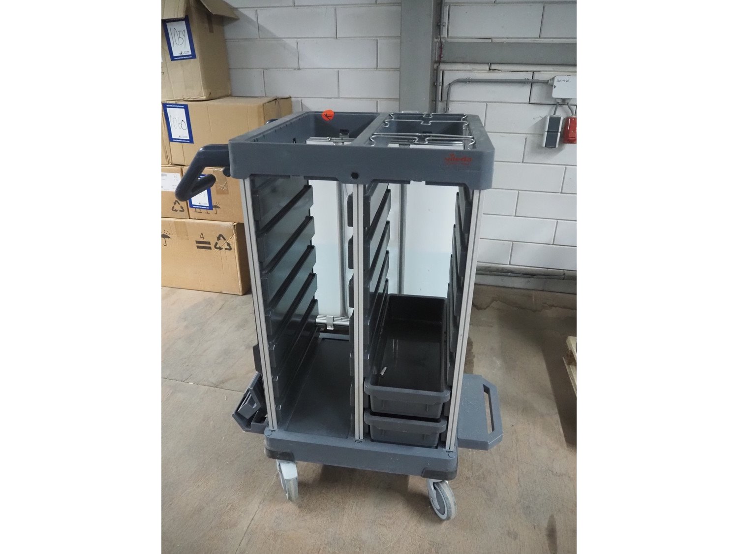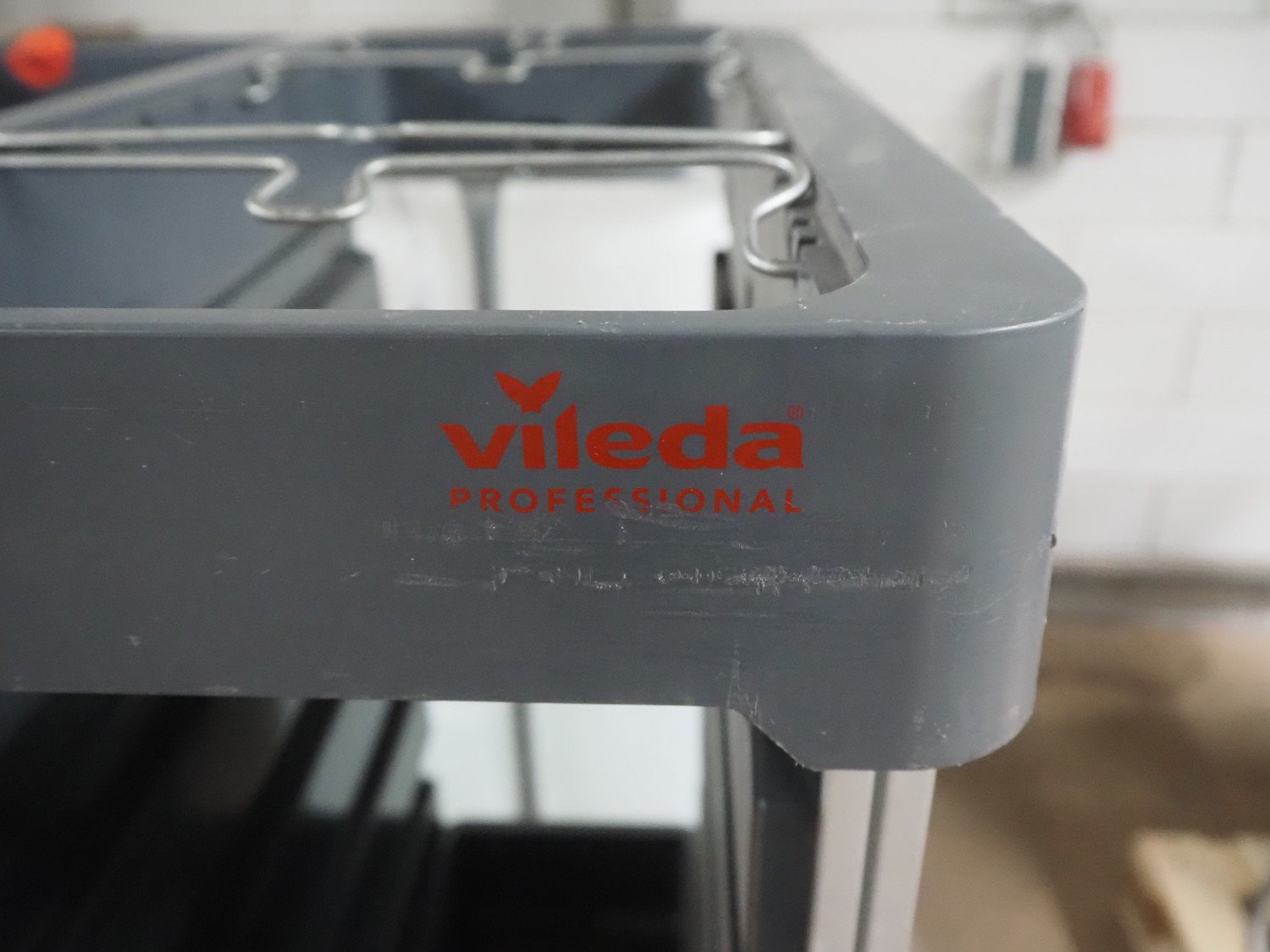 Vileda trolley, floor dimensions: 240 mm x 490 mm, 14 floors, total dimensions: 950 mm x 600 mm x 1100 mm. Kavel locatie: Looyenbeemd 11, 5652 BH Eindhoven, Nederland