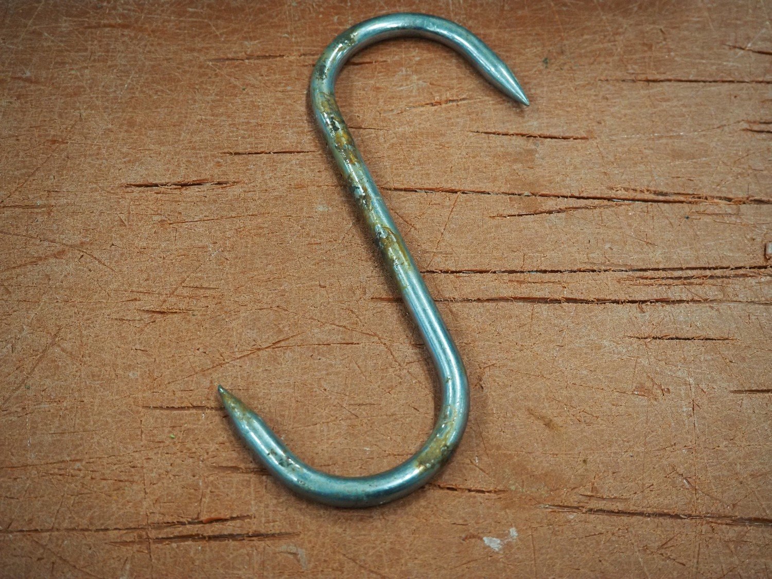 Plastic crate with s/s meat hooks, dimensions: 600 mm x 400 mm x 300 mm. Kavel locatie: Looyenbeemd 11, 5652 BH Eindhoven, Nederland
