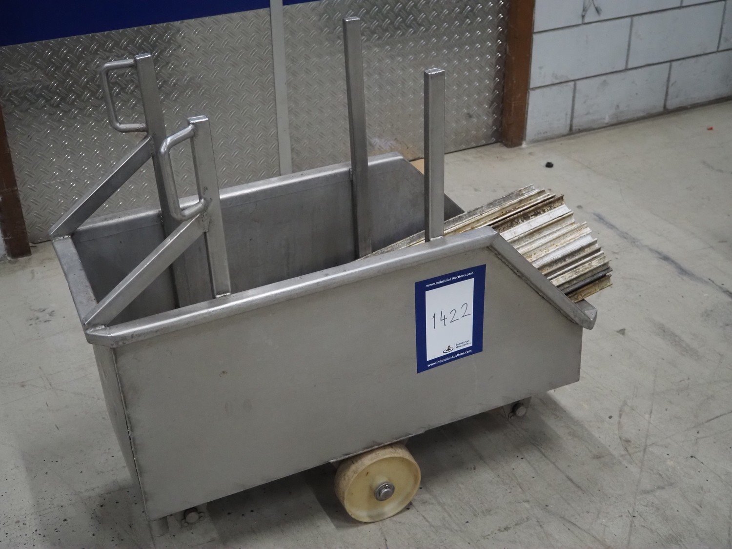 S/s trolley with large amount of Y-shaped smoke sticks, length each smoke stick: 1000 mm, total dimensions: 1000 mm x 420 mm x 900 mm. Kavel locatie: Looyenbeemd 11, 5652 BH Eindhoven, Nederland