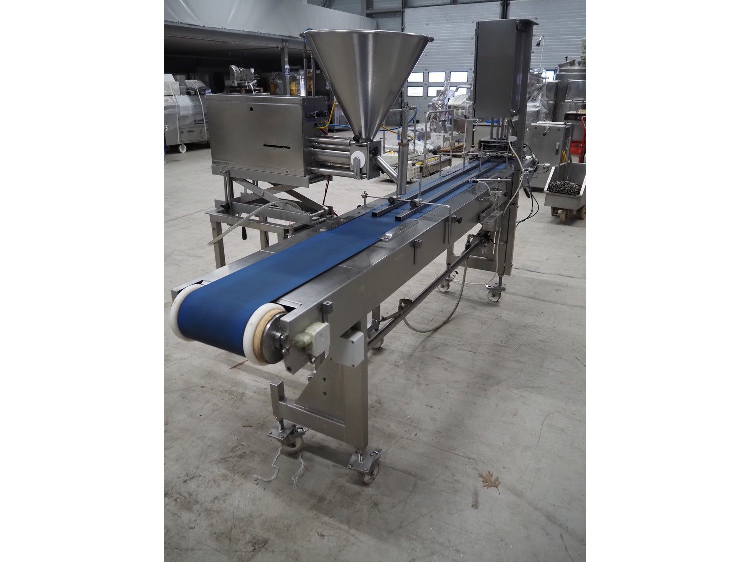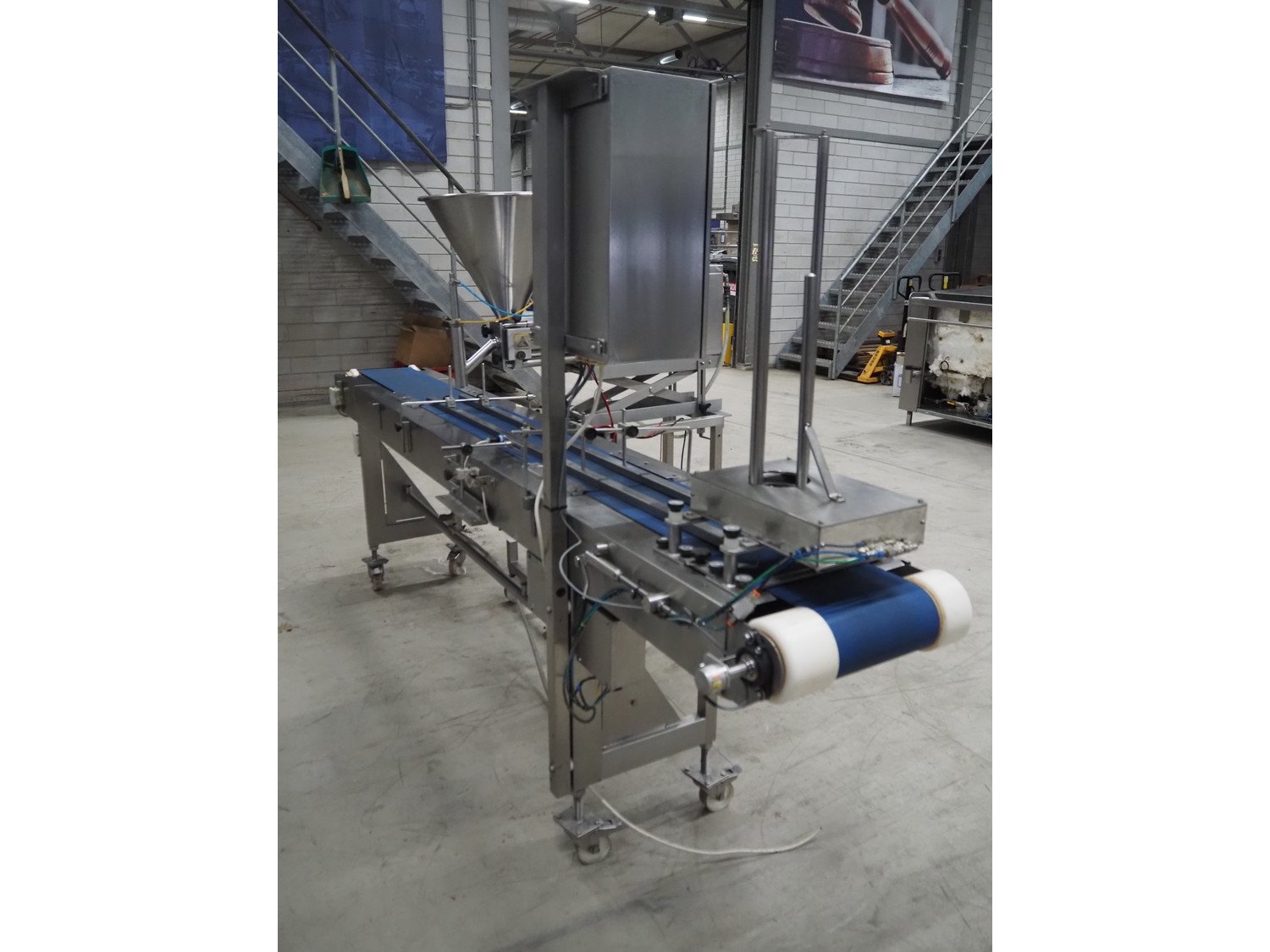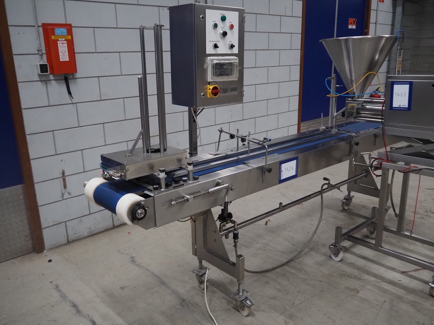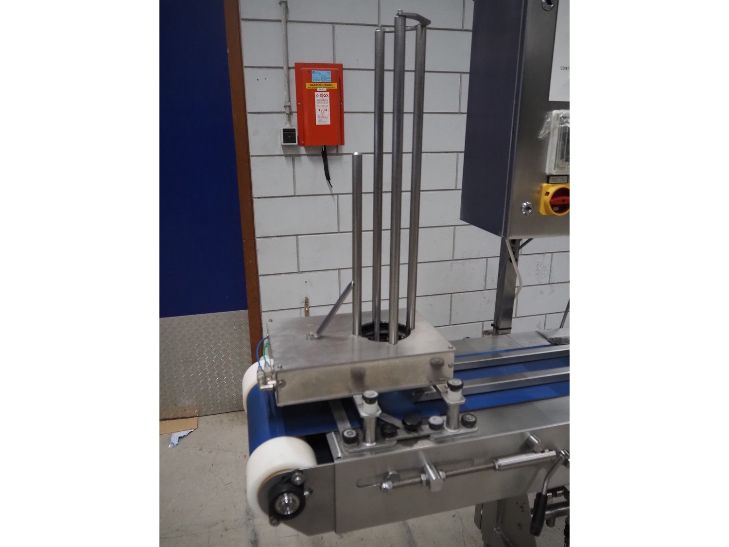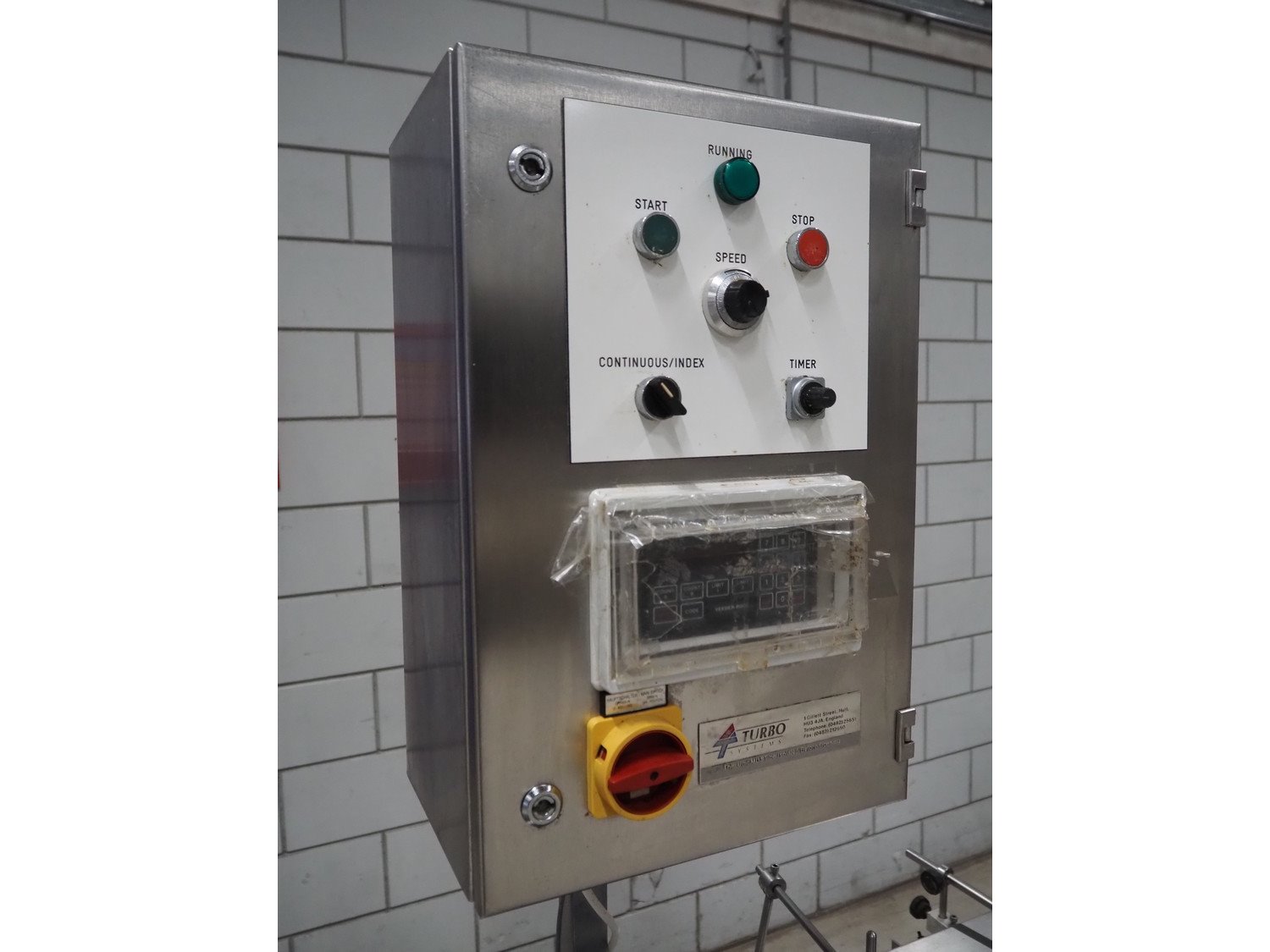 Turbo Systems Limited transport belt with denester, machine number: CONO32501, plastic belt, diameter cups: 115 mm, belt width: 240 mm, total dimensions: 3200 mm x 500 mm x 1800 mm. Kavel locatie: Looyenbeemd 11, 5652 BH Eindhoven, Nederland