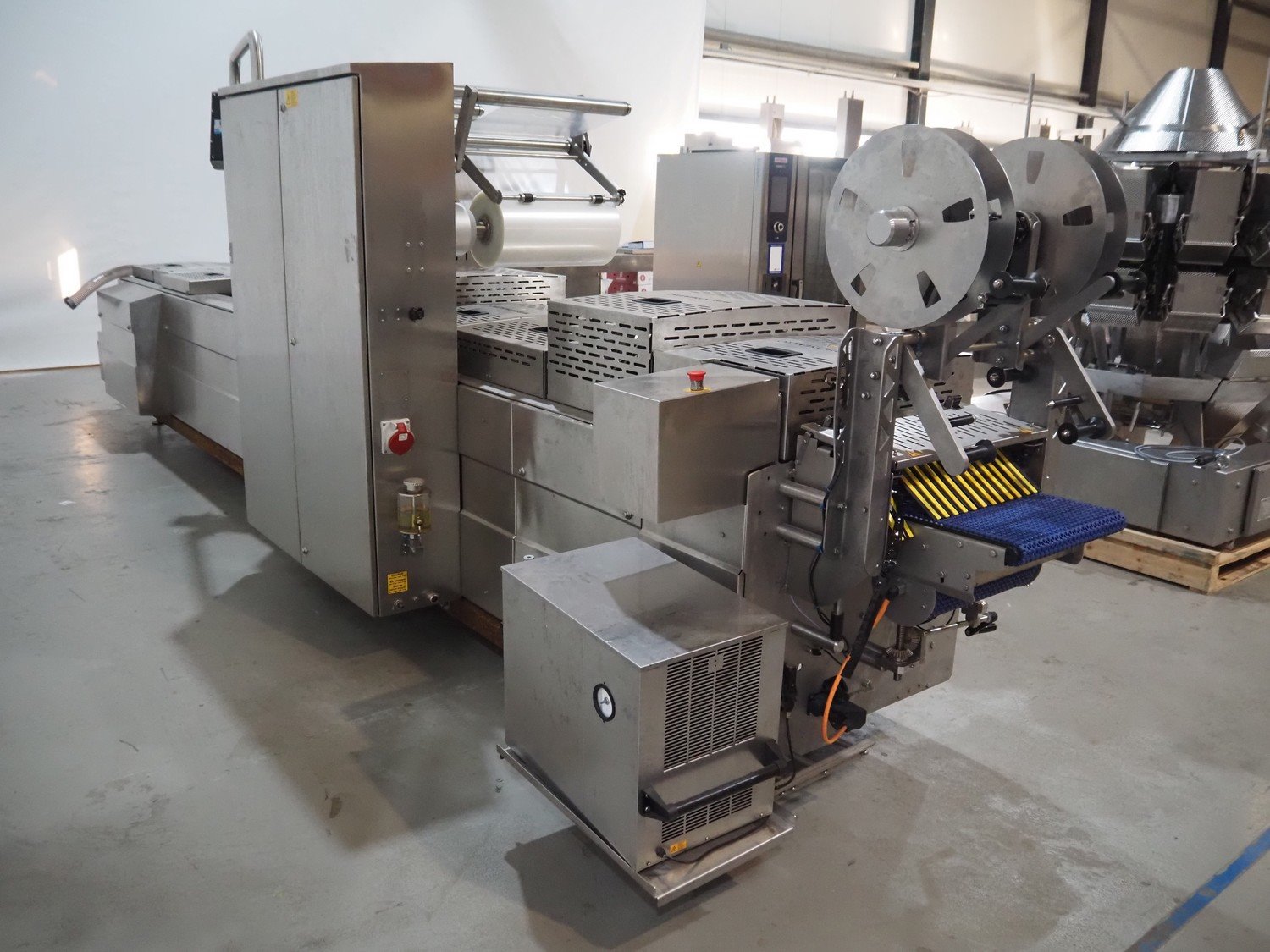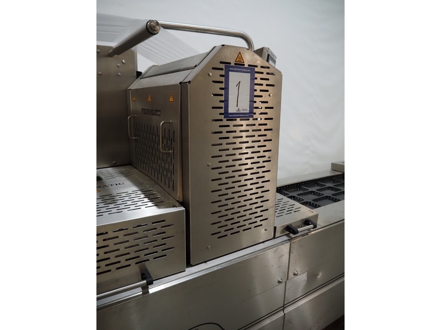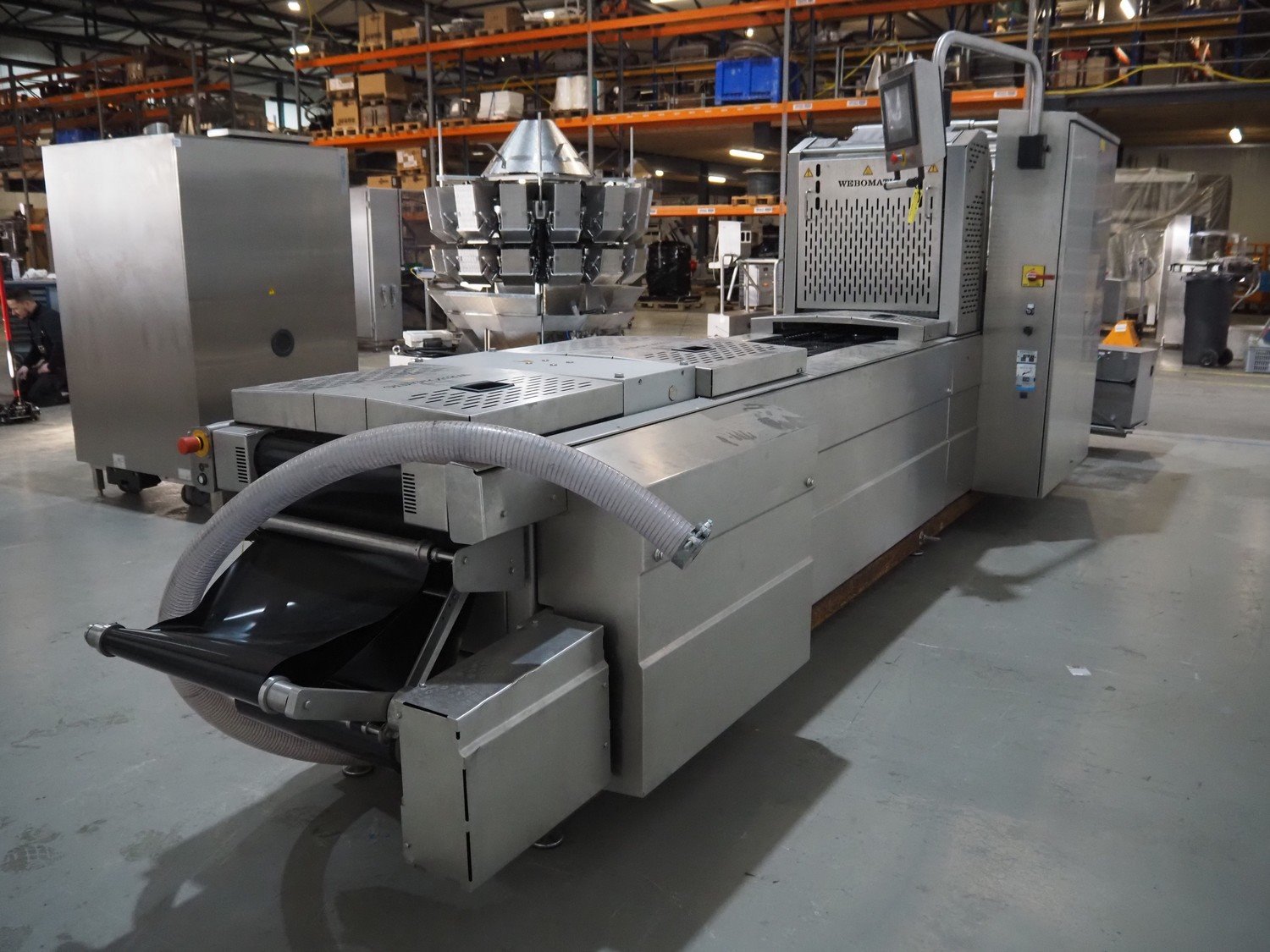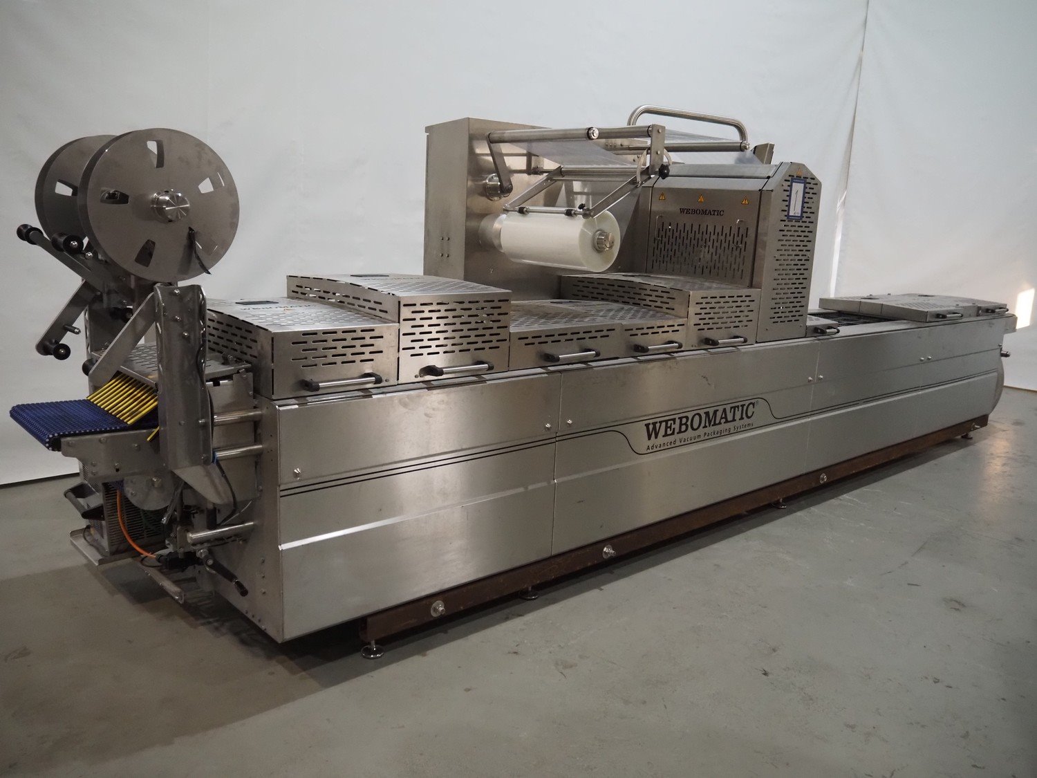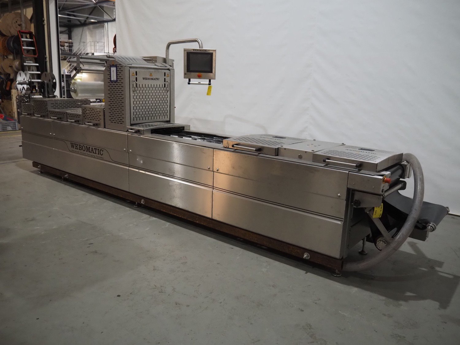 Webomatic thermoformer, type: ML-C 5600, machine number; G 6513-Z1D-149, 400 V, 3 Ph, 50 Hz, 30.9 kW, Busch vacuum pumps, film width: 460 mm, dimensions dye: (3x) 215 mm x 140 mm, plastic mesh outfeed belt, belt width: 400 mm, total dimensions: 6870 mm x 1200 mm x 2200 mm. Kavel locatie: Amfoor 6, 4421 SE Kapelle, Nederland