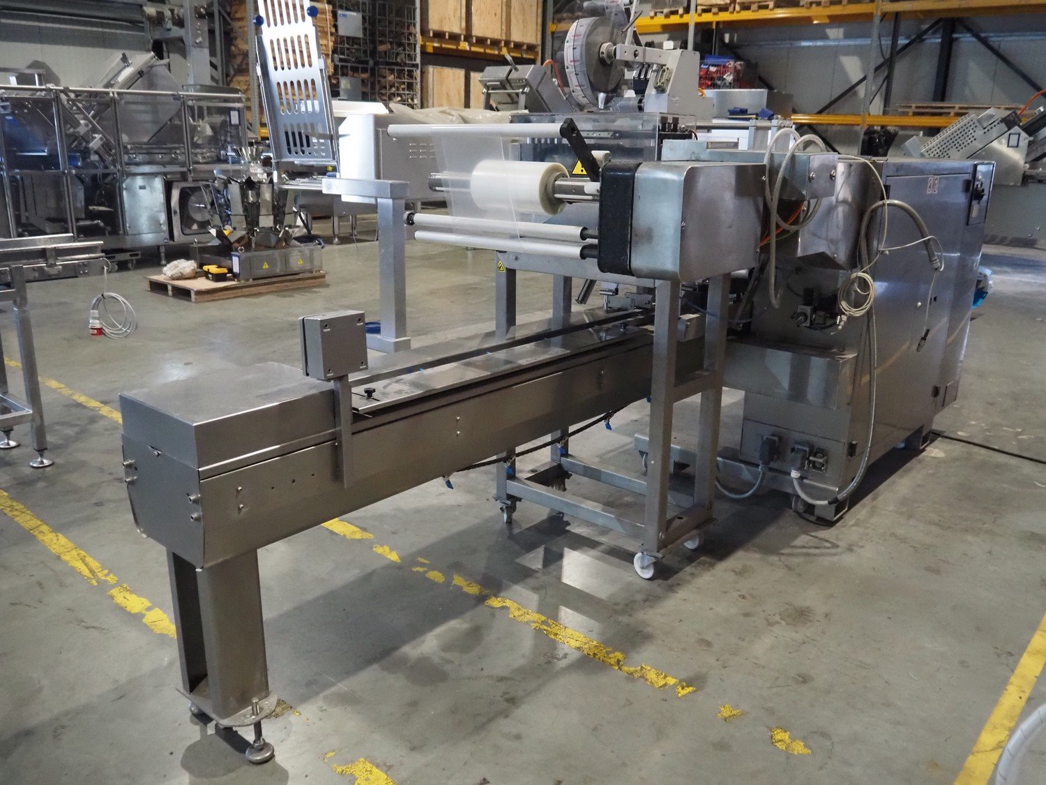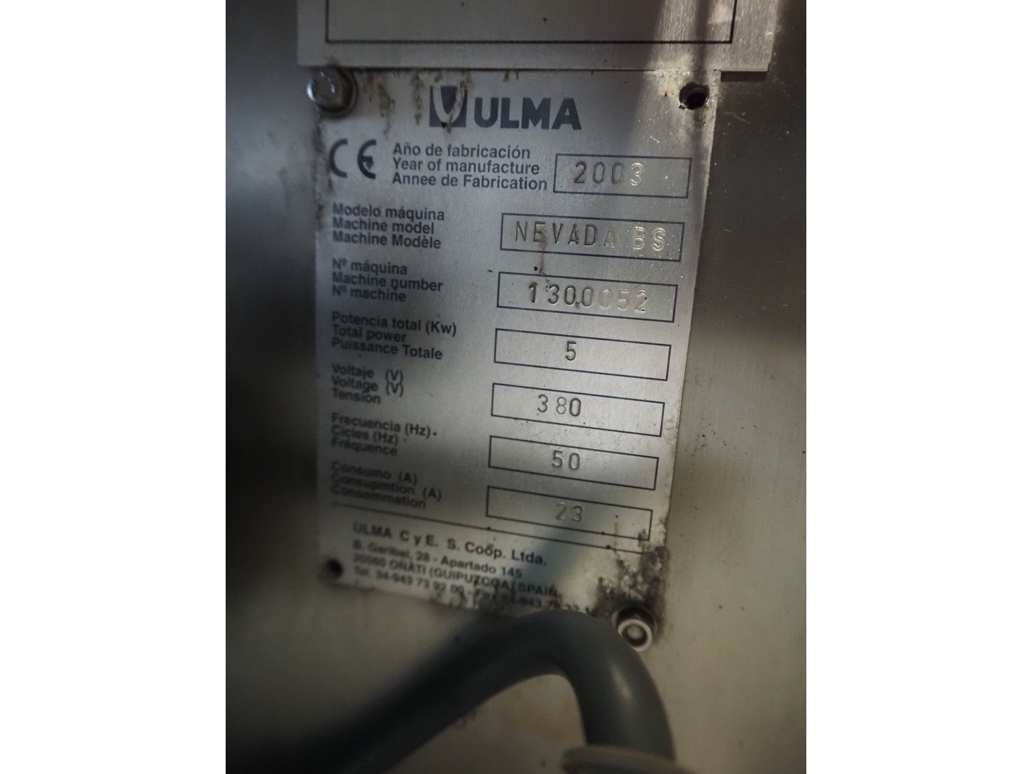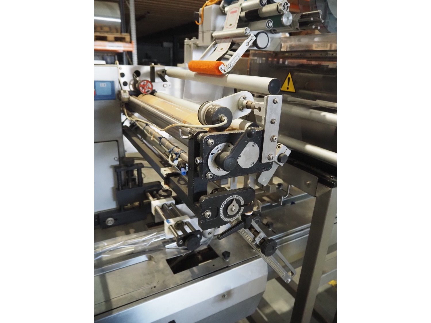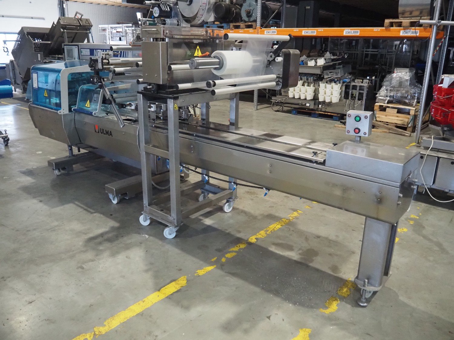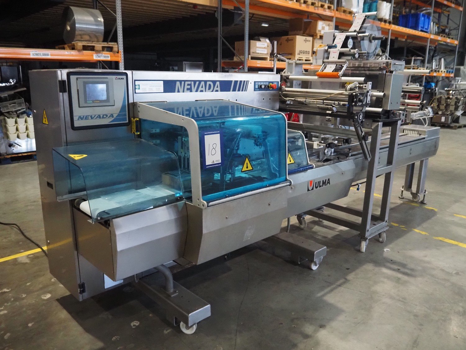 Ulma mobile flowpacker, model: Nevada BS, number: 1300052, year of construction: 2003, 380 V, 50 Hz, 23 A, 5 kW, ELS labelling machine, infeed belt with dividers, belt width: 150 mm, distance between dividers: 300 mm, divider height: 30 mm, seal width: 300 mm, plastic outfeed belt, belt width: 200 mm, total dimensions: 4500 mm x 1300 mm x 1150 mm. Kavel locatie: Amfoor 6, 4421 SE Kapelle, Nederland