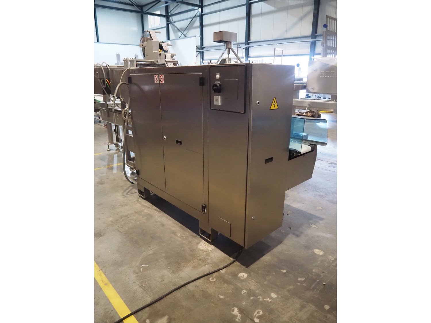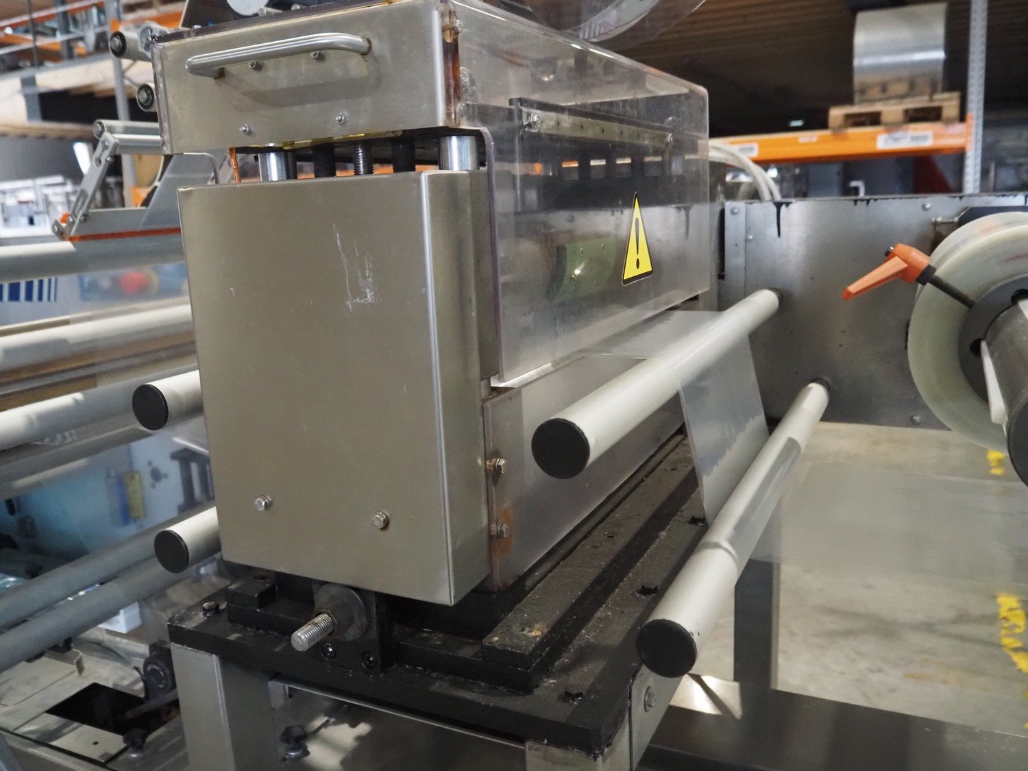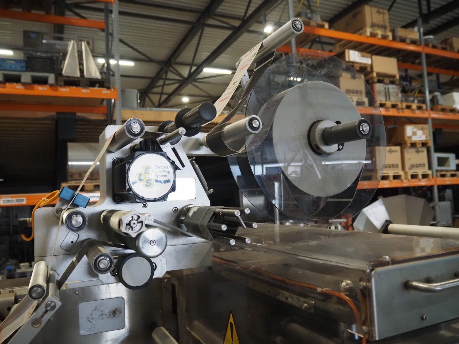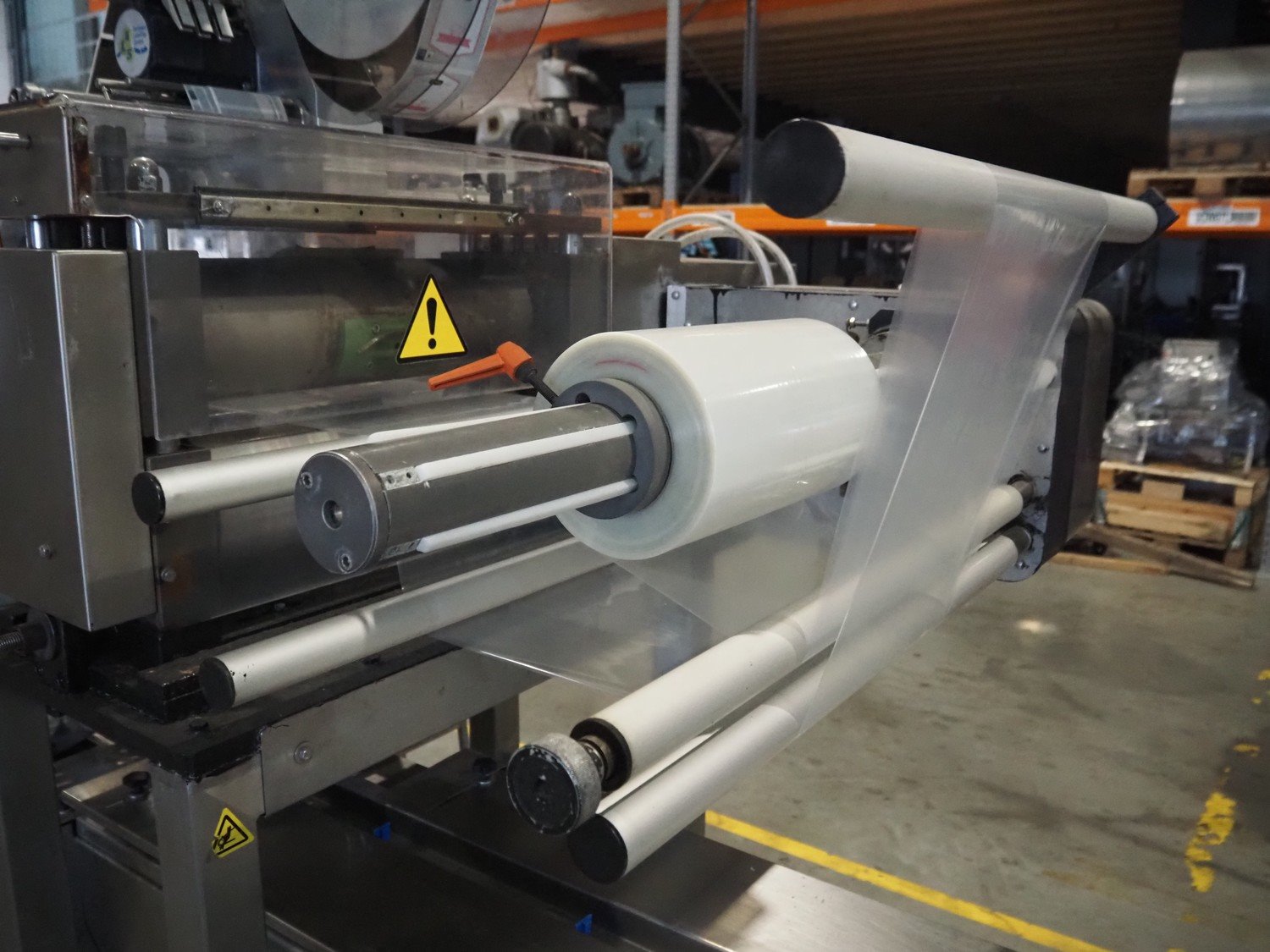 Ulma mobile flowpacker, model: Nevada BS, number: 1300052, year of construction: 2003, 380 V, 50 Hz, 23 A, 5 kW, ELS labelling machine, infeed belt with dividers, belt width: 150 mm, distance between dividers: 300 mm, divider height: 30 mm, seal width: 300 mm, plastic outfeed belt, belt width: 200 mm, total dimensions: 4500 mm x 1300 mm x 1150 mm. Kavel locatie: Amfoor 6, 4421 SE Kapelle, Nederland