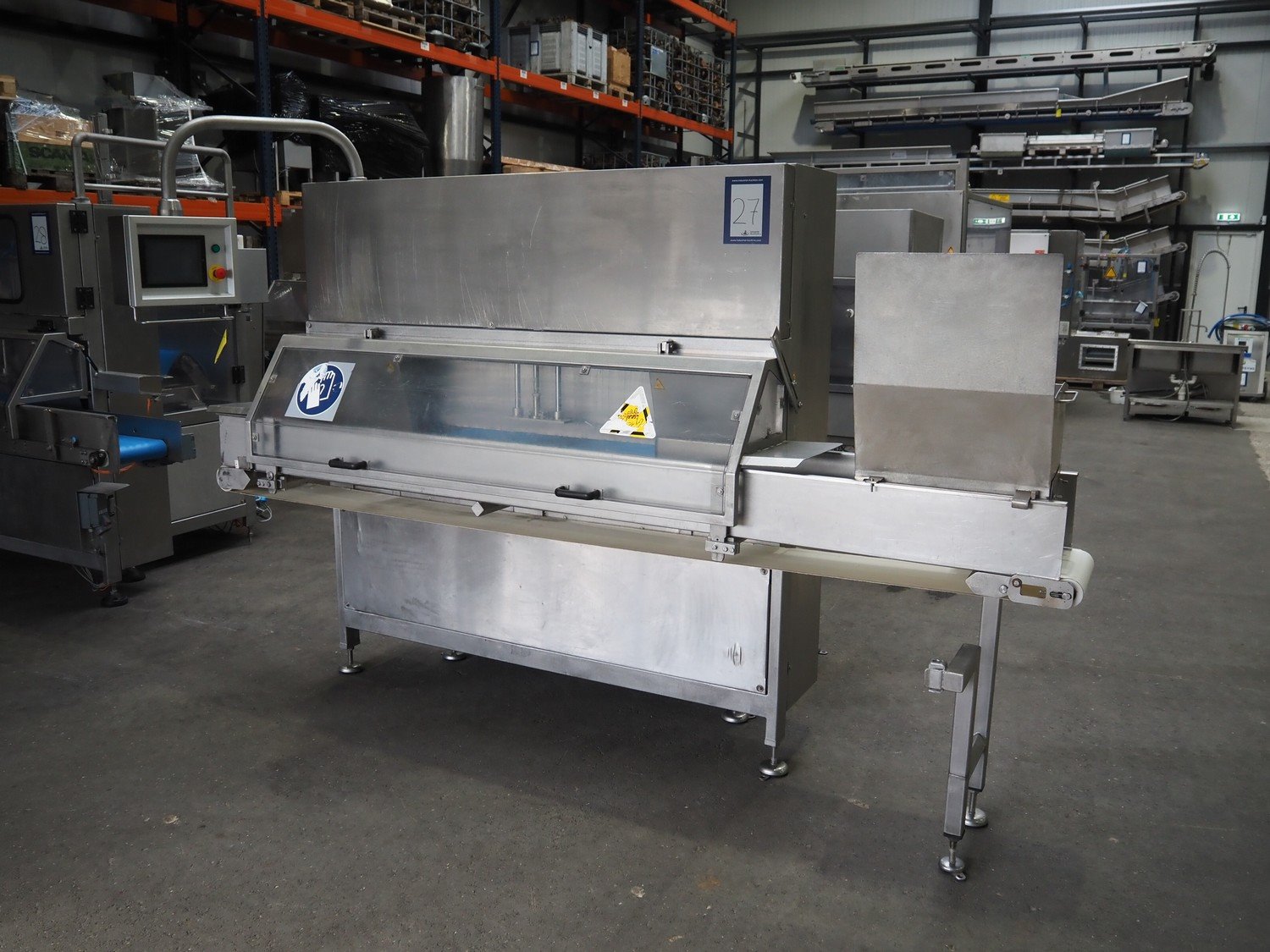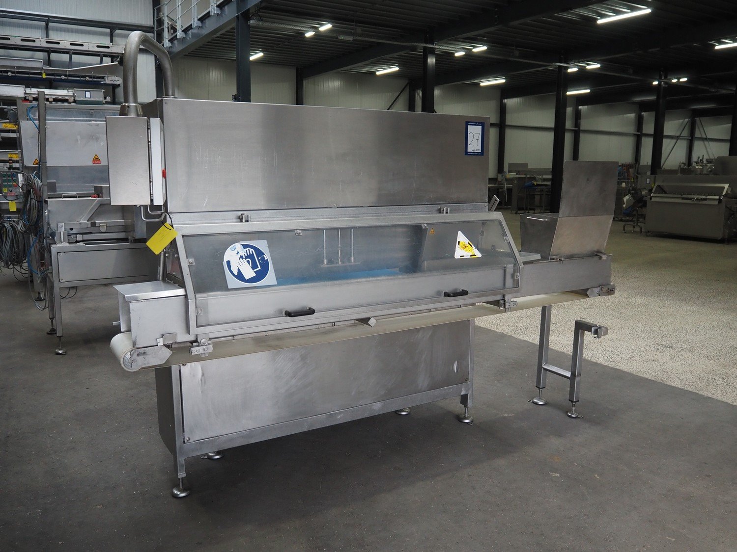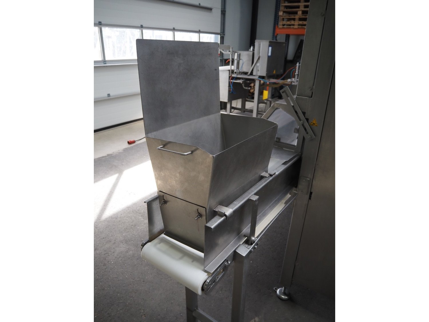 Portioning machine, plastic belt, belt width: (1x) 1000 mm and (1x) 300 mm, clearance: 1260 mm x 420 mm, knive width: 1200 mm, total dimensions: 2100 mm x 3060 mm x 2200 mm. Kavel locatie: Amfoor 6, 4421 SE Kapelle, Nederland