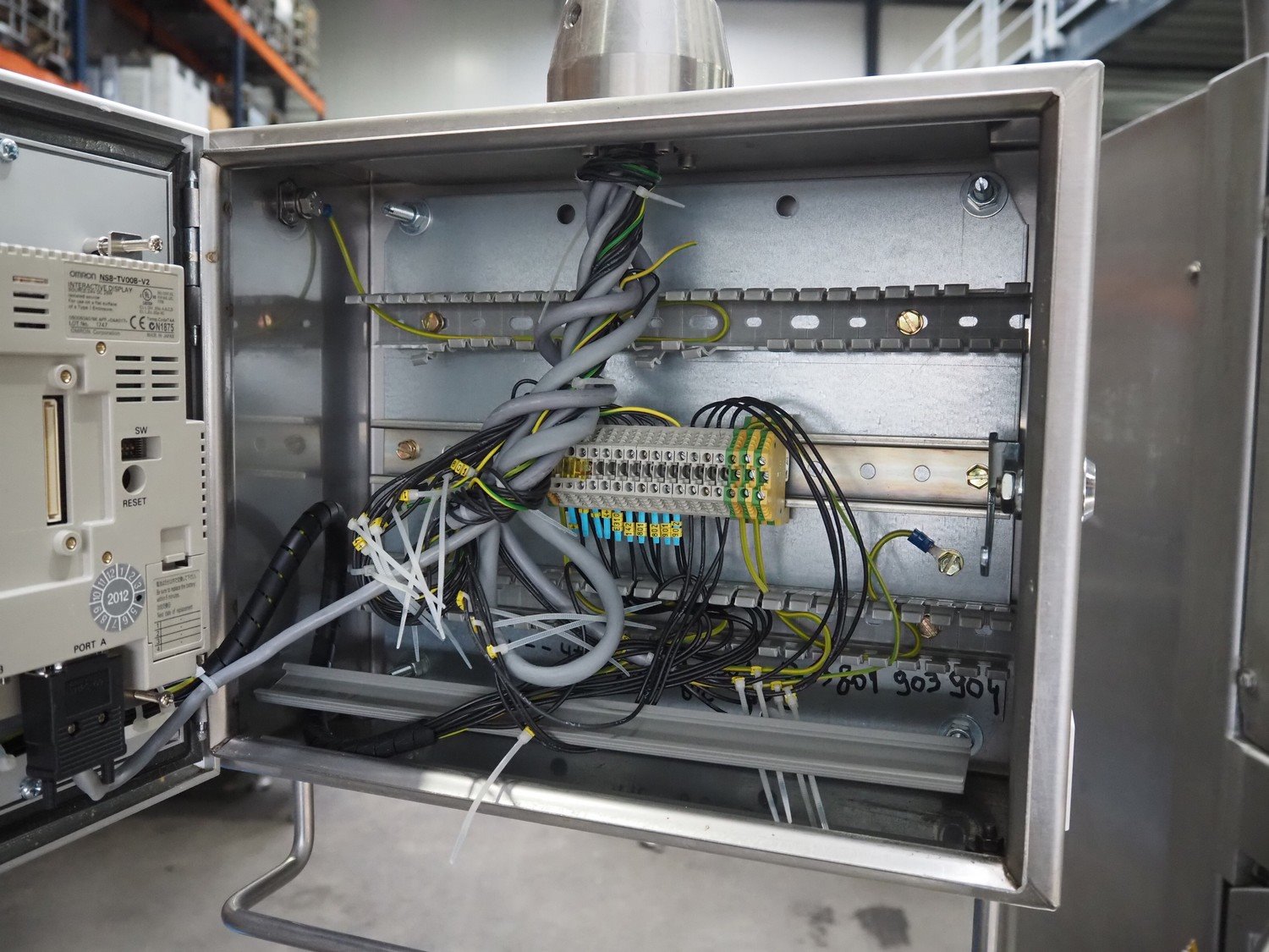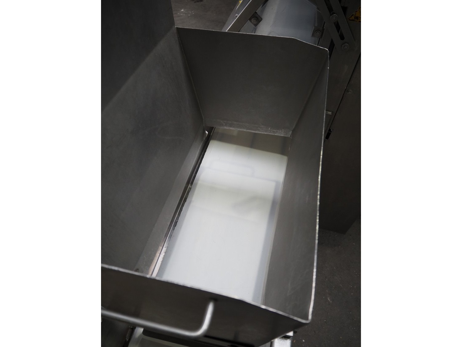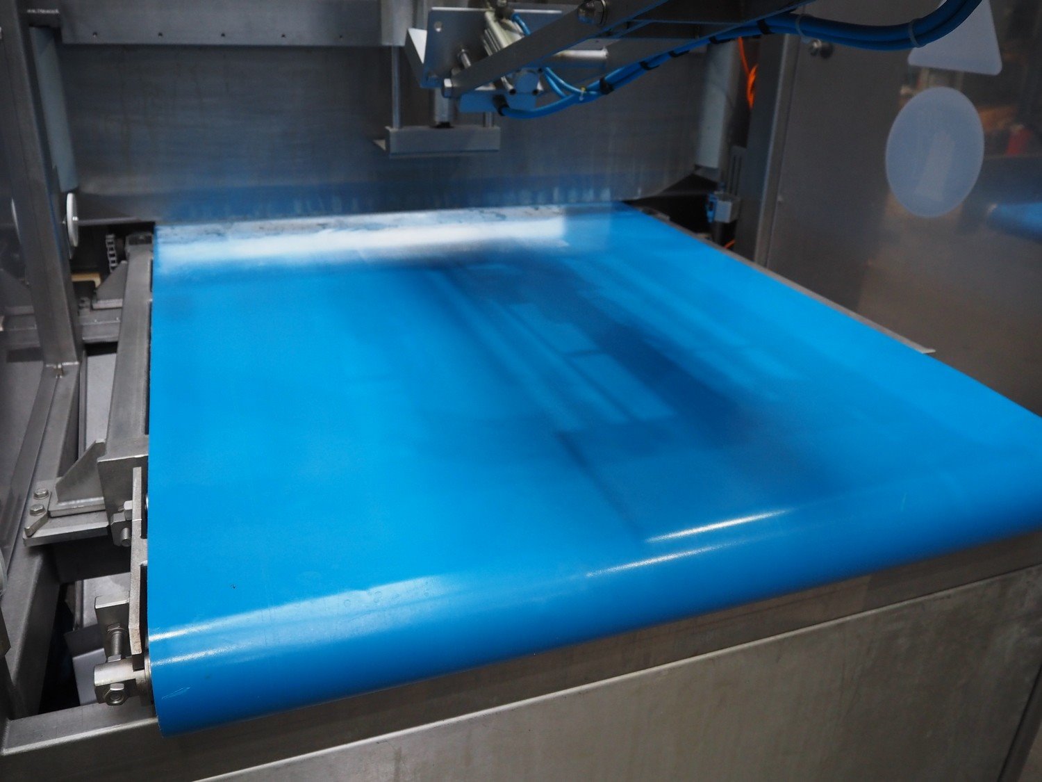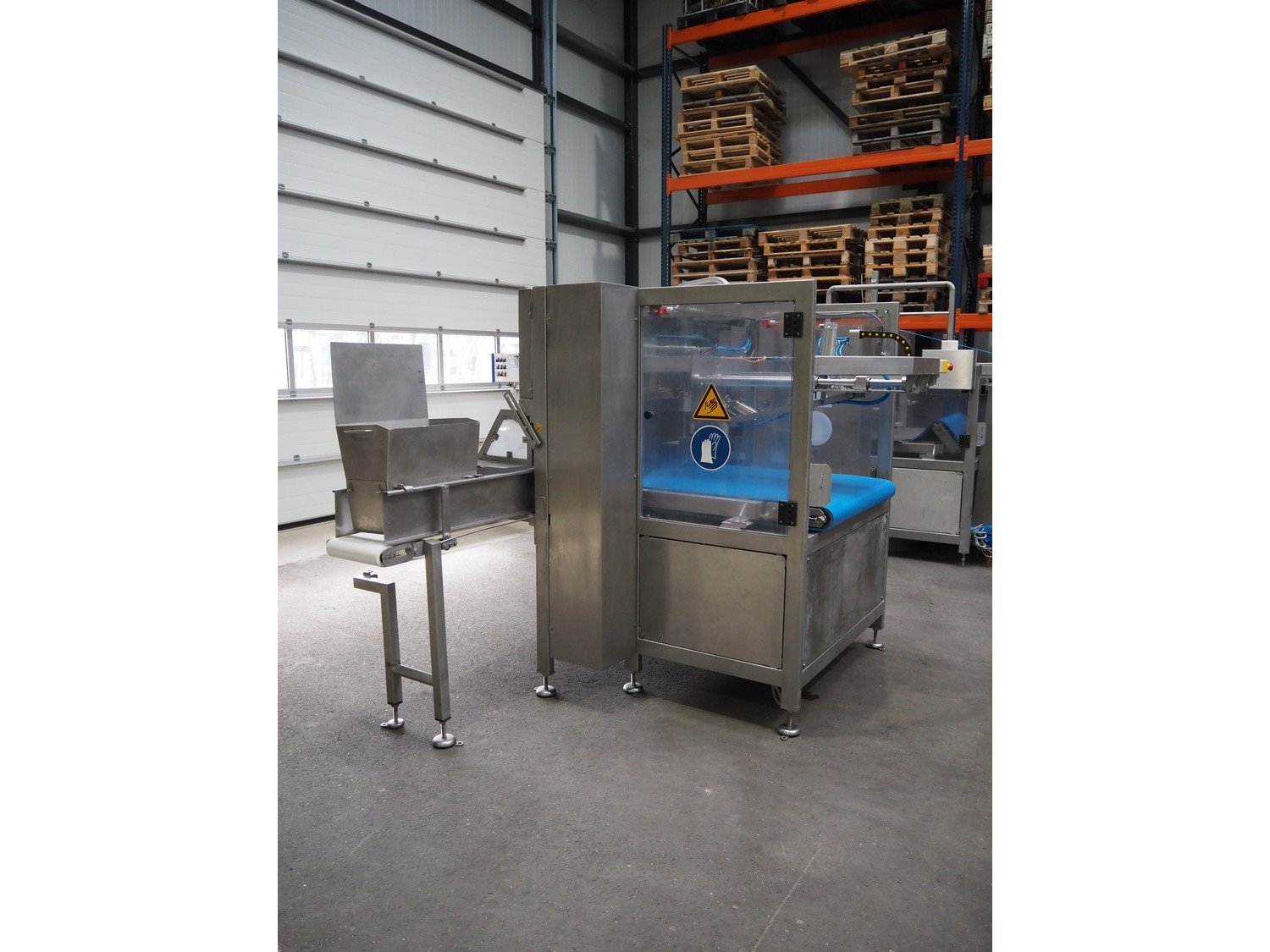 Portioning machine, plastic belt, belt width: (1x) 1000 mm and (1x) 300 mm, clearance: 1260 mm x 420 mm, knive width: 1200 mm, total dimensions: 2100 mm x 3060 mm x 2200 mm. Kavel locatie: Amfoor 6, 4421 SE Kapelle, Nederland