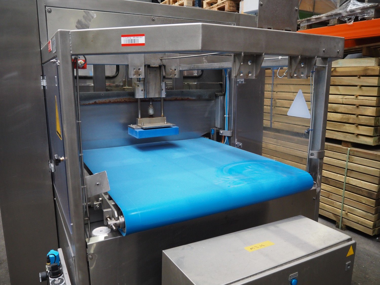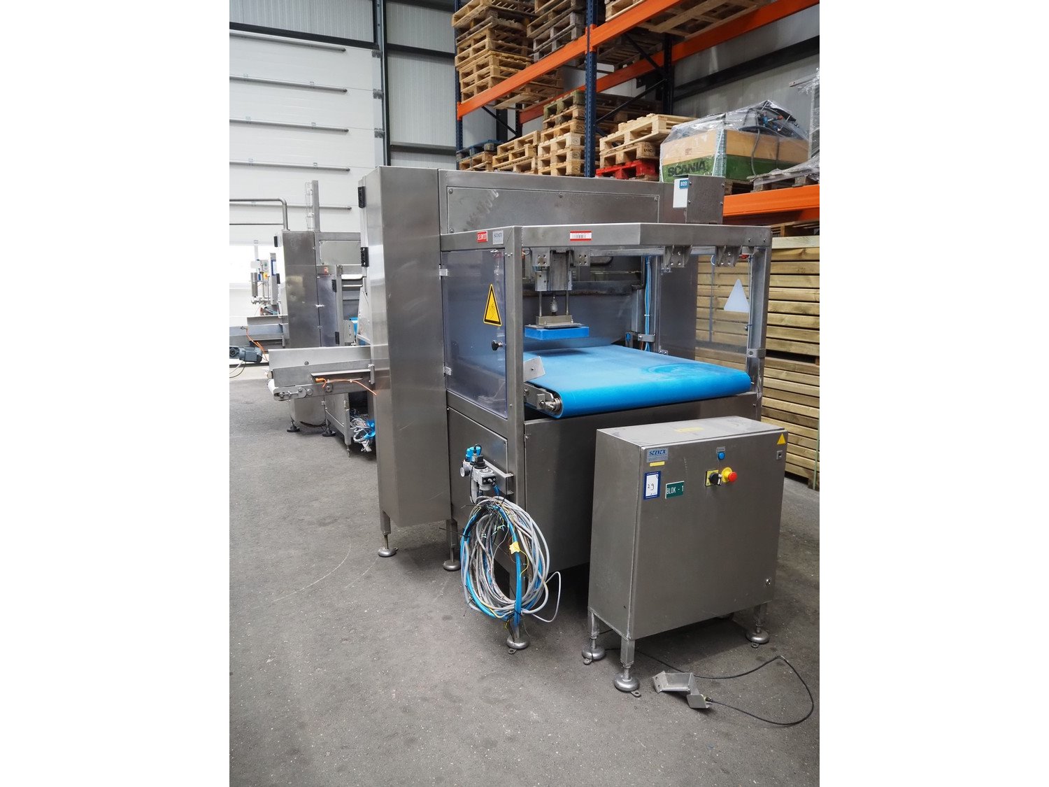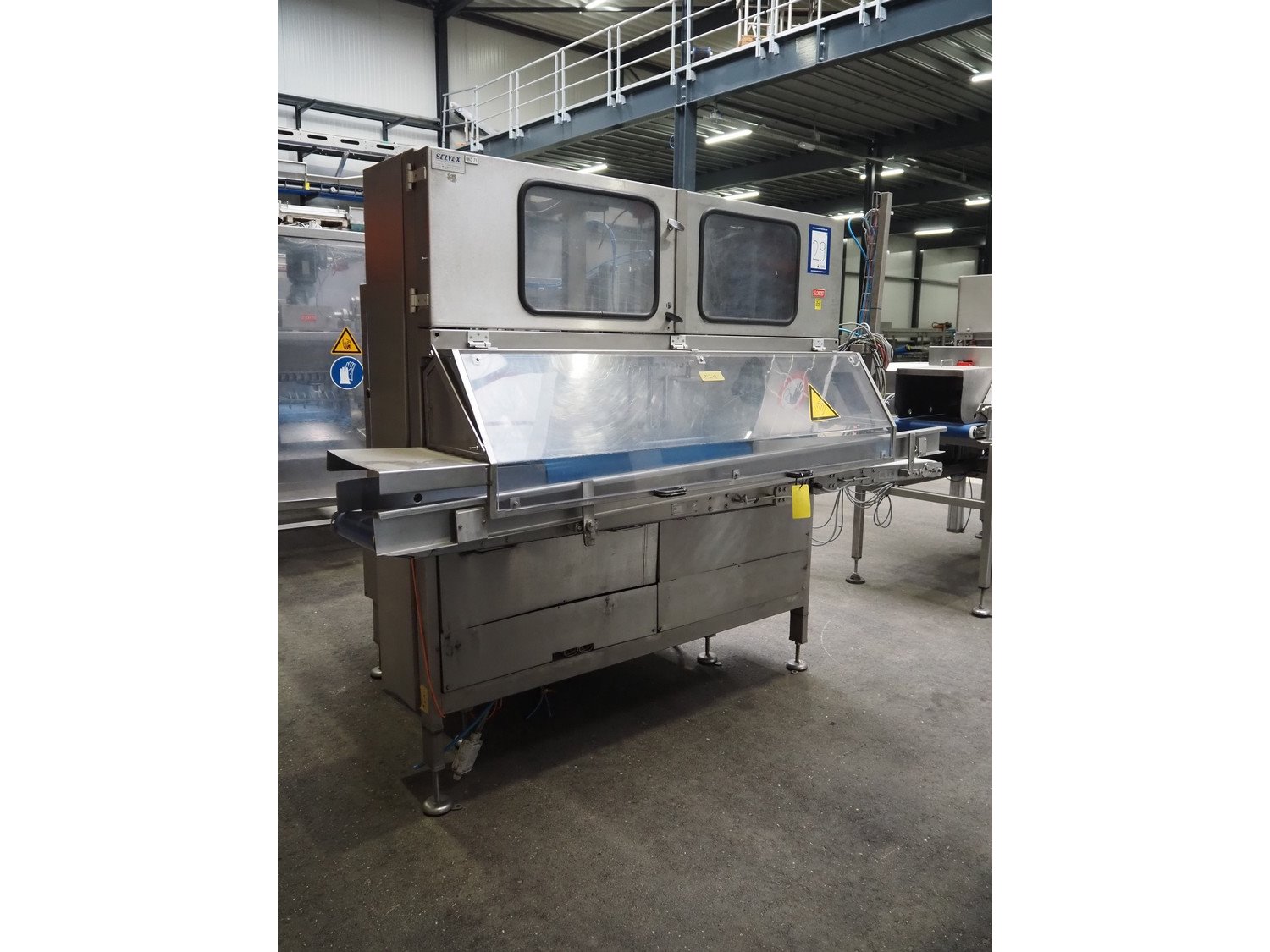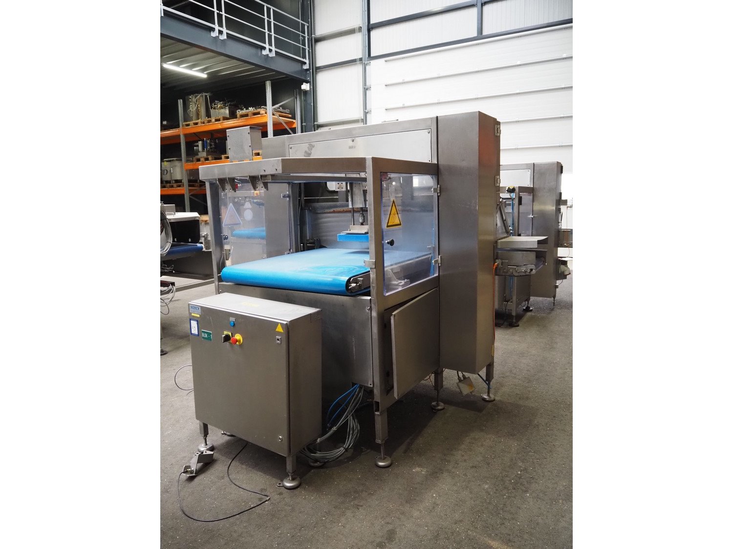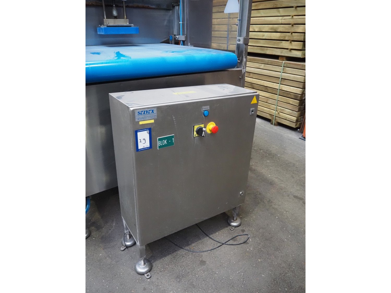 Selvex SA portioning machine, number: COL21-2, year of construction: 2002, 400 V, 3 Ph, 7 kW, infeed plastic belt, belt width: 1010 mm, clearance: 1230 mm x 500 mm, knive width: (1x) 1060 mm (1x) 340 mm, plastic belt, belt width: 290 mm, total dimensions: 2660 mm x 2010 mm x 2070 mm. Including s/s switch cabinet, dimensions switch cabinet: 760 mm x 340 mm x 980 mm. Kavel locatie: Amfoor 6, 4421 SE Kapelle, Nederland