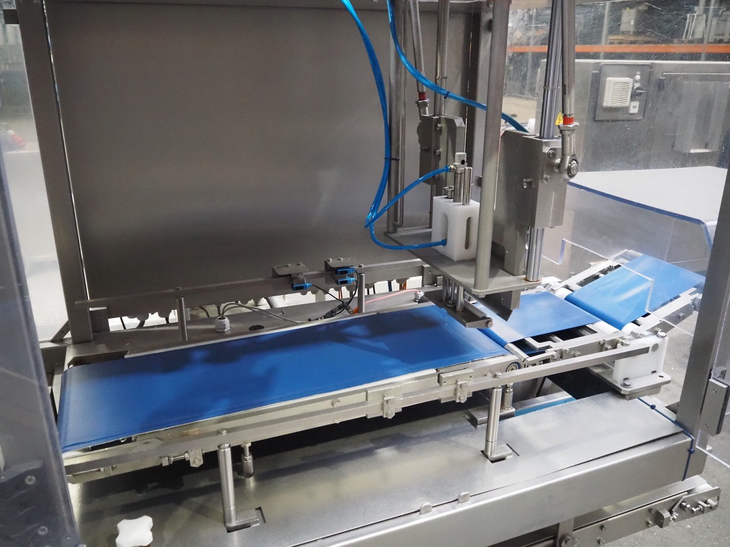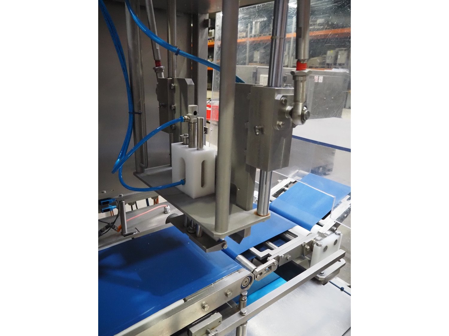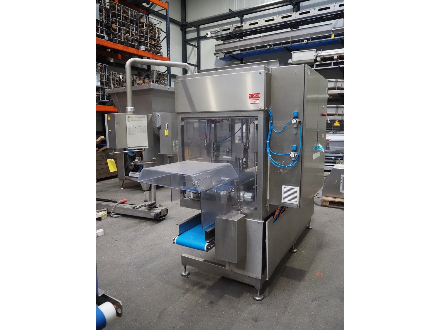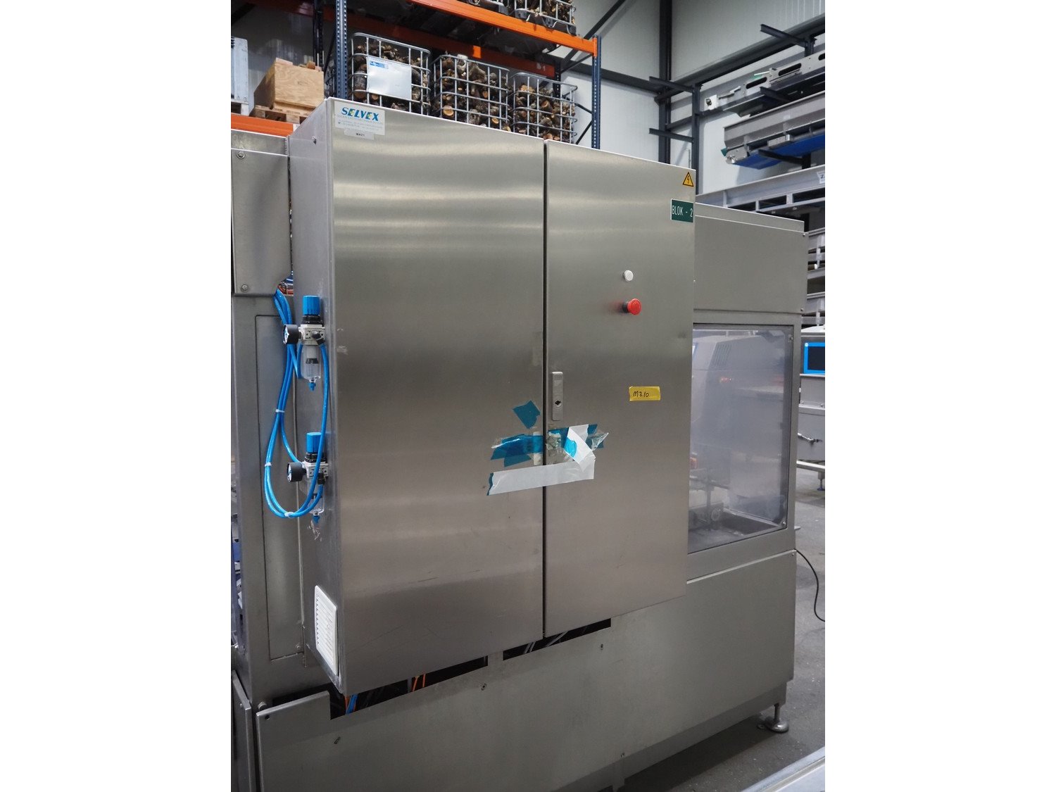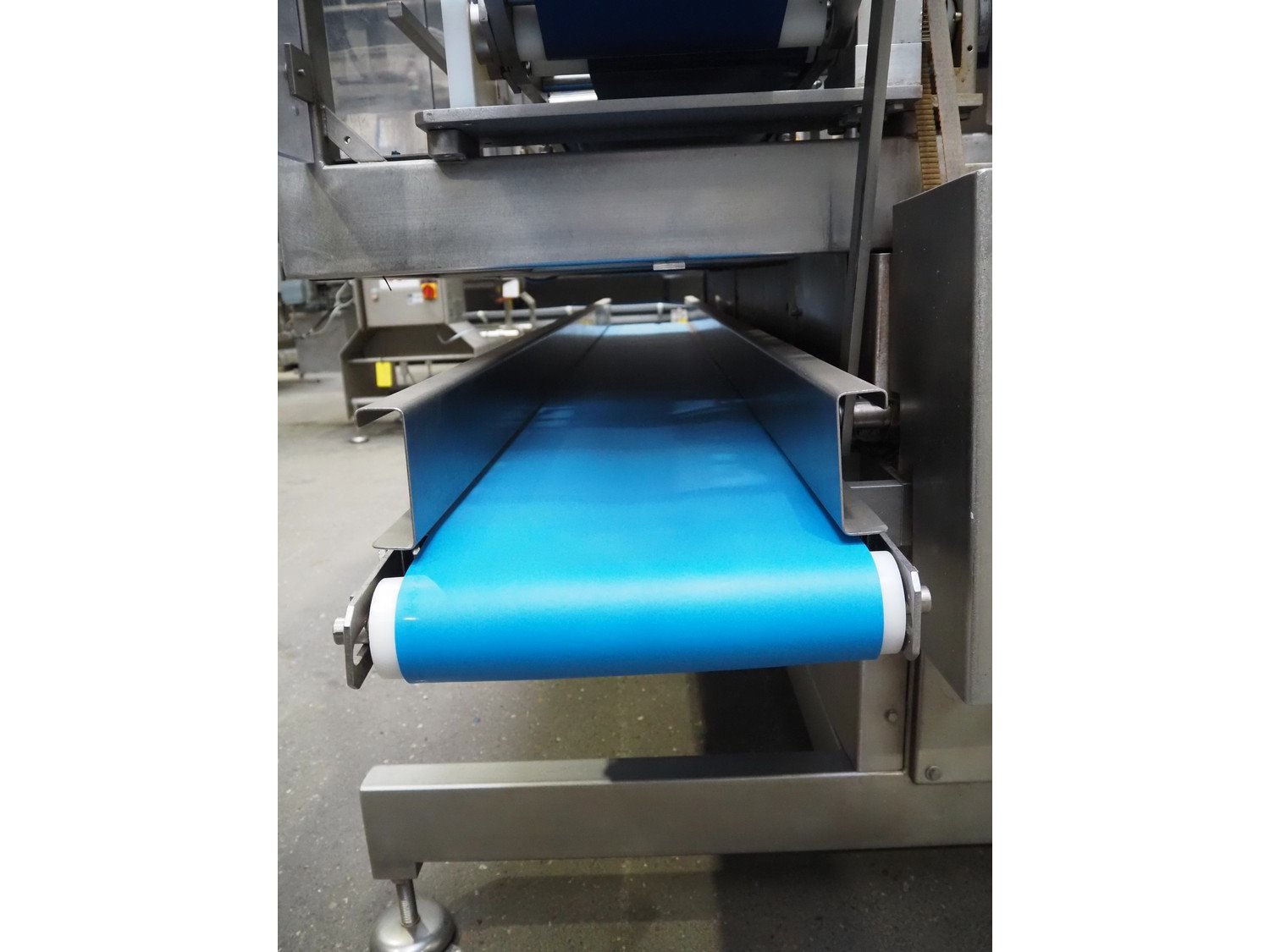 Selvex SA portioning machine with ejector, plastic belt, belt width: 270 mm and 310 mm, clearance: 410 mm x 150 mm, plastic rollers, roller width: 350 mm, knive width: 270 mm, total dimensions: 3650 mm x 1300 mm x 2220 mm. Kavel locatie: Amfoor 6, 4421 SE Kapelle, Nederland