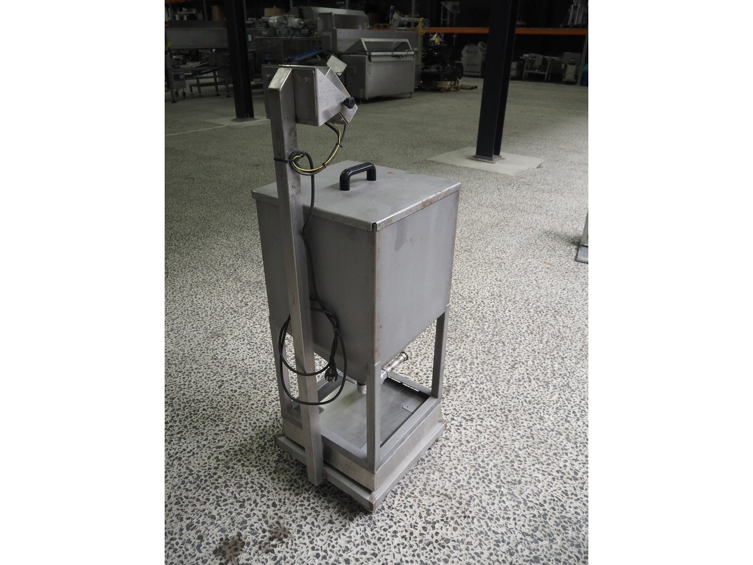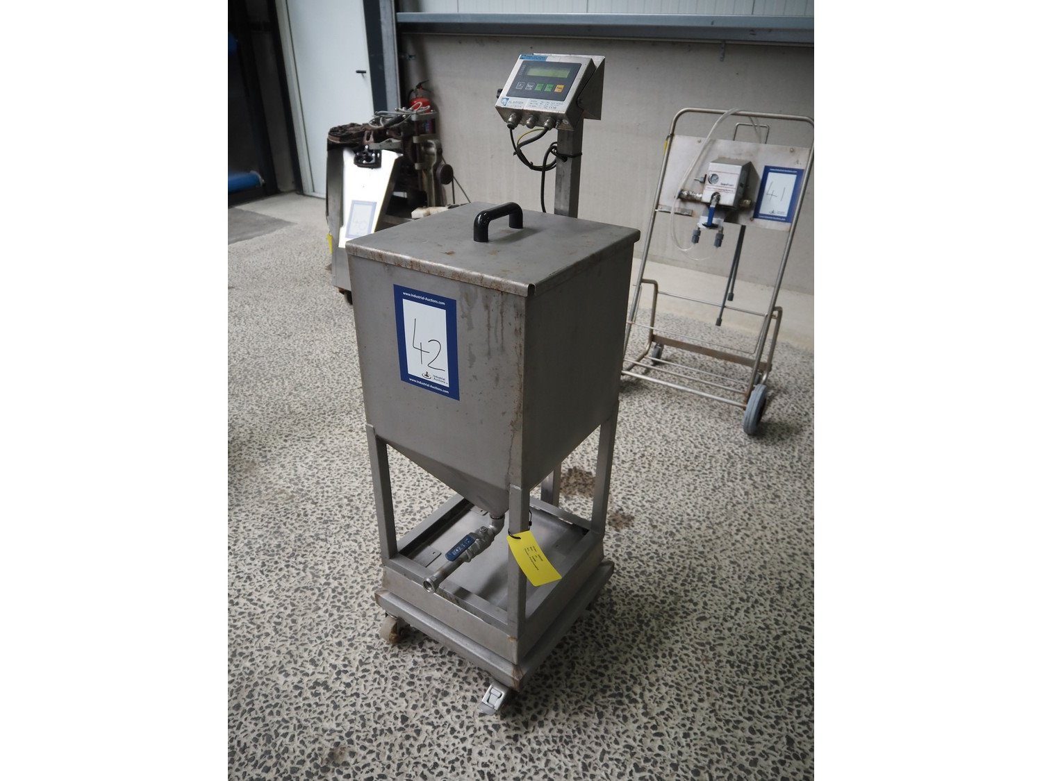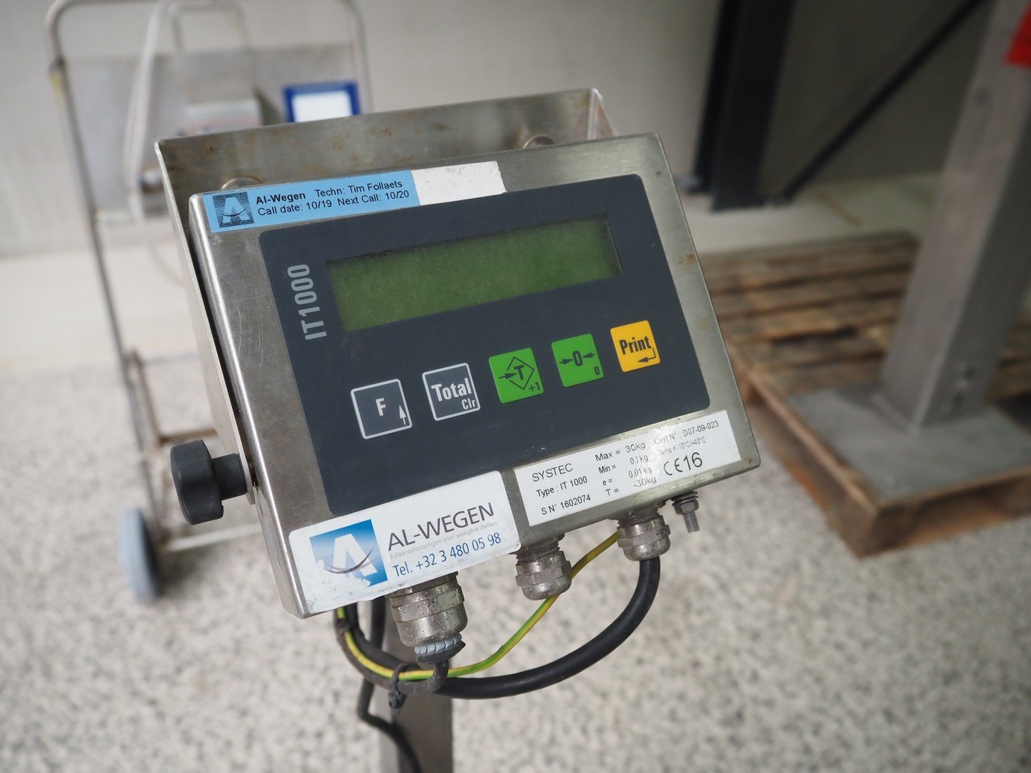 Systec mobile weighing scale with tub, type: IT 1000, serial number: 1602074, maximum weight: 30 kg, minimum weight: 0.2 kg, e=- 0.01 kg, T = -30kg, inside dimensions tub: 380 mm x 380 mm x 420 mm, total dimensions: 520 mm x 420 mm x 1370 mm. Kavel locatie: Amfoor 6, 4421 SE Kapelle, Nederland