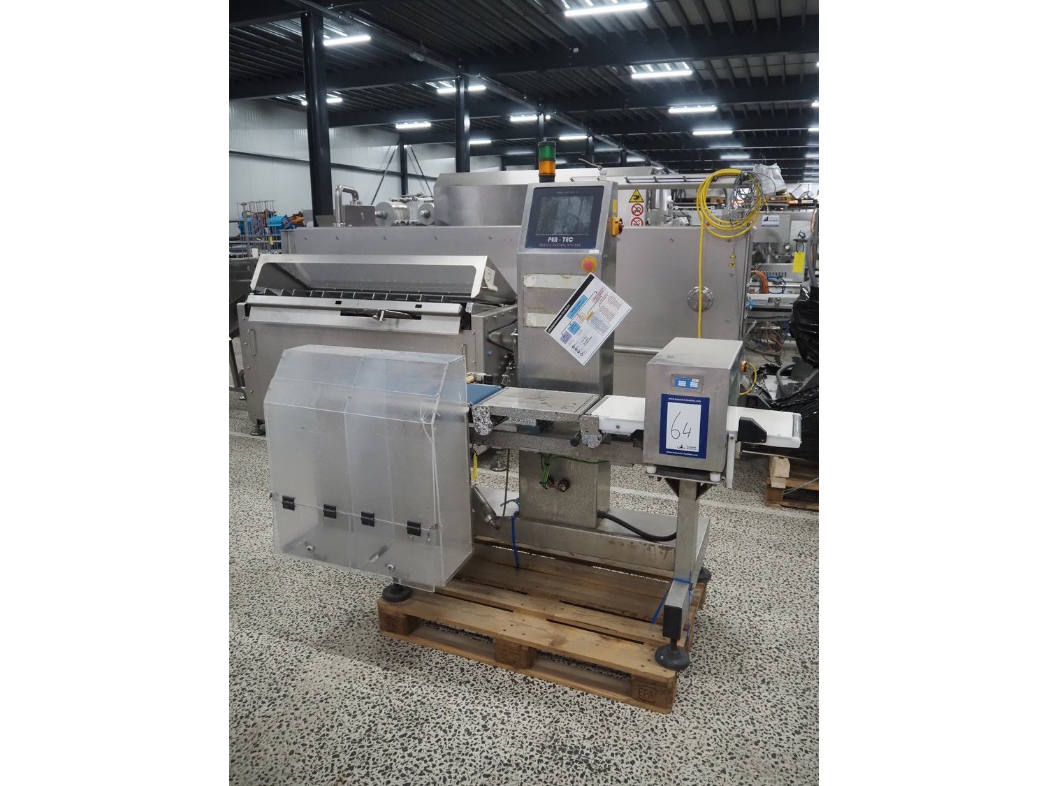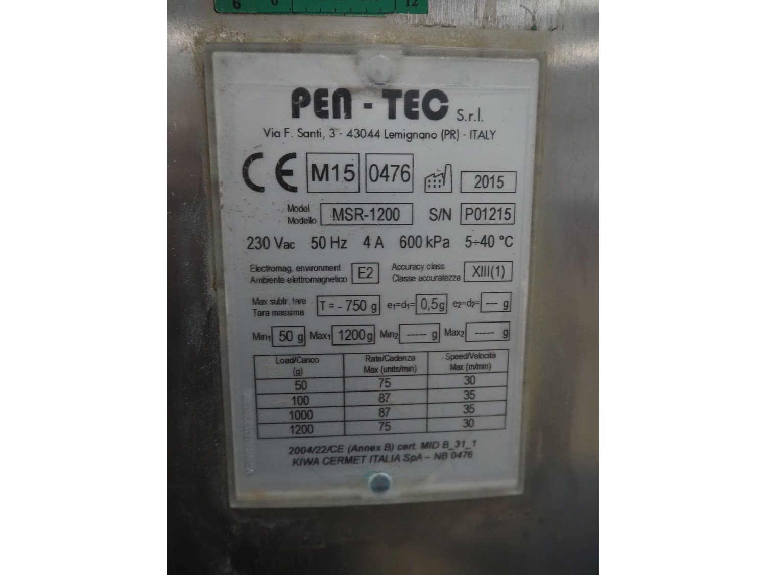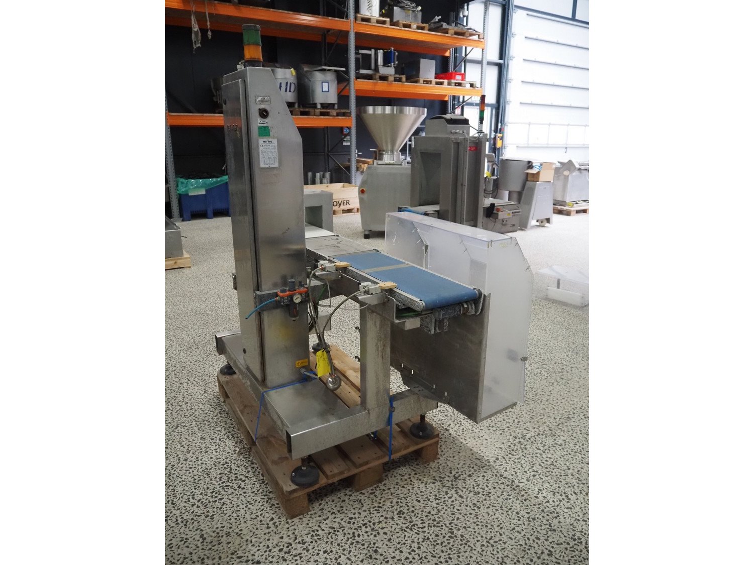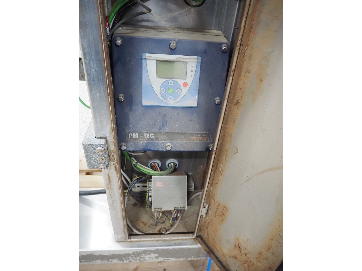 Pen-Tec metal detector with checkweigher and rejecter, model metal detector: PenTec DUAL FREQUENCY, number: 09820, clearance: 300 mm x 135 mm, plastic belt, belt width: 240 mm, model checkweigher: MSR-1200, serial number: P01215, year of construction: 2015, 230 V, 50 Hz, 4 A, maximum weight: 1200 gram, minimum weight: 50 gram, T= -750 gram, e=d= 0.5 gram, total dimensions: 1800 mm x 950 mm x 1800 mm. Kavel locatie: Amfoor 6, 4421 SE Kapelle, Nederland