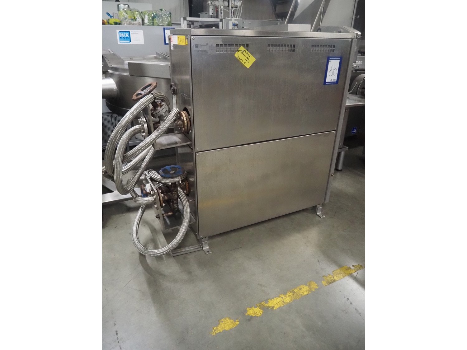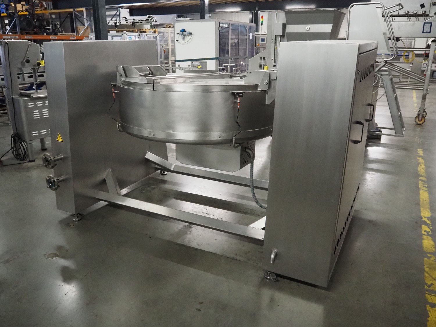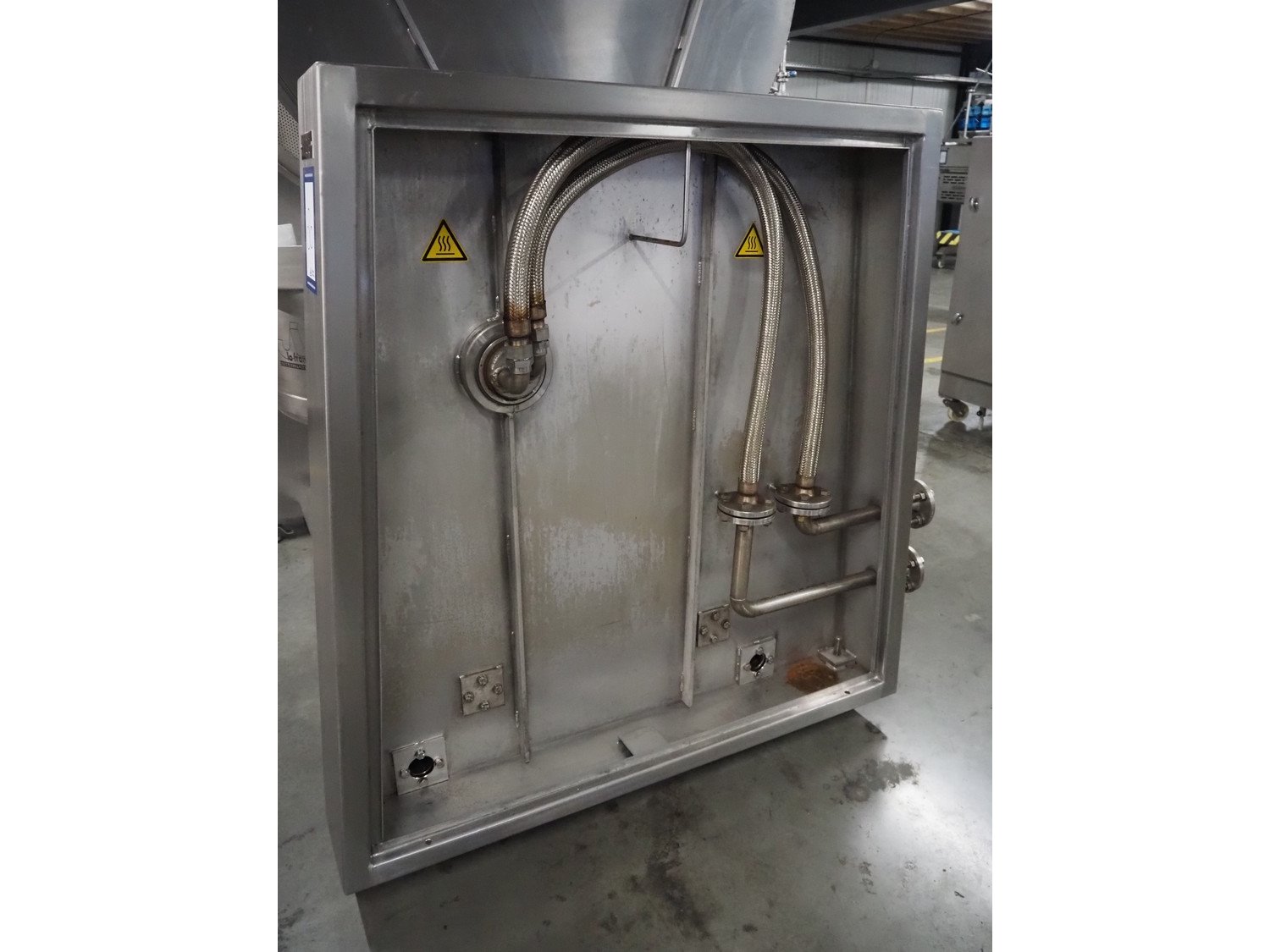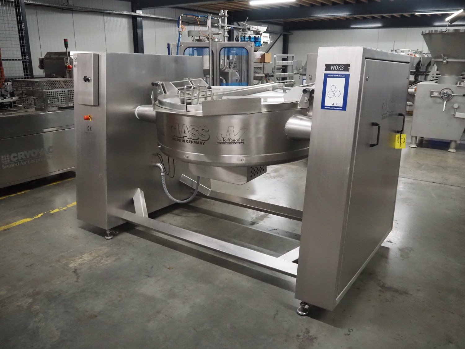 Glass cooking vessel with lifter for meat bins and oil heater, type: WOK 300, machine number: 2812, year of construction: 2006, 400 V, 3 Ph, 50 Hz, 6.93 A, 2.62 kW, volume: 300 liter, dimensions cooking vessel: 2500 mm x 1500 mm x 1610 mm, dimensions oil heater: 1500 mm x 440 mm x 1540 mm. Kavel locatie: Amfoor 6, 4421 SE Kapelle, Nederland