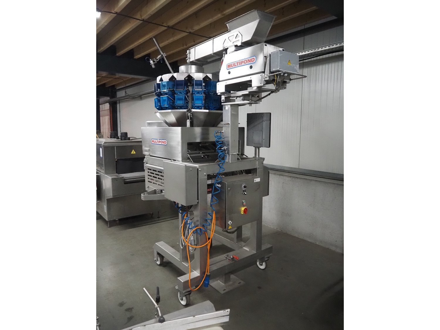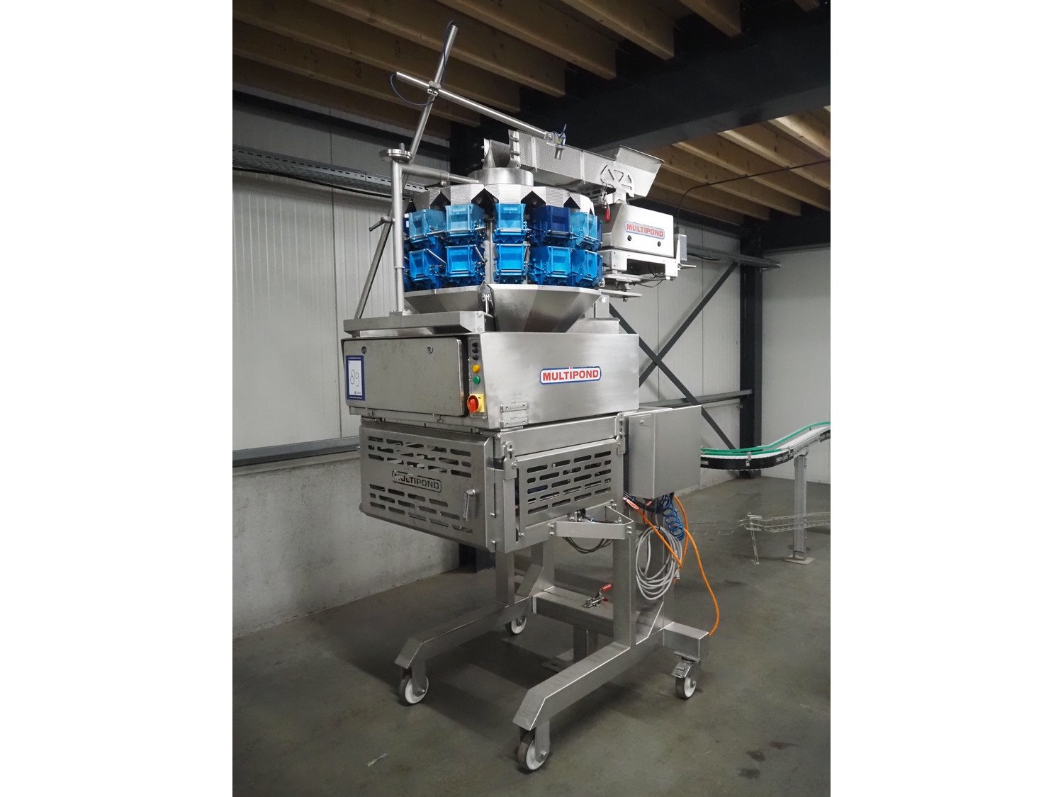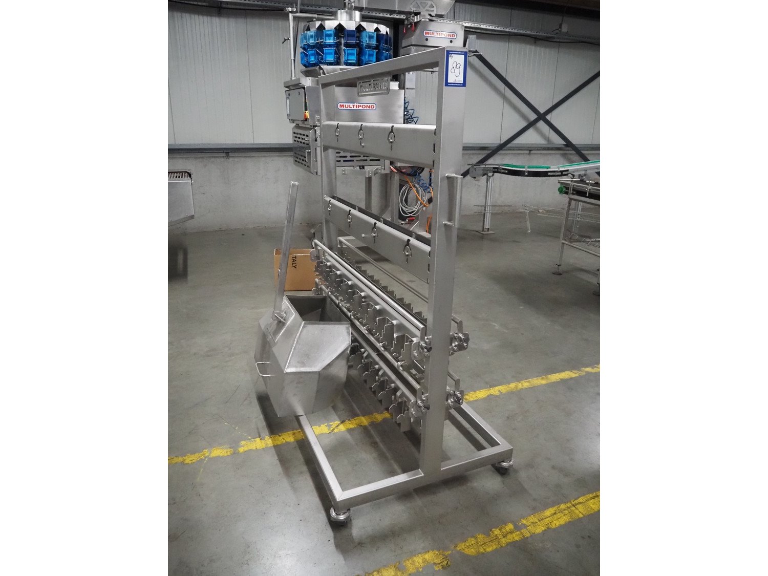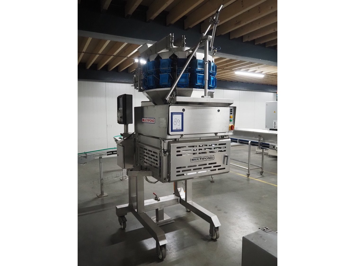 Multipond mobile multihead weigher, 14 heads, type: MP 1401-F, year of construction: 1998, 230 V, 1 Ph, 50 Hz, weighing range: 20 - 100 gram, total dimensions: 2100 mm x 1250 mm x 3250 mm. Including s/s trolley for bins, dimensions trolley: 1450 mm x 800 mm x 1730 mm. Kavel locatie: Amfoor 6, 4421 SE Kapelle, Nederland
