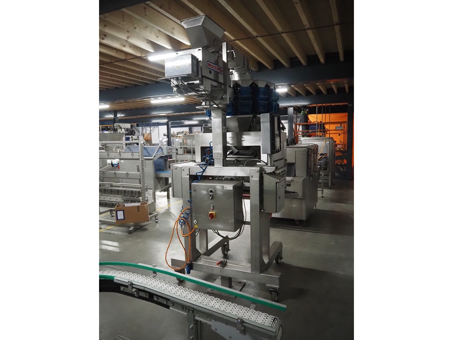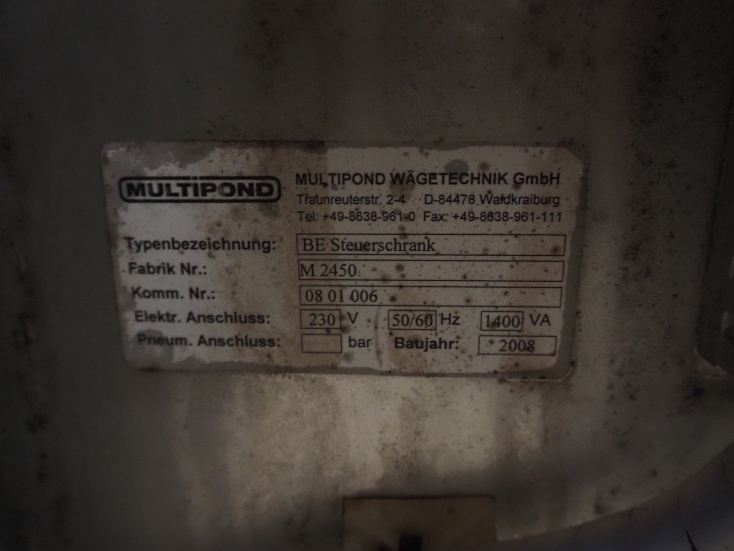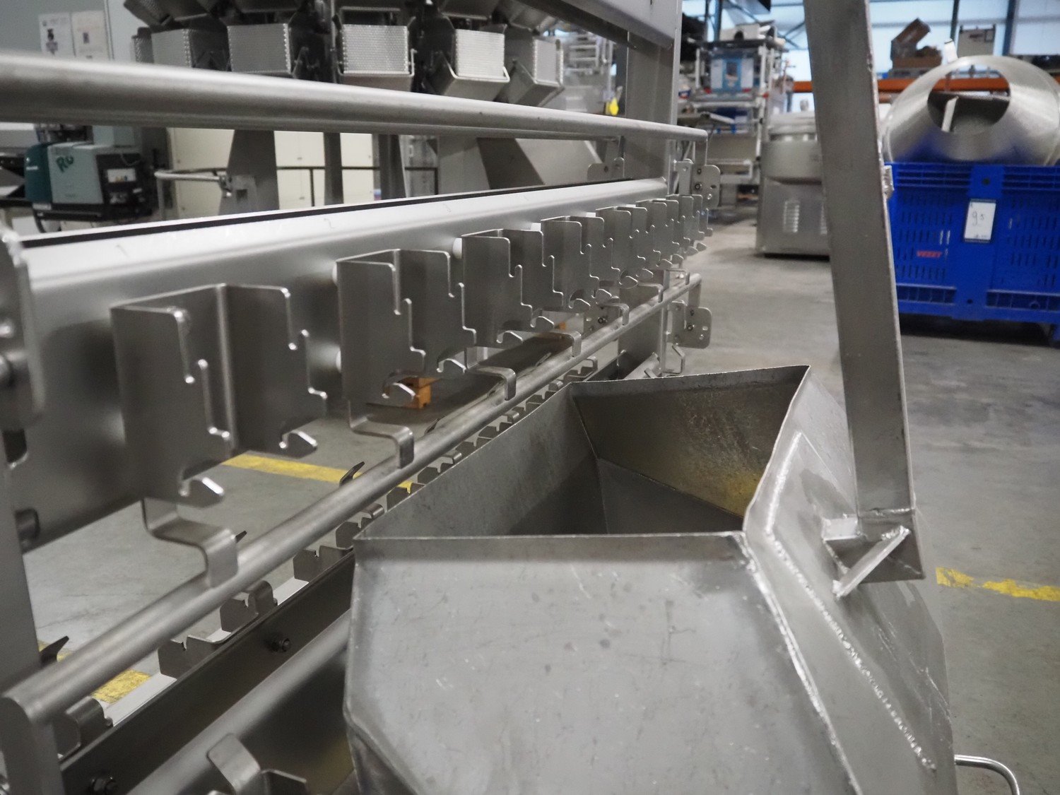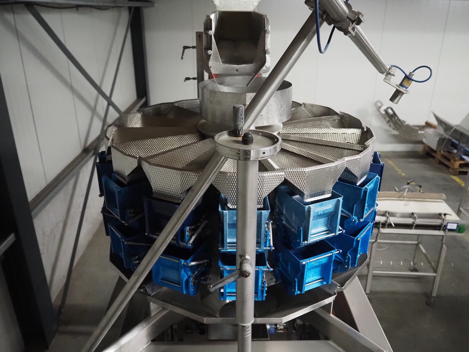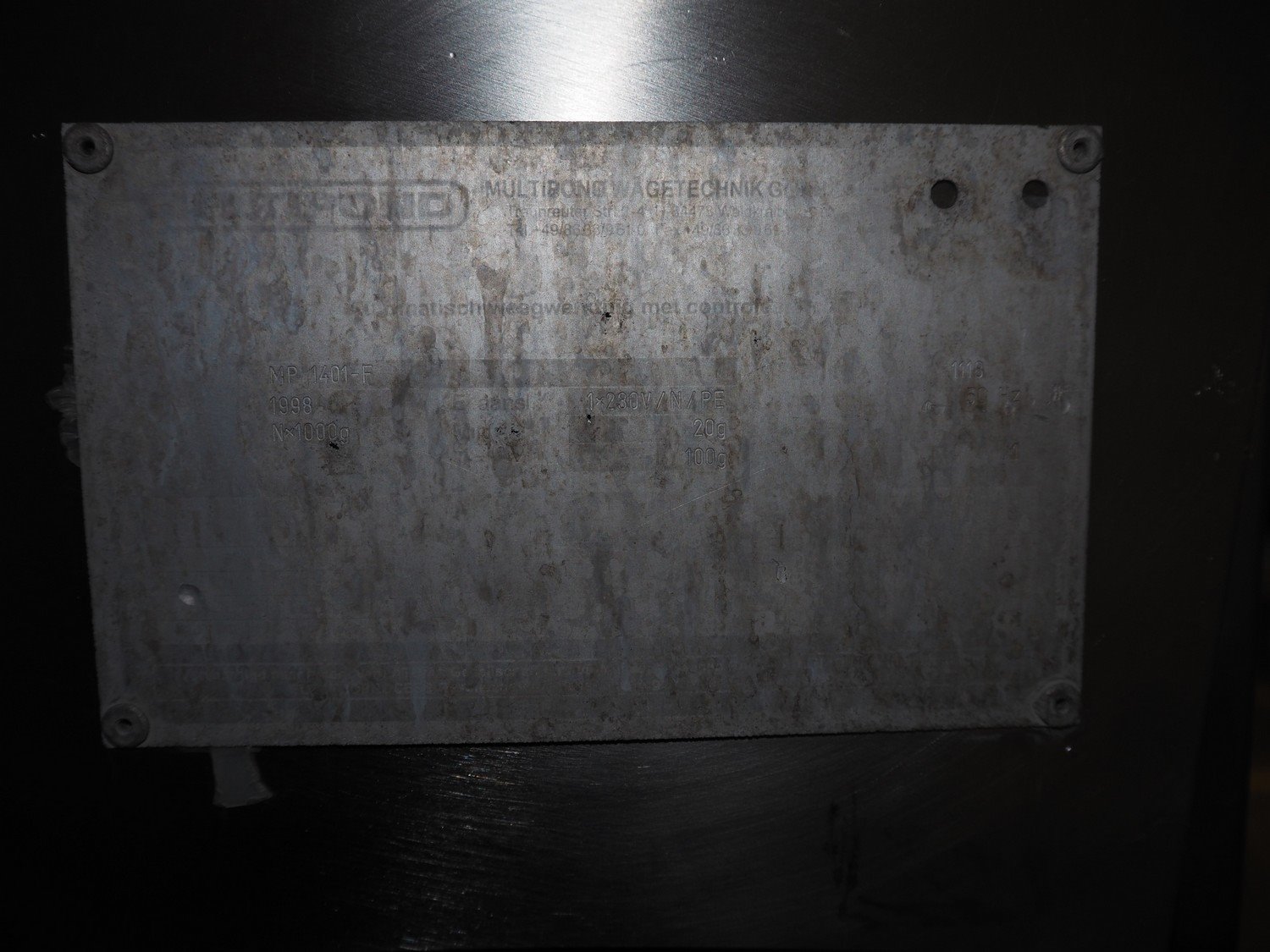 Multipond mobile multihead weigher, 14 heads, type: MP 1401-F, year of construction: 1998, 230 V, 1 Ph, 50 Hz, weighing range: 20 - 100 gram, total dimensions: 2100 mm x 1250 mm x 3250 mm. Including s/s trolley for bins, dimensions trolley: 1450 mm x 800 mm x 1730 mm. Kavel locatie: Amfoor 6, 4421 SE Kapelle, Nederland