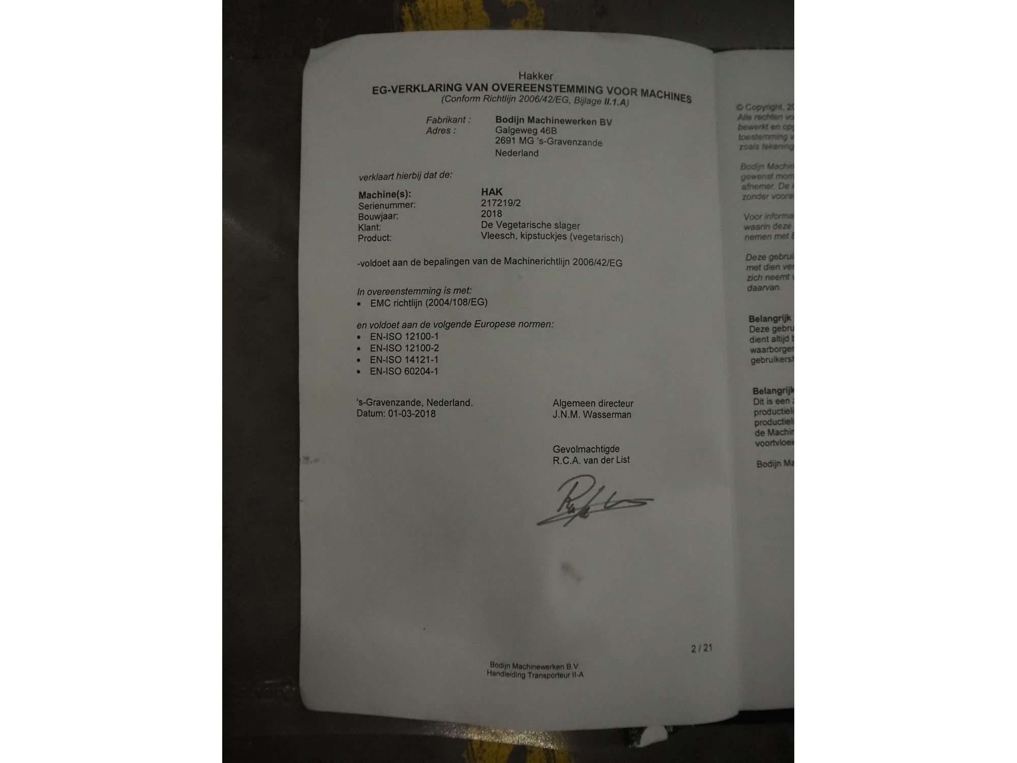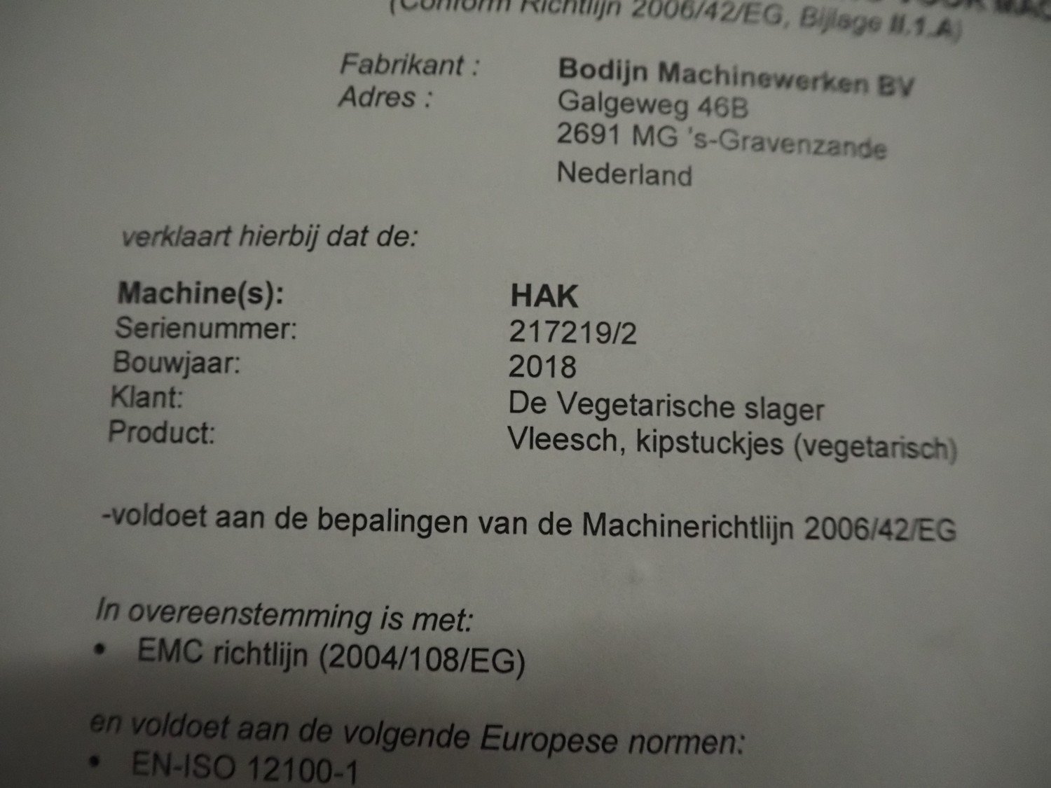 Bodijn slicer used for meat, serial number: HAK 217219/2, year of construction: 2018, 230 V, 50 Hz, 2.2 A, 0.5 kW, weight: 600 kg, belt width: 545 mm, working width: 500 mm, total dimensions: 2700 mm x 1200 mm x 2100 mm. Kavel locatie: Amfoor 6, 4421 SE Kapelle, Nederland