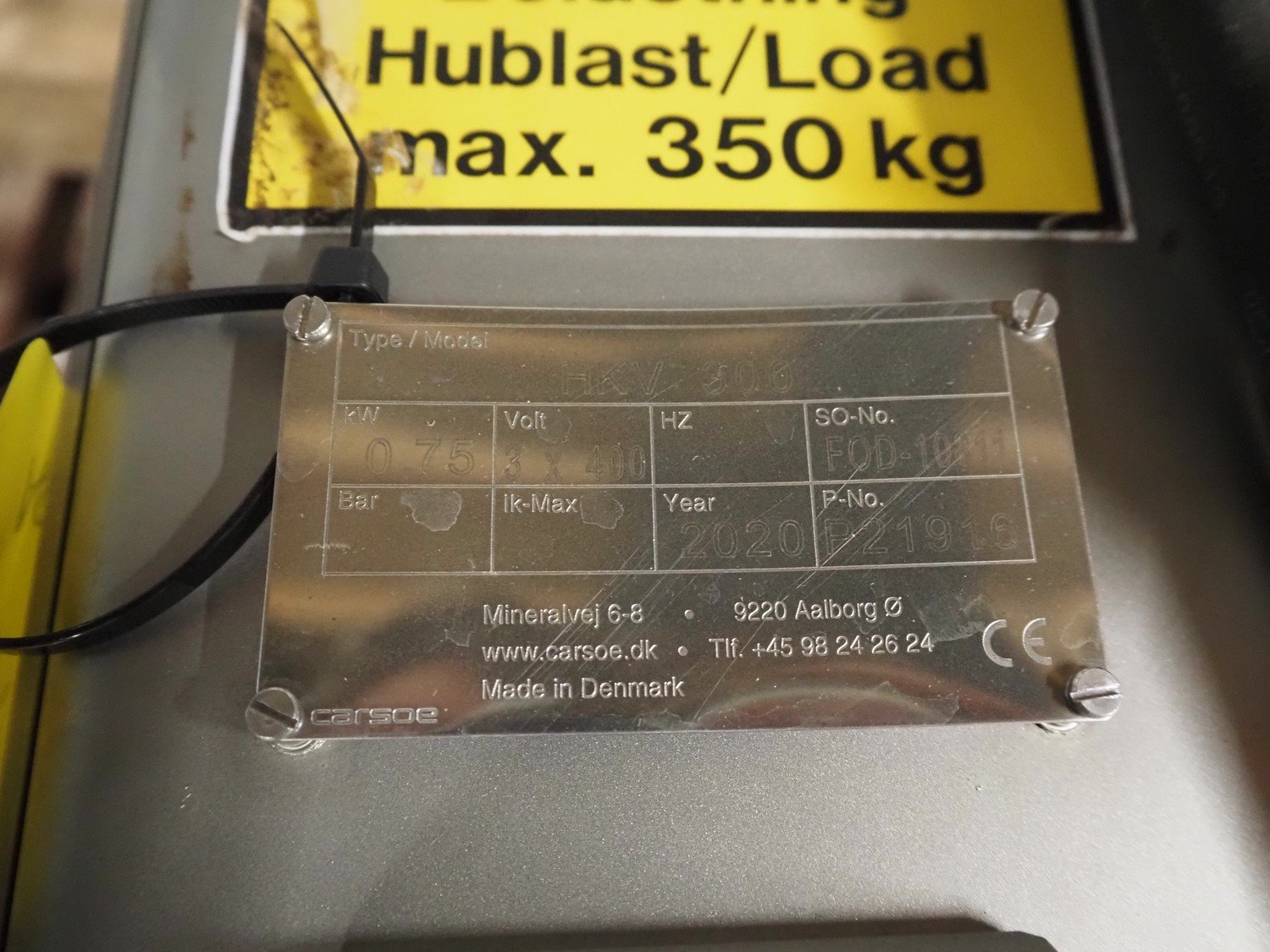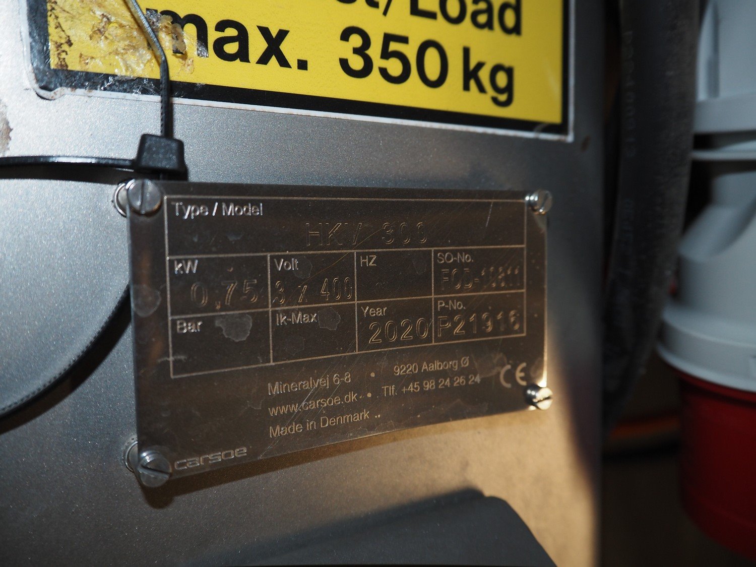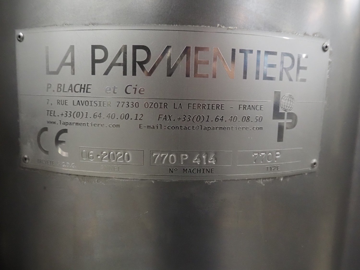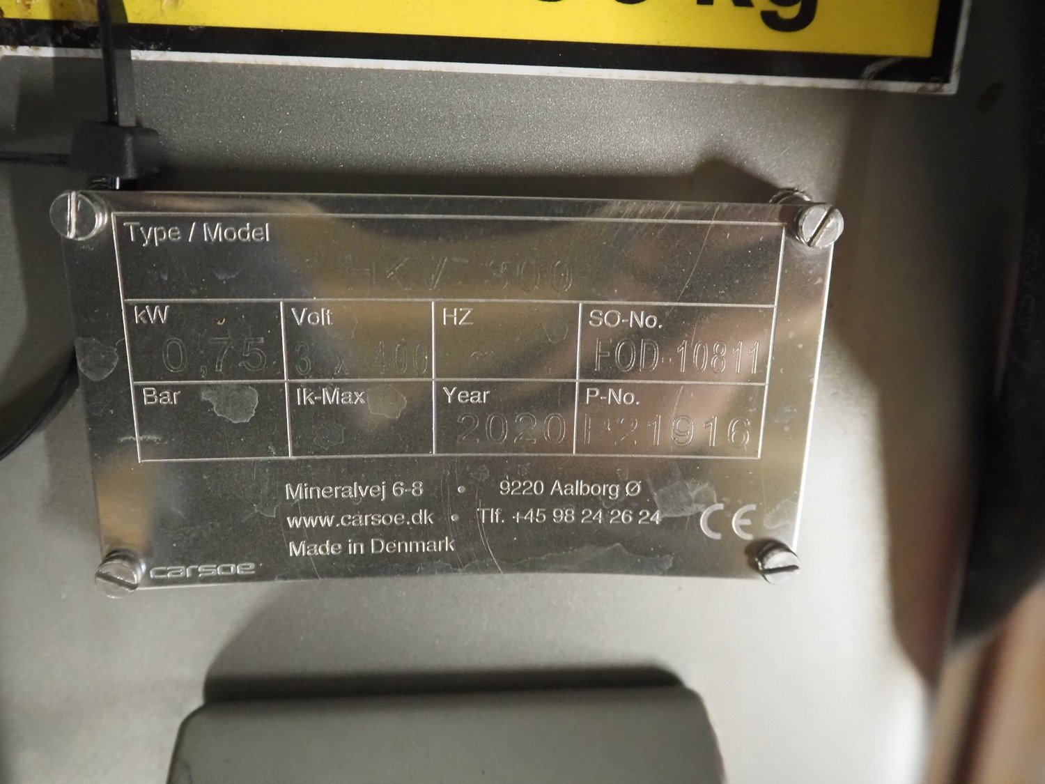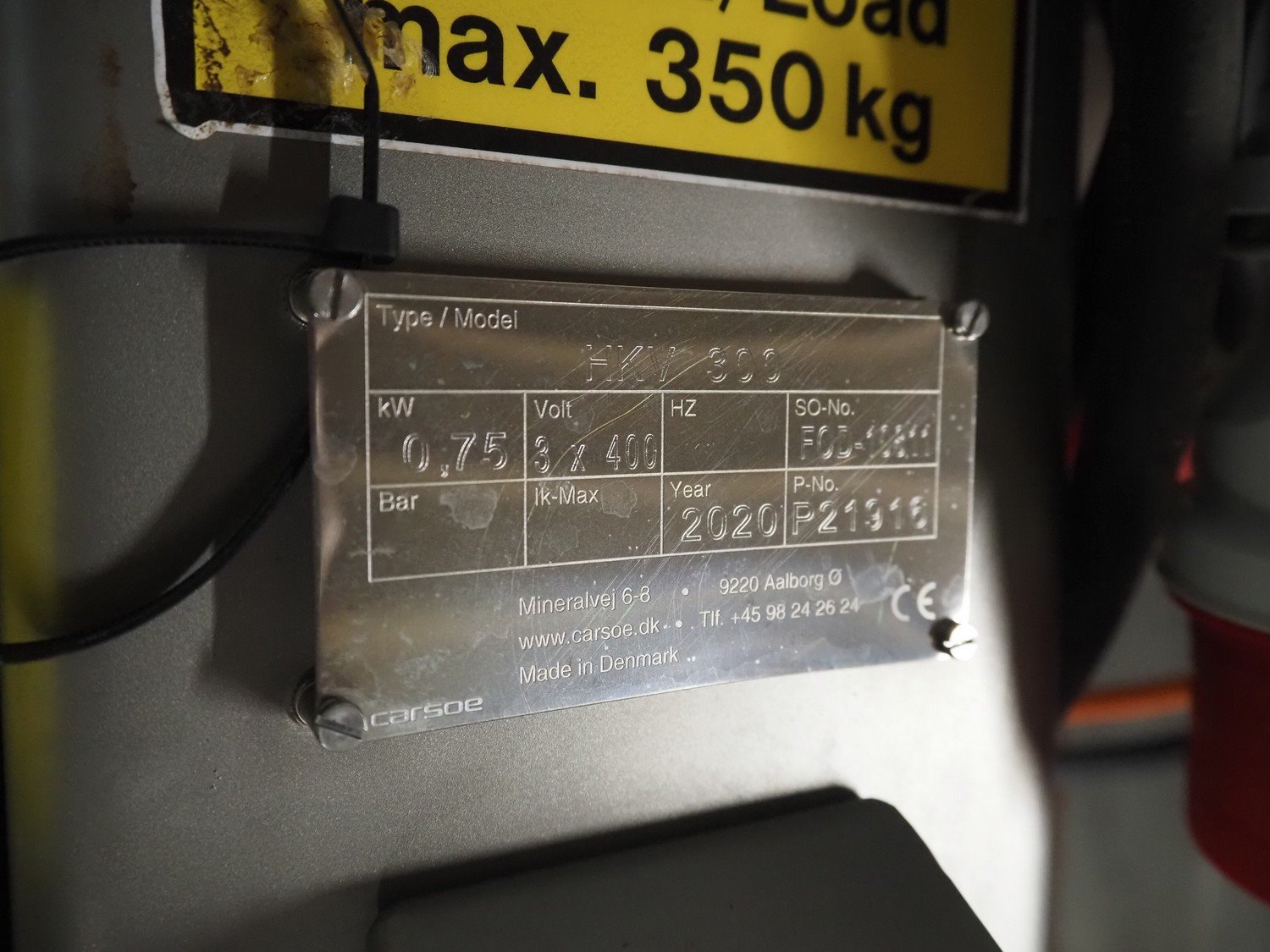 La Parmentiere dehairing machine with Carsoe lifter for meat bins, type: 770P, machine number: 770P414, year of construction: 06.2020, type lifter: HKV 300, serial number: FOD-10811, year of construction: 2020, 400 V, 3 Ph, 0.75 kW, dimensions: 2050 mm x 1800 mm x 1870 mm, dimensions lifter: 3150 mm x 1500 mm x 900 mm. Kavel locatie: Amfoor 6, 4421 SE Kapelle, Nederland
