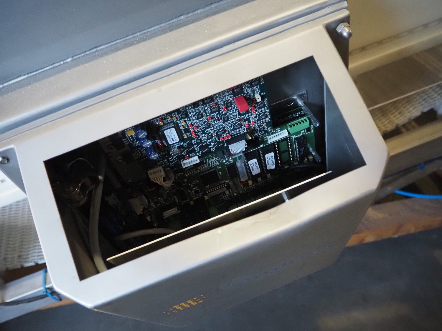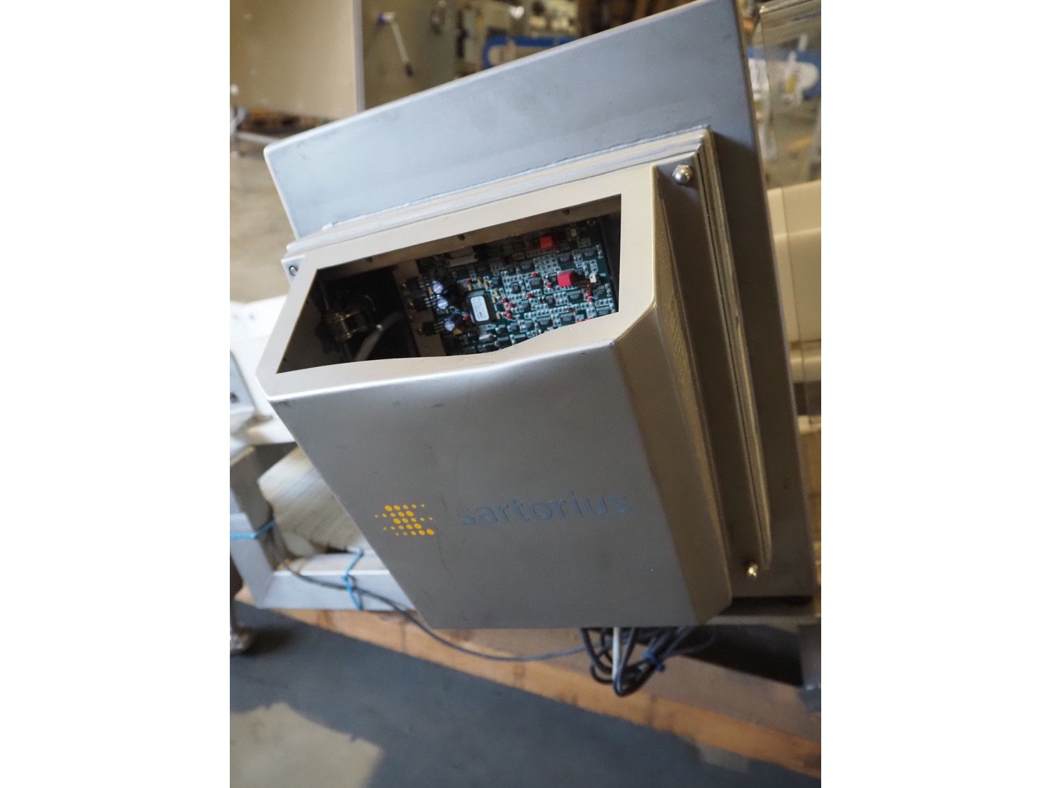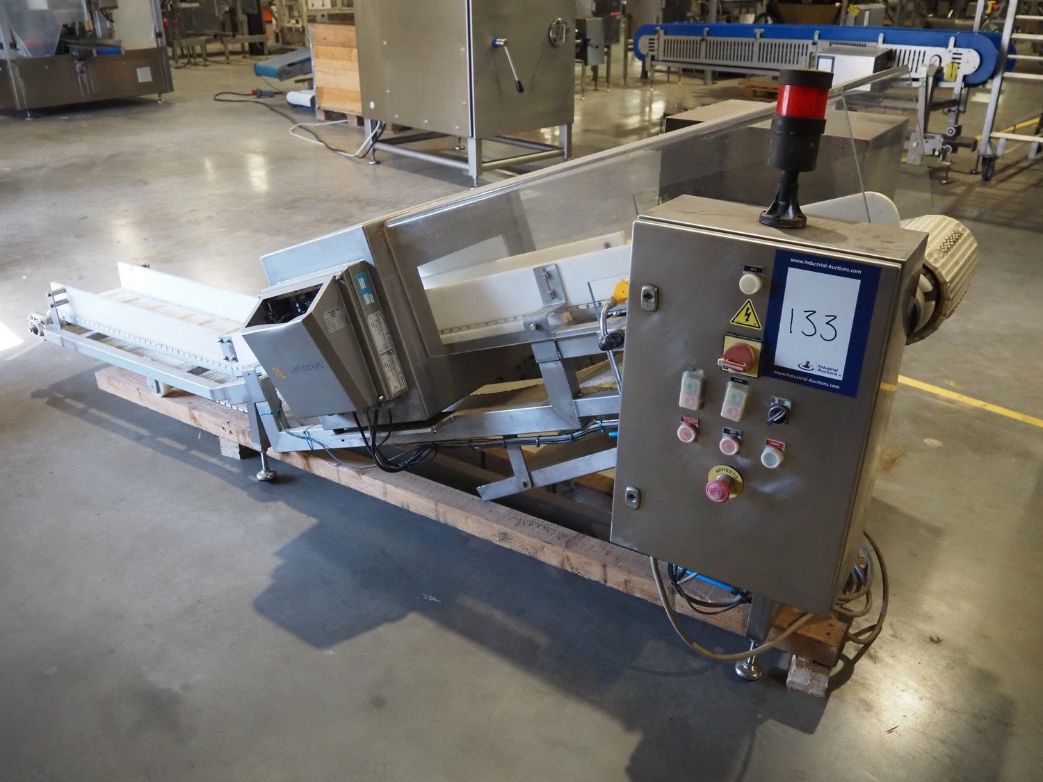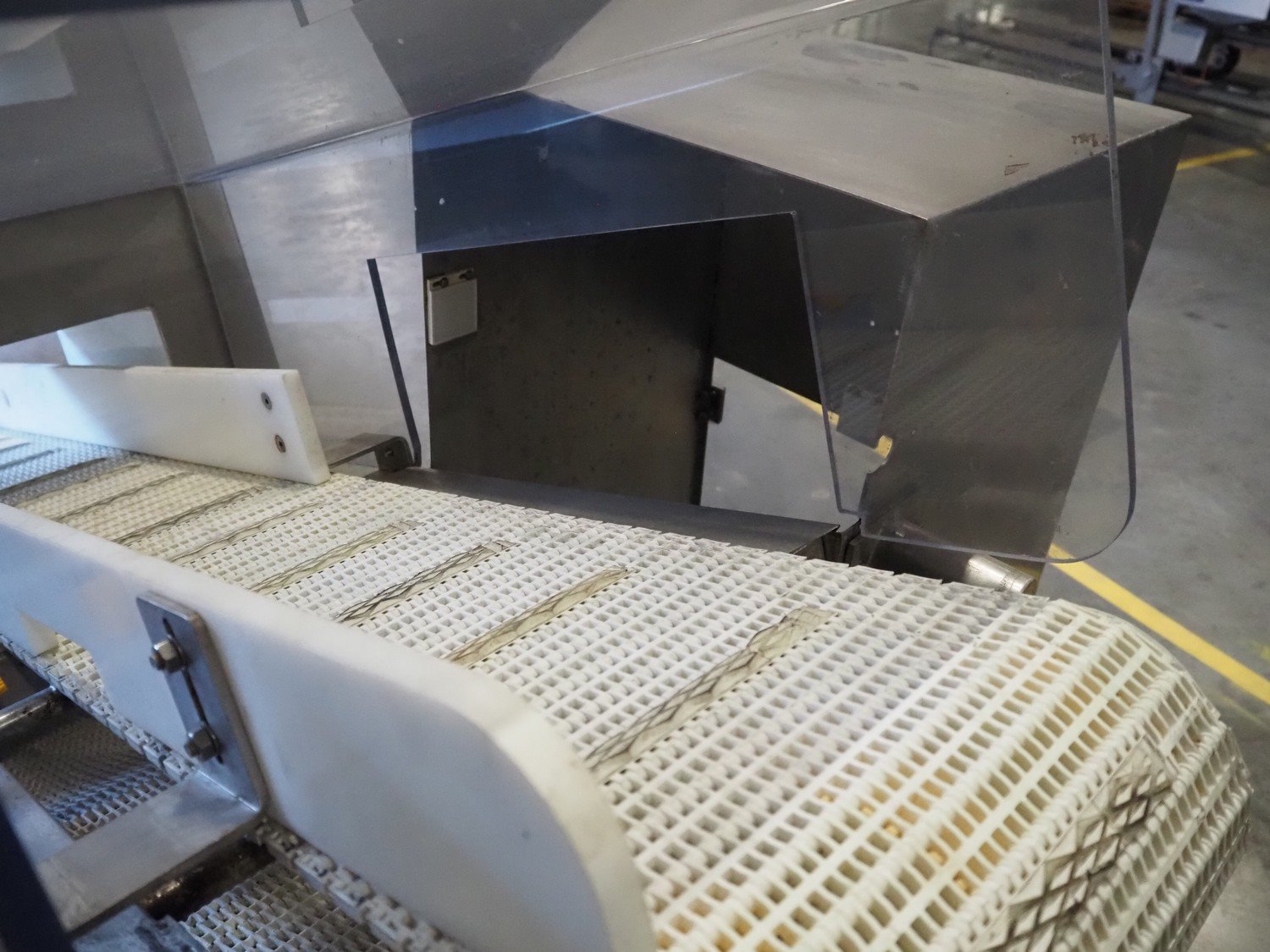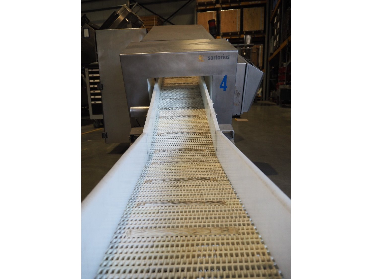 Sartorius metaldetector on elevating belt, plastic mesh belt, belt width: 304 mm, clearance: 350 mm x 160 mm, elevating height: 950 mm, total dimensions: 2900 mm x 1150 mm x 2220 mm. Incomplete. Kavel locatie: Amfoor 6, 4421 SE Kapelle, Nederland