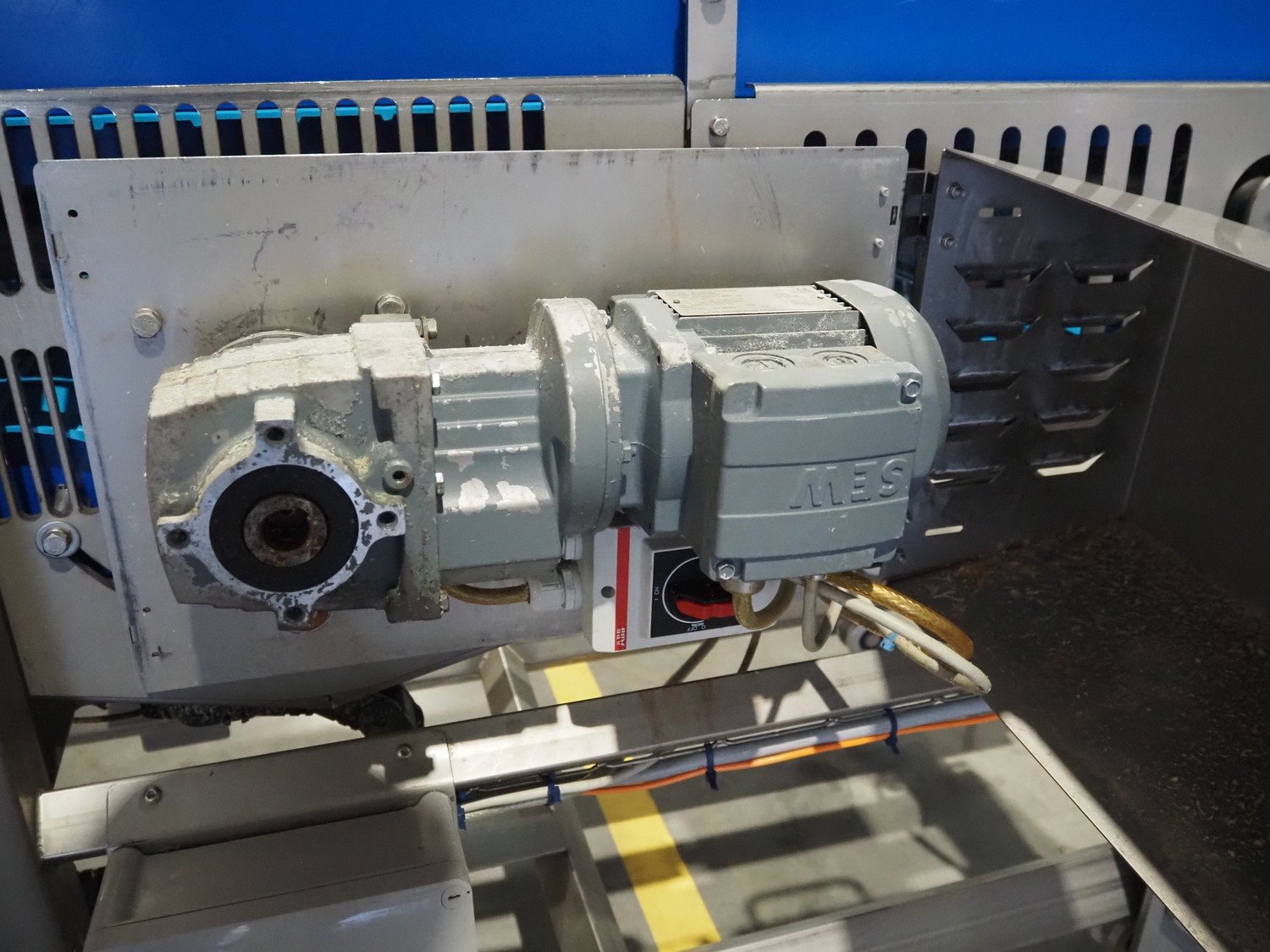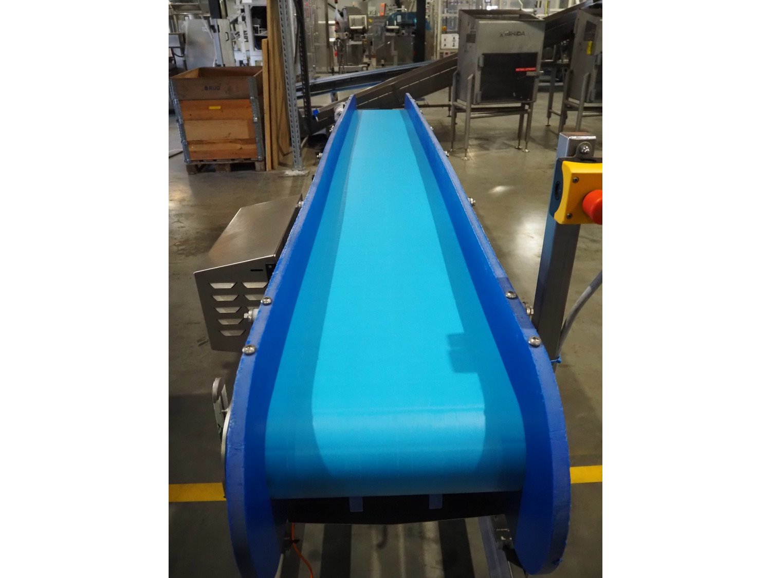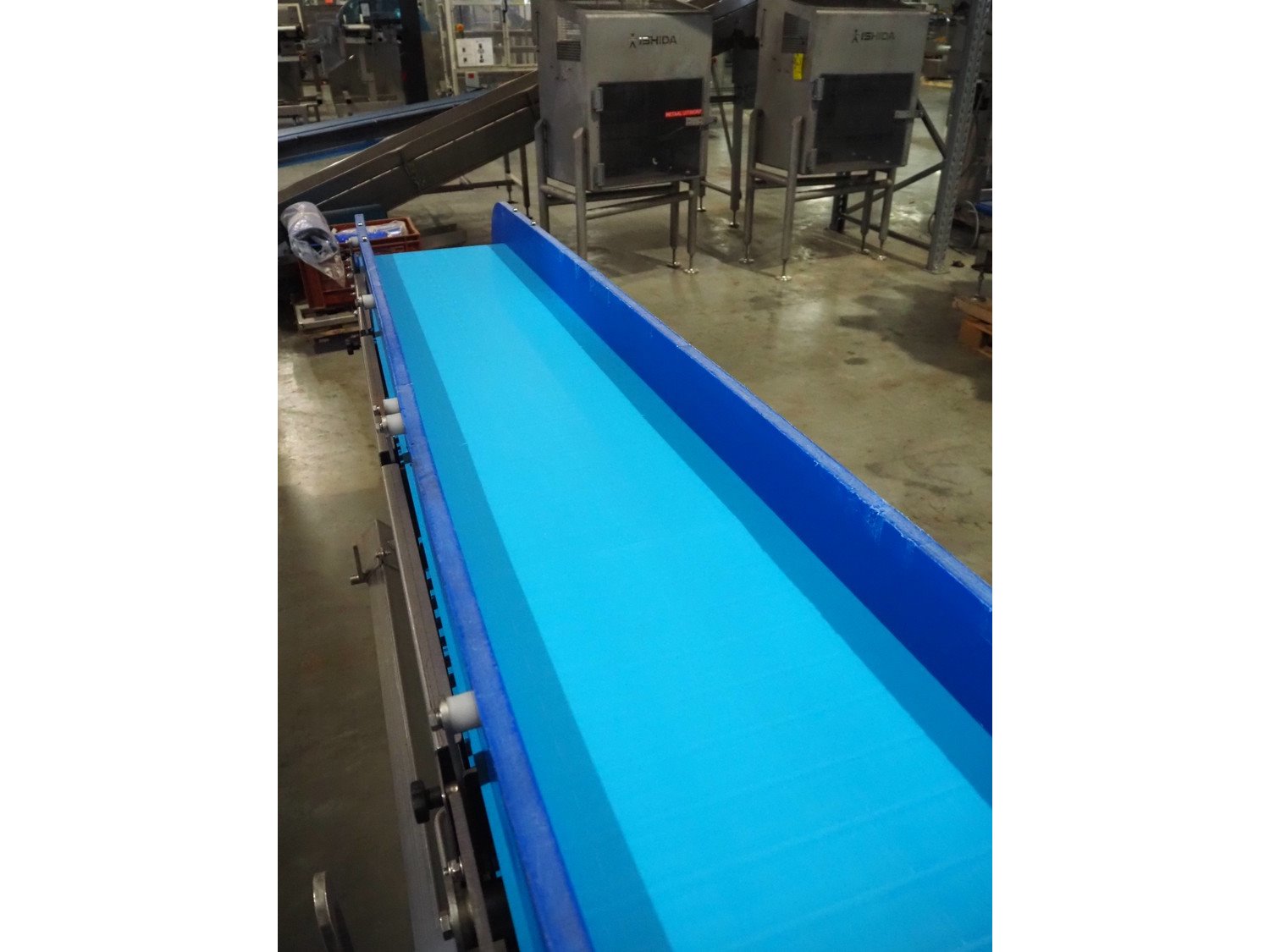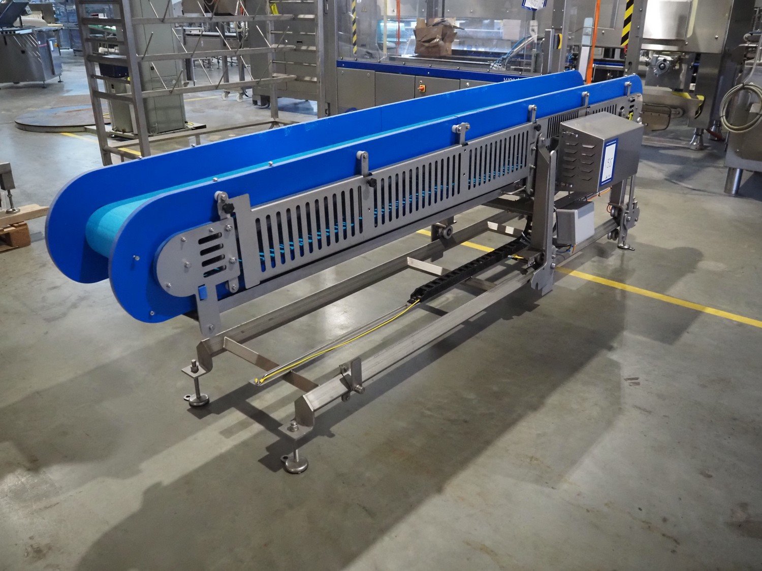 Transport belt on s/s rails, plastic belt, belt width: 400 mm, total dimensions: 3300 mm x 750 mm x 1250 mm. Kavel locatie: Amfoor 6, 4421 SE Kapelle, Nederland