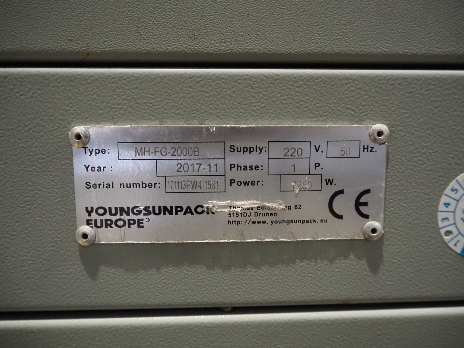 Youngsunpack Europe pallet wrapper, type: MH-FG-2000B, serial number: 171113PW4-1581, year of construction: 11-2017, 220 V, 1 Ph, 50 Hz, 1250 W, diameter platform: 1650 mm, total dimensions: 2600 mm x 1650 mm x 2790 mm. Kavel locatie: Amfoor 6, 4421 SE Kapelle, Nederland