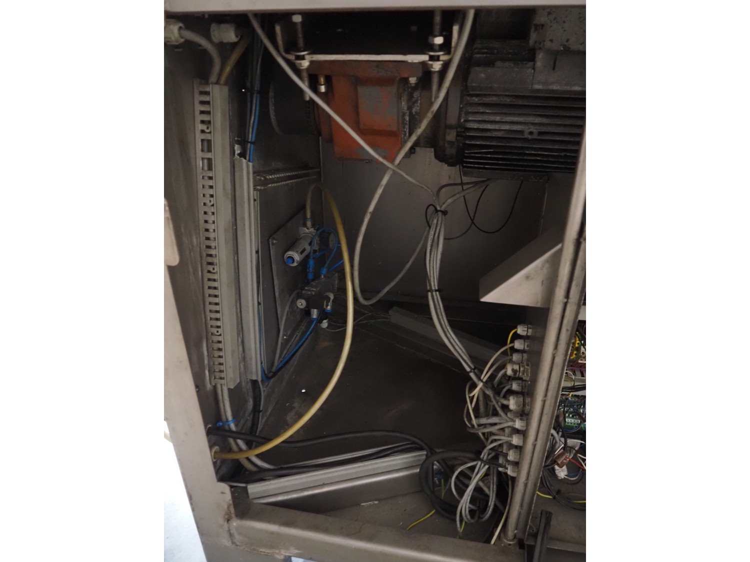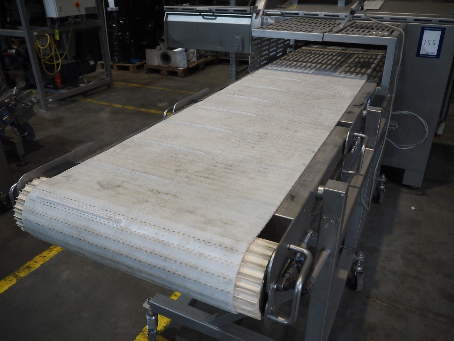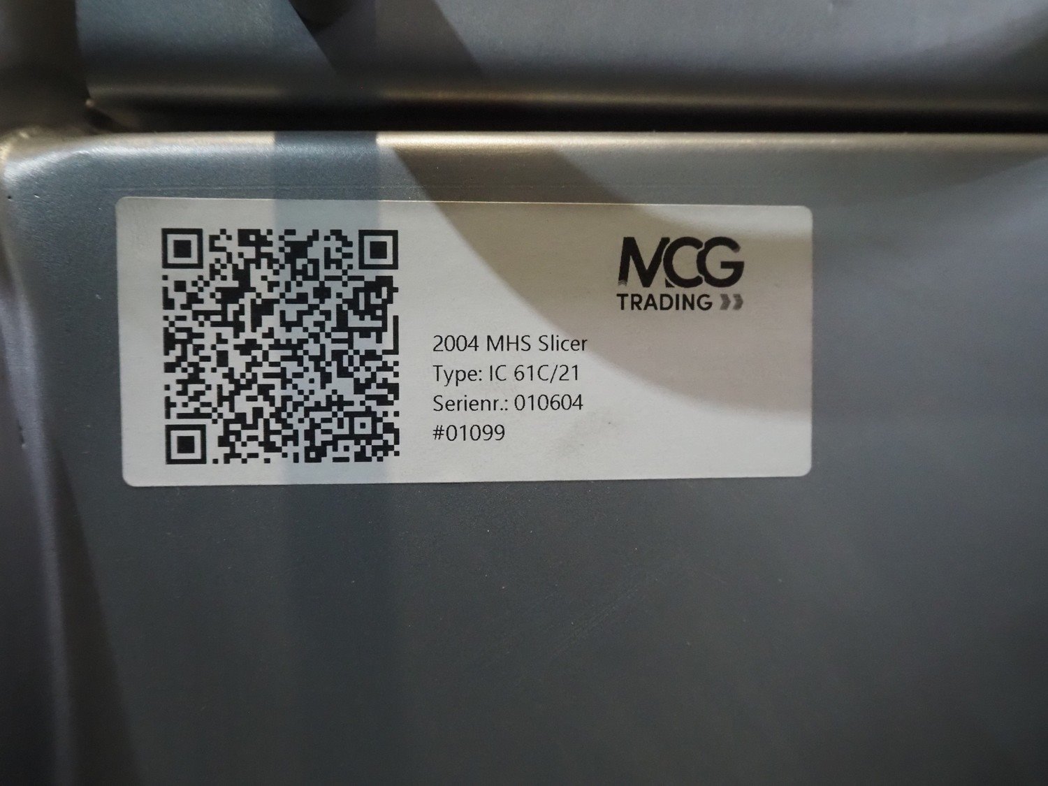 MHS Schneidetechnik GmbH slicer with infeed belt, type: IC610/21, serial number: 010604, year of construction: 2004, 400 V, 15.25 A, 6.1 kW, plastic belt, belt width: 610 mm, dimensions chamber: 210 mm x 210 mm, total dimensions: 2400 mm x 800 mm x 1500 mm, dimensions infeed belt: 2700 mm x 860 mm x 1500 mm. Kavel locatie: Amfoor 6, 4421 SE Kapelle, Nederland