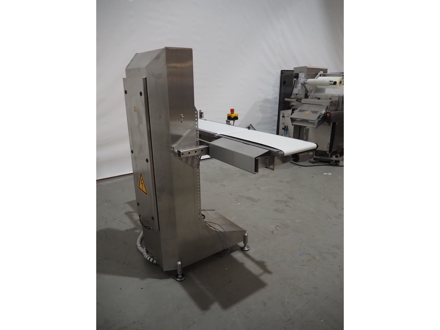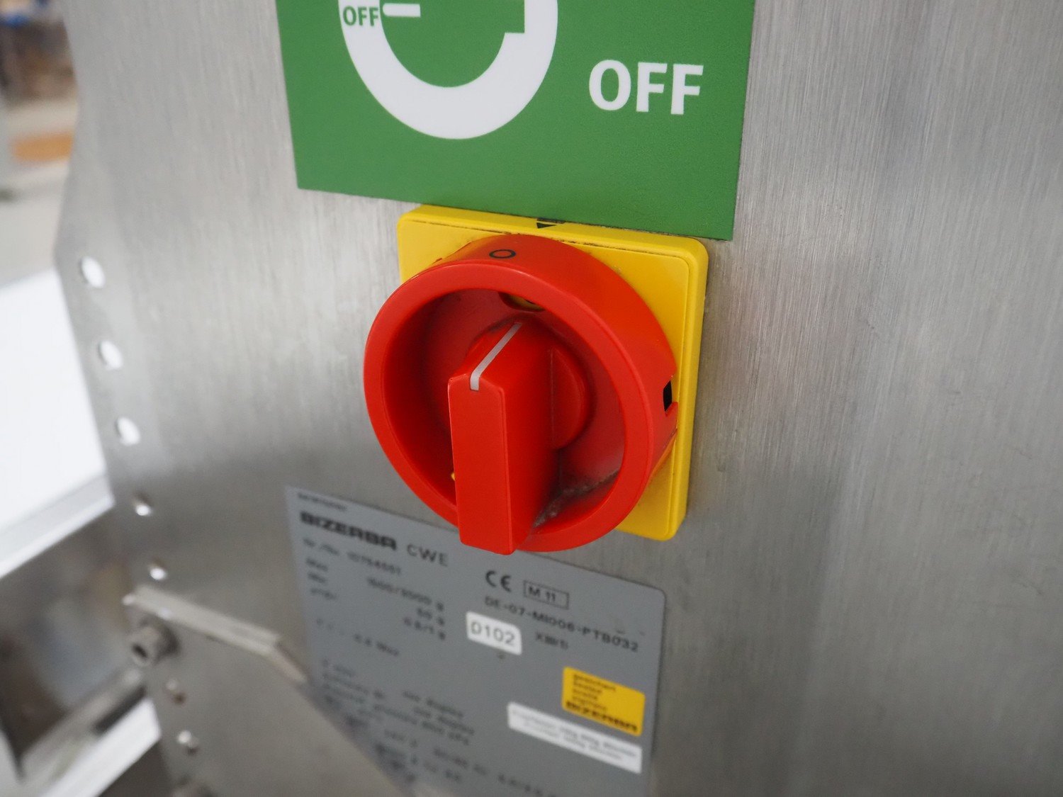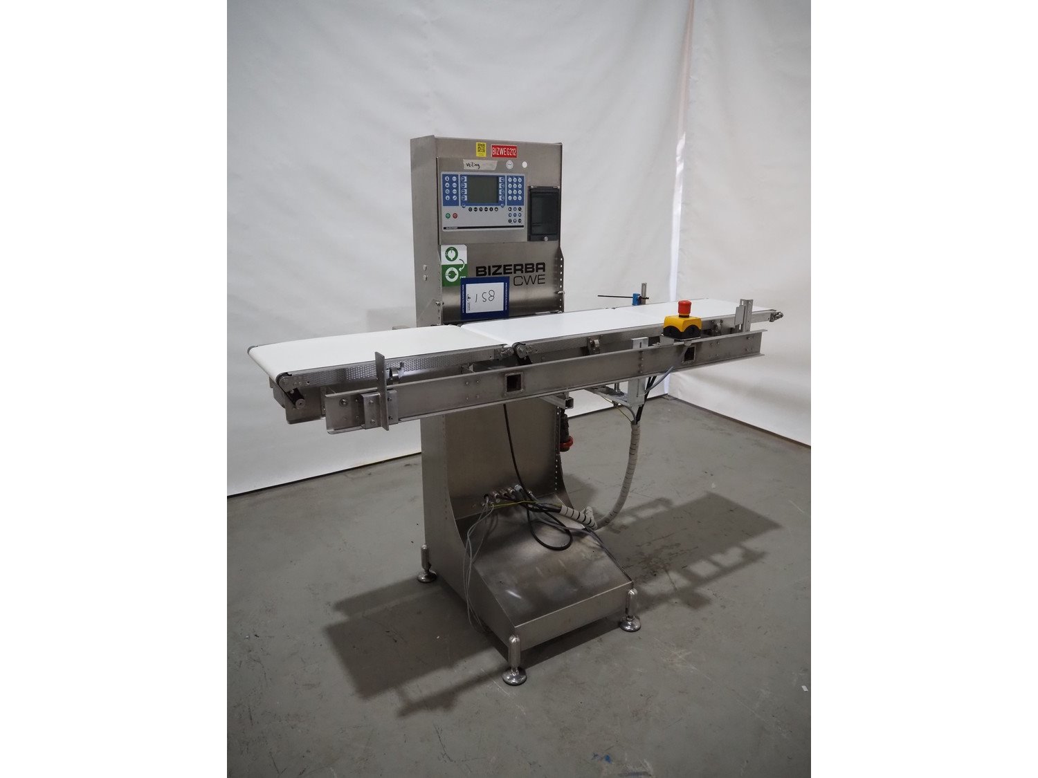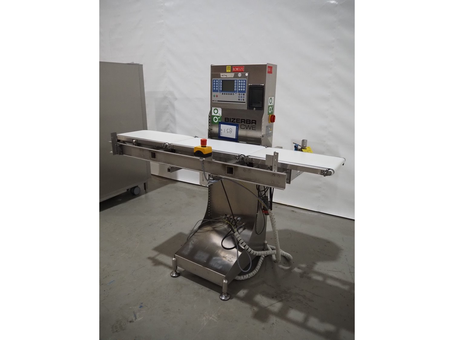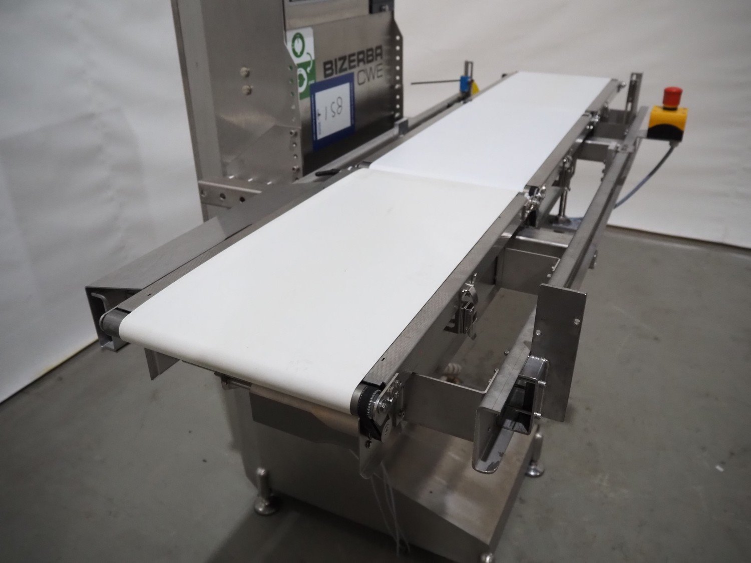 Bizerba checkweigher, model: CWE, number: 10754551, 200/220-240 V, 50/60 Hz, 5/3 A, maximum weight: 1500/3000 gram, minimum weight: 50 gram, e=d= 0.5/1 gram, plastic belt, belt width: 300 mm, total dimensions: 1800 mm x 920 mm x 1700 mm. Kavel locatie: Amfoor 6, 4421 SE Kapelle, Nederland