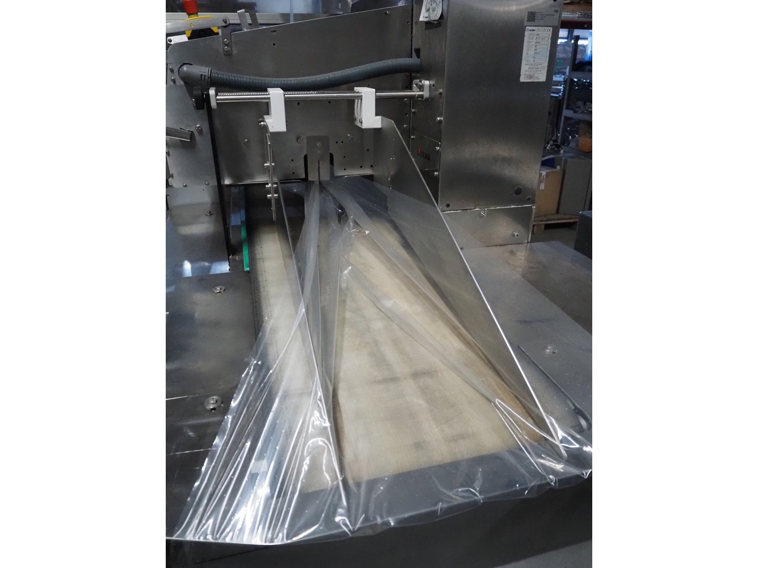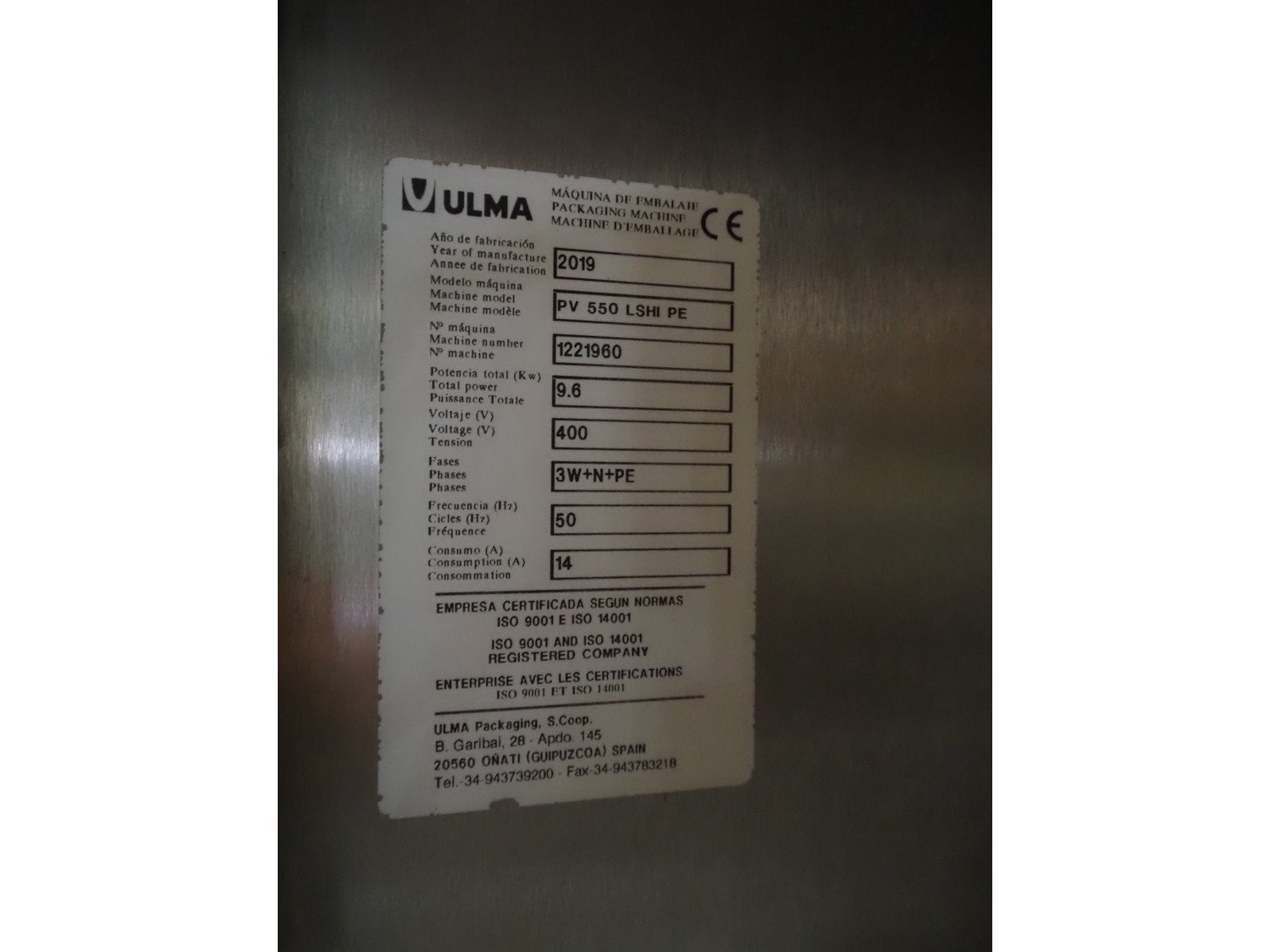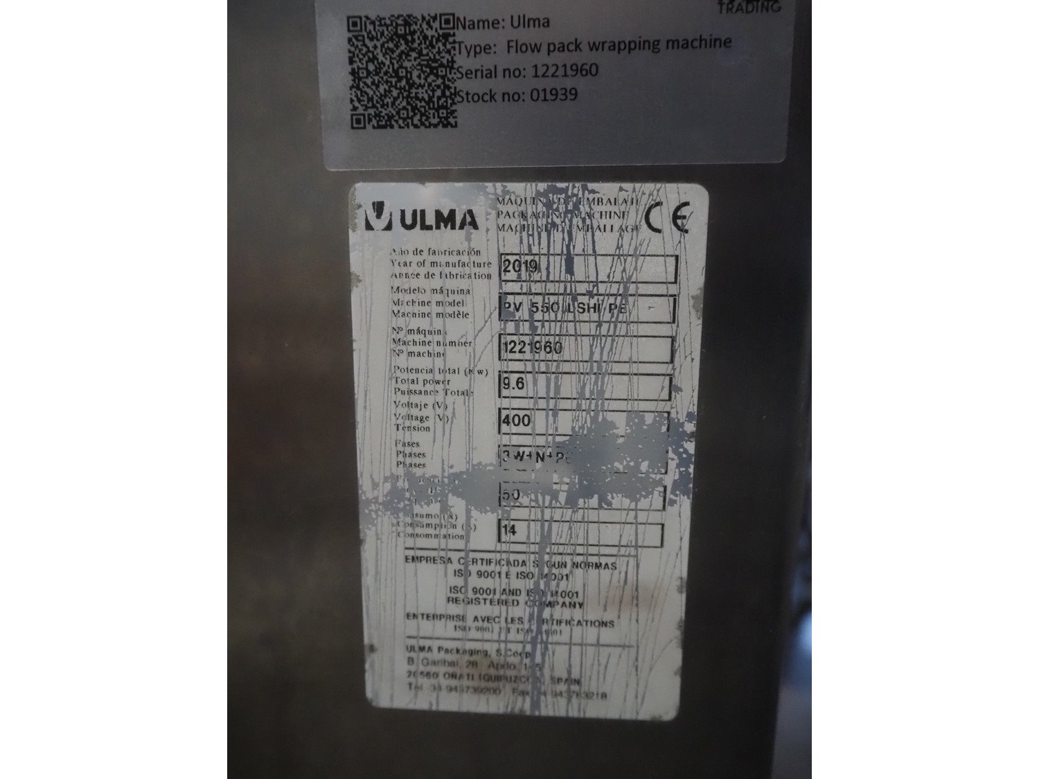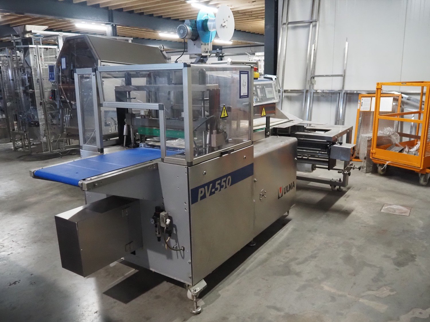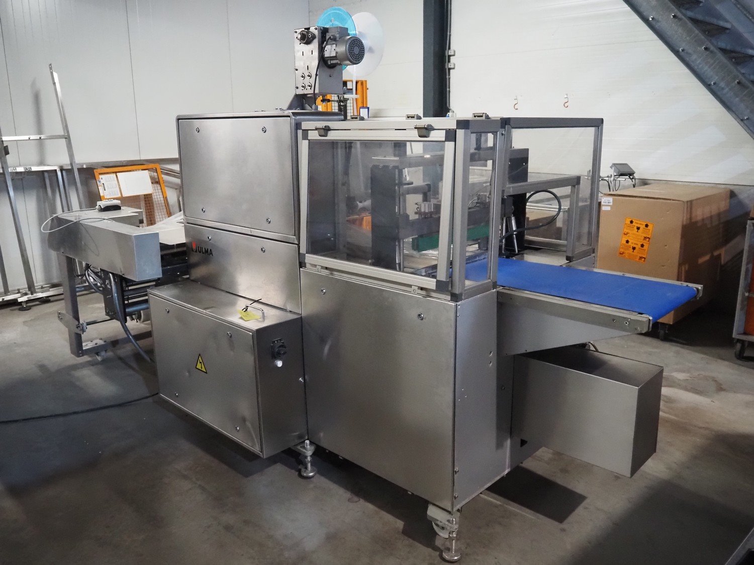 Ulma flowpacker, model: PV 550 L SHAPE, machine number: 1221960, year of construction: 2019, 400 V, 3 Ph, 50 Hz, 14 A, 9.6 kW, film width: 740 mm, plastic belt, belt width: 430 mm, seal width: 200 mm and 540 mm, plastic outfeed belt, belt width: 425 mm, total dimensions: 3900 mm x 1780 mm x 2020 mm. Kavel locatie: Amfoor 6, 4421 SE Kapelle, Nederland