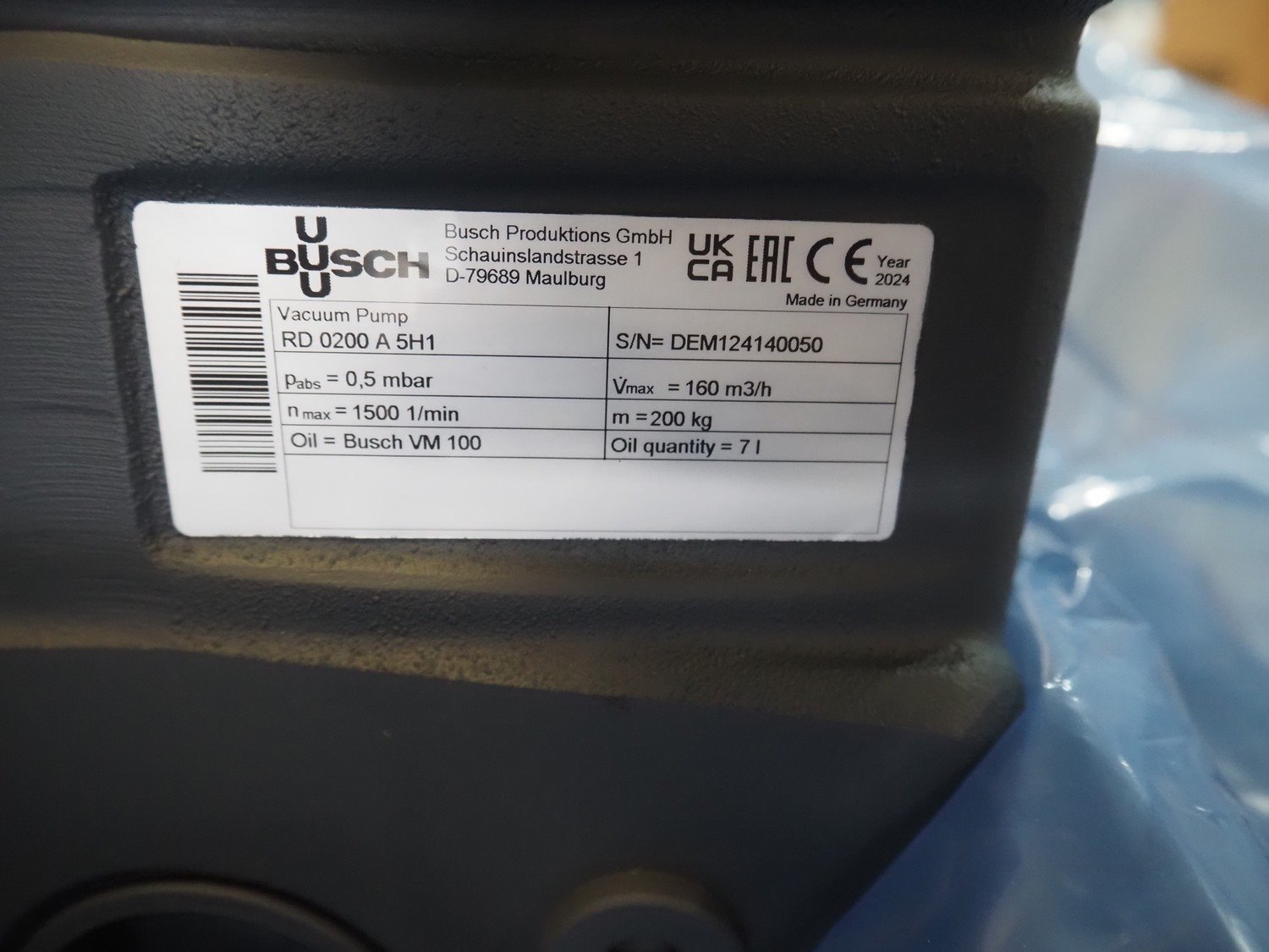 Busch vacuum pump, type: RD 0200 A 5H1, serial number: DEM124140050, year of construction: 2024, capacity: 160 m³ per hour, dimensions: 800 mm x 600 mm x 430 mm. Kavel locatie: Amfoor 6, 4421 SE Kapelle, Nederland