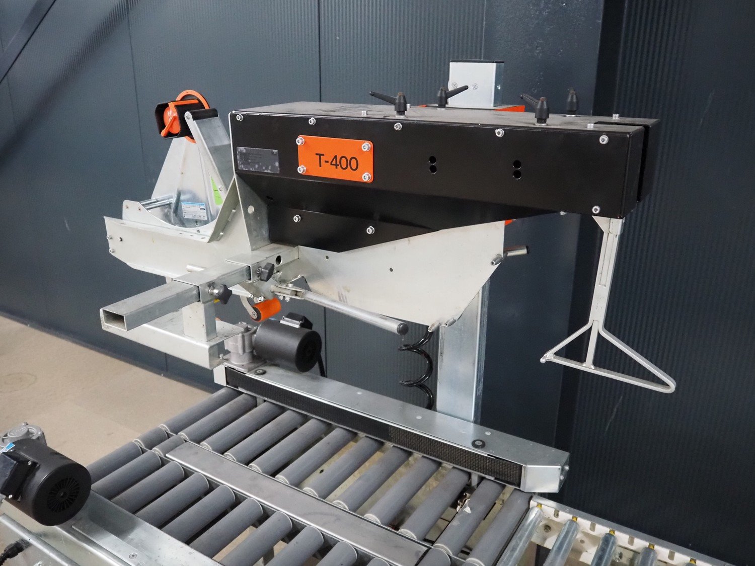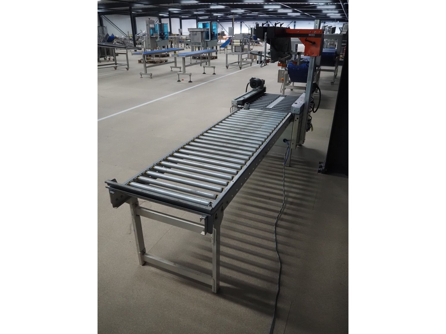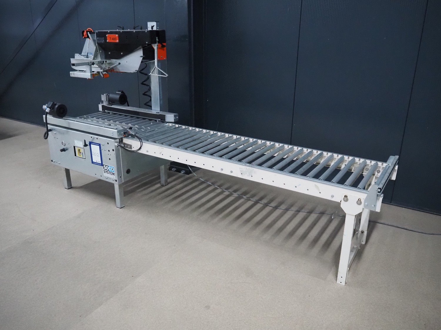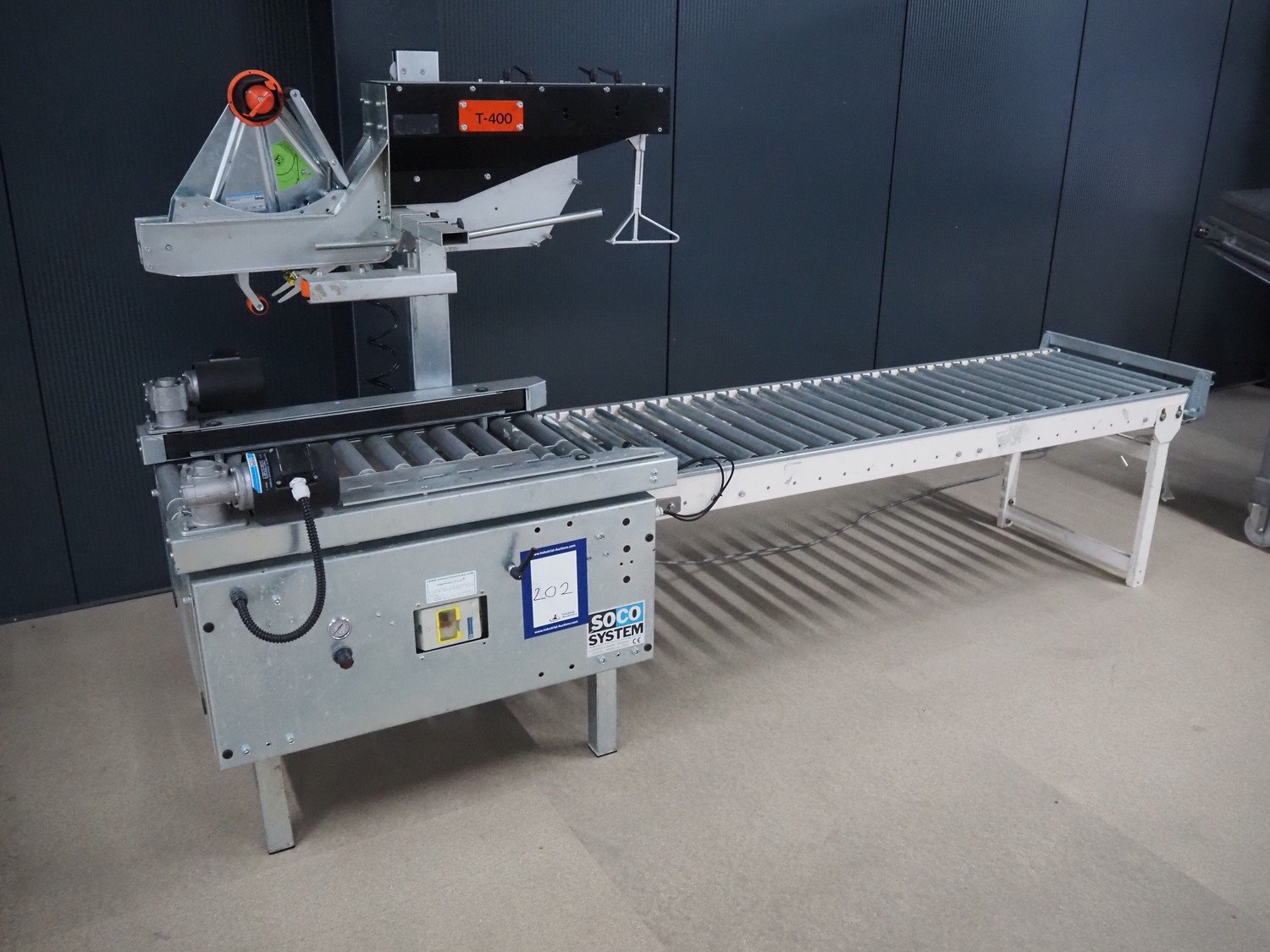 Soco System box closing machine with infeed roller conveyor, model: T-400, number: 06-98, year of construction: 1997, 400 V, 3 Ph, 10 A, 250 W, s/s rollers, roller width: 500 mm, plastic rollers, roller width: 600 mm, total dimensions: 2900 mm x 900 mm x 1500 mm. Kavel locatie: Amfoor 6, 4421 SE Kapelle, Nederland