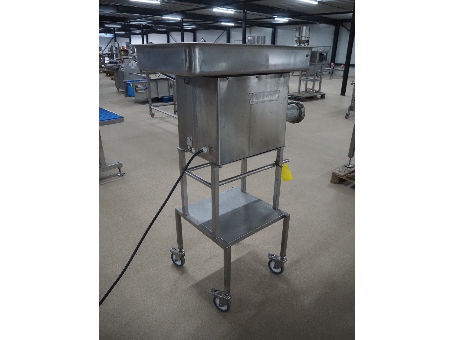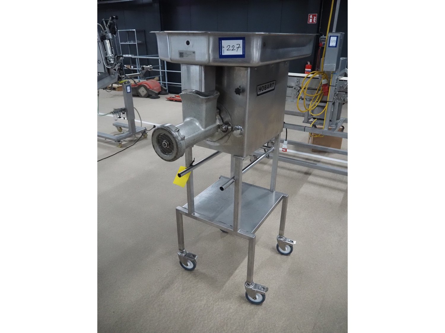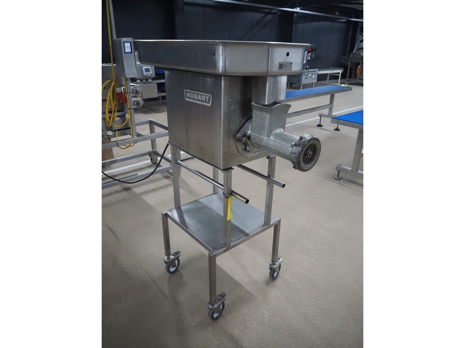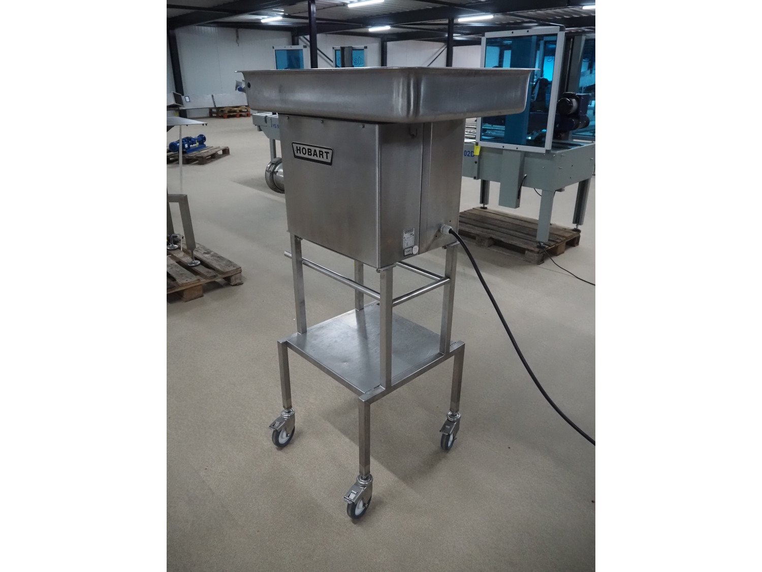 Hobart grinder on s/s mobile frame, model: 4732 SS, serial number: 11 218-231, 380 V, 3 Ph, 50 Hz, 4.6 A, diameter plate: 98 mm, total dimensions: 1040 mm x 560 mm x 1520 mm. Kavel locatie: Amfoor 6, 4421 SE Kapelle, Nederland