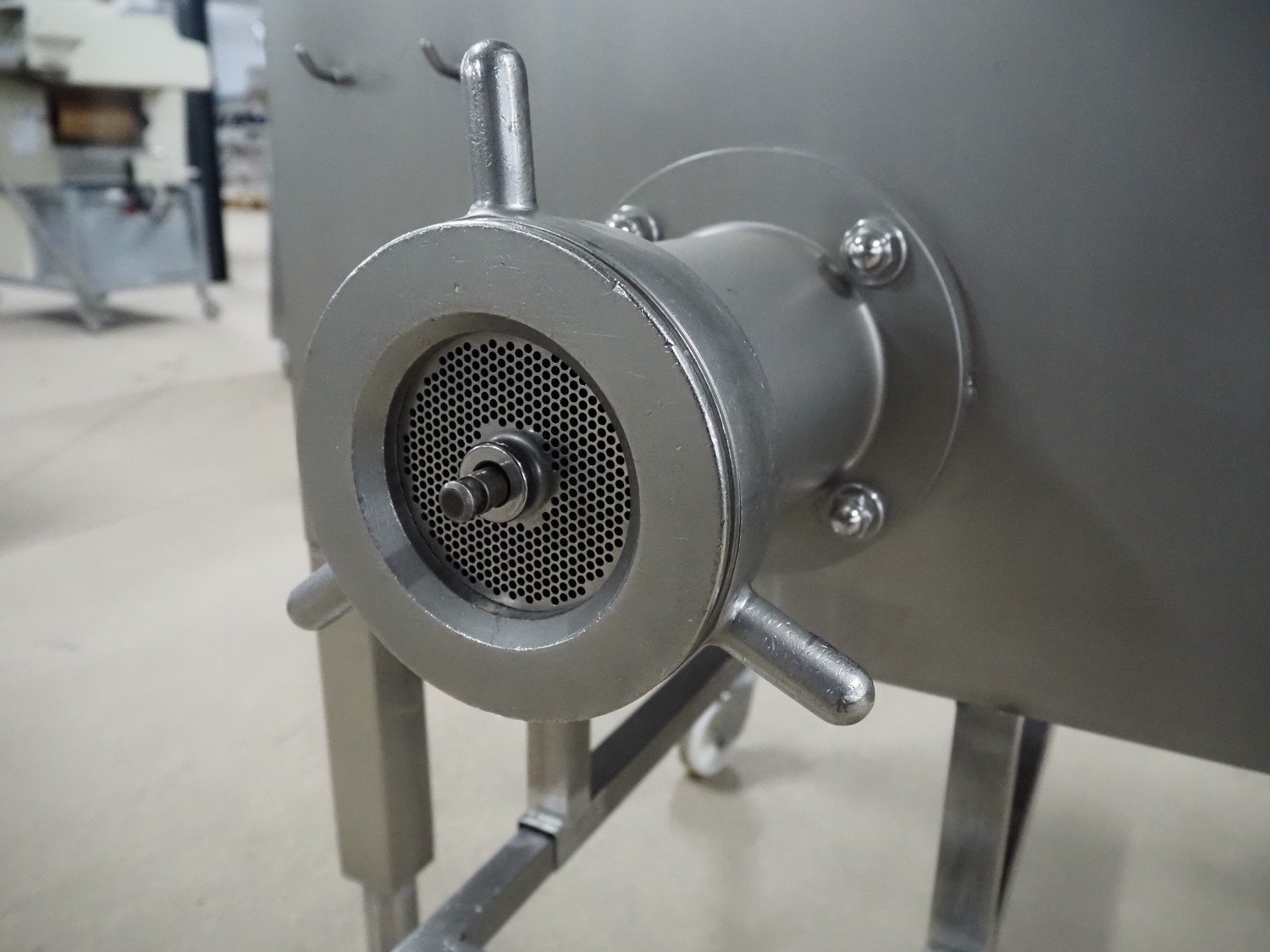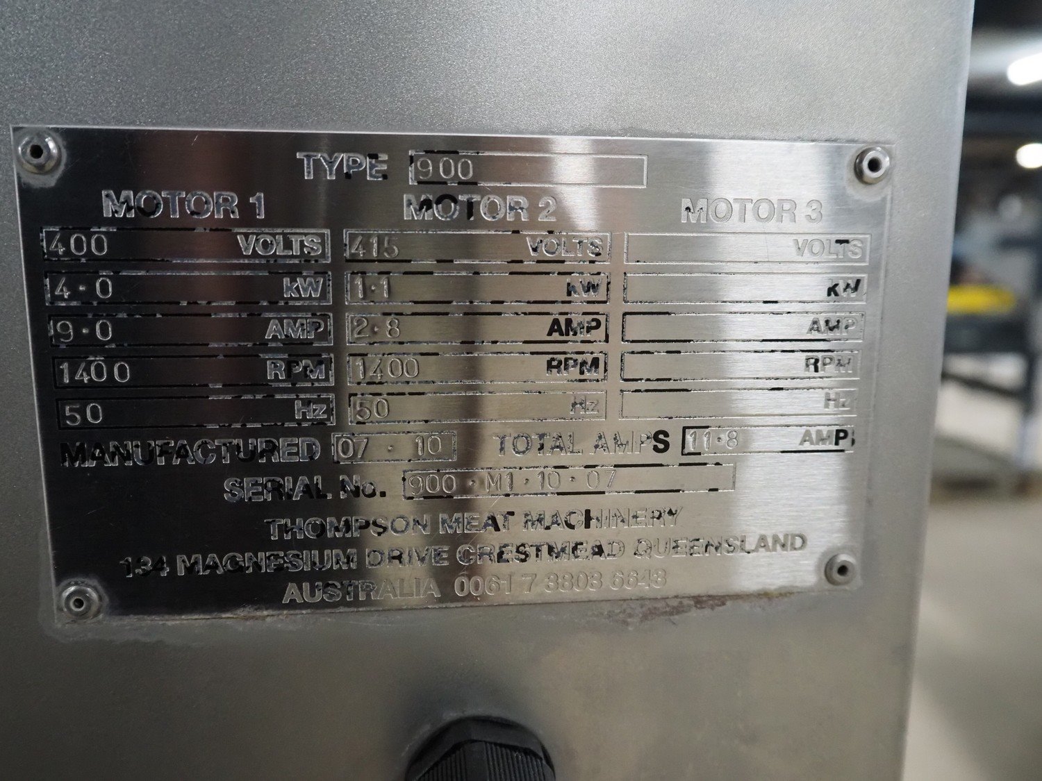 Thompson Meat Machinery paddle mixer-grinder, type: 900, serial number: 900-M1-10-07, year of construction: 07-2010, 415 V, 50 Hz, 9/2.8 A, 4/ 1.1 kW, diameter plate: 100 mm, total dimensions: 950 mm x 1070 mm x 1370 mm. Kavel locatie: Amfoor 6, 4421 SE Kapelle, Nederland