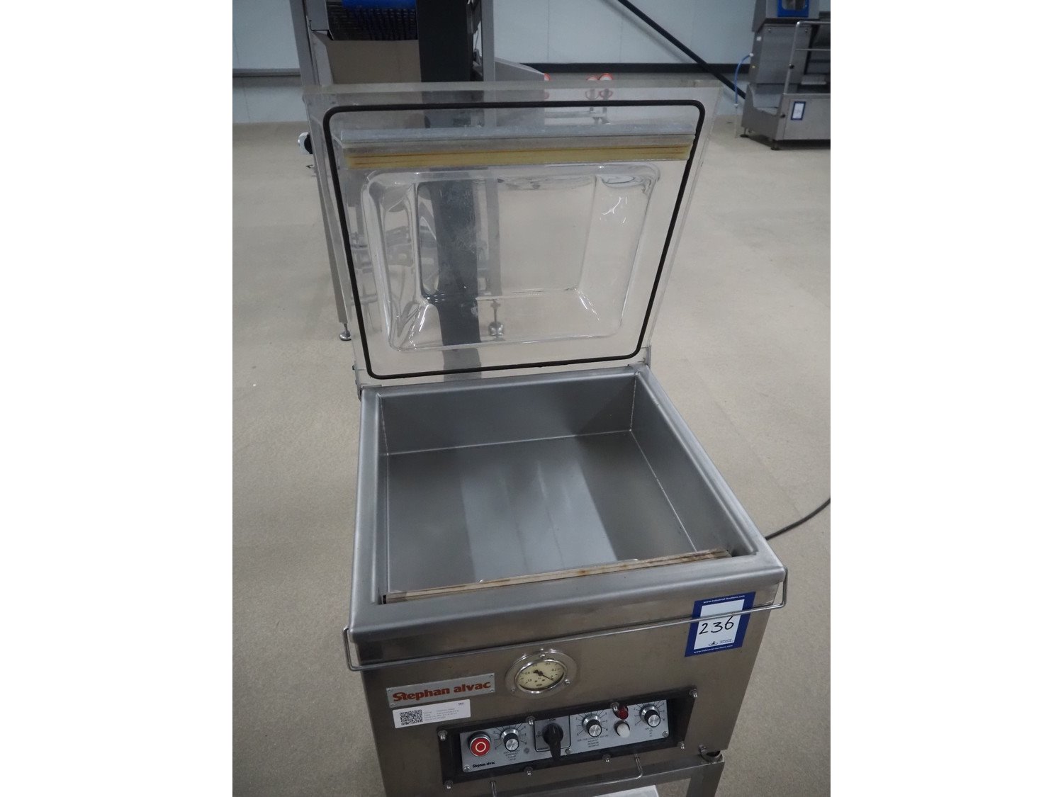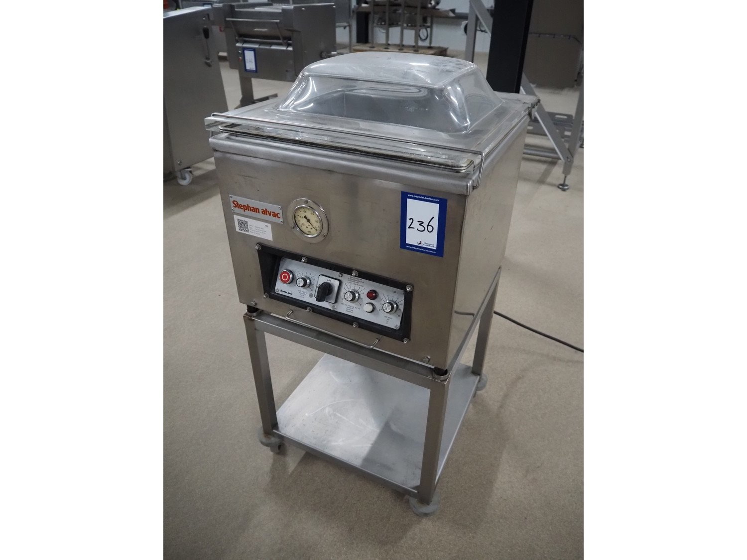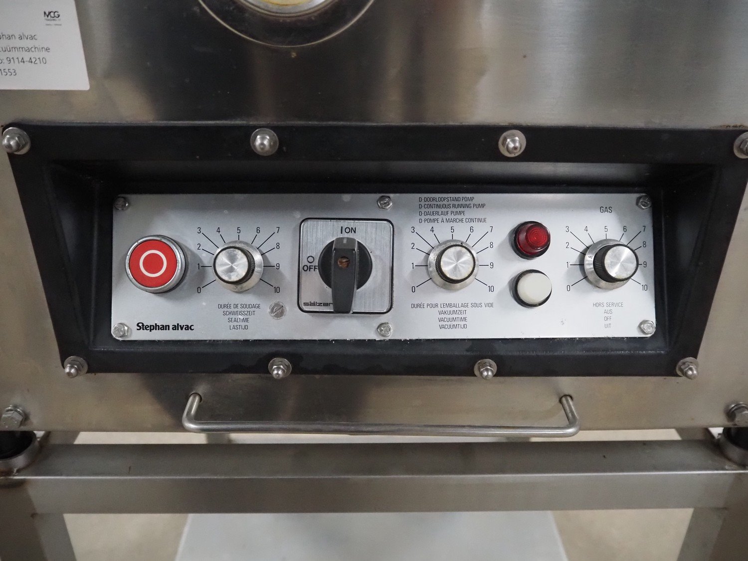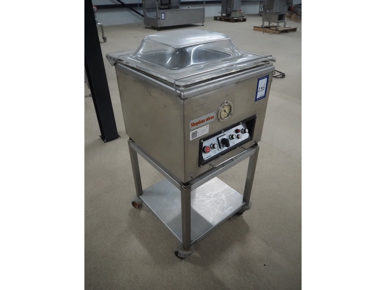 Stephan alvac vacuum machine on mobile s/s frame, type: Alvac I 90, machine number: 9114-4210, 230 V, 1 Ph, 50 Hz, 4.9 A, 0.75 kW, seal length: 420 mm, dimensions chamber: 430 mm x 380 mm, Busch vacuum pump, type: 021-336, total dimensions: 500 mm x 480 mm x 1070 mm. Kavel locatie: Amfoor 6, 4421 SE Kapelle, Nederland