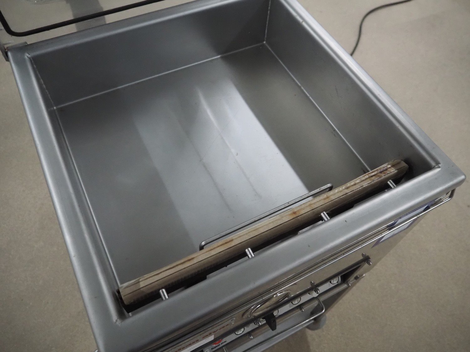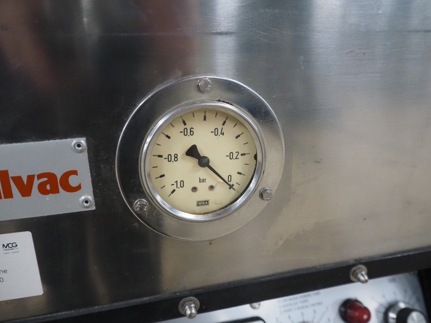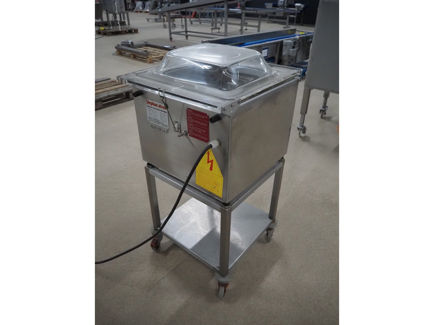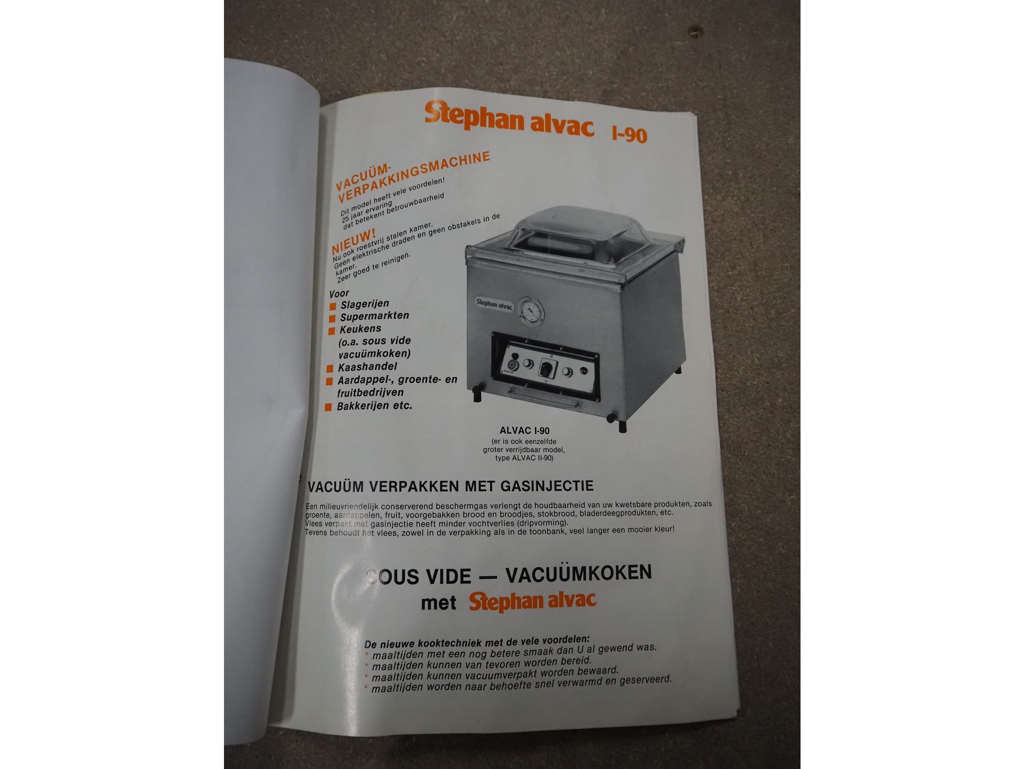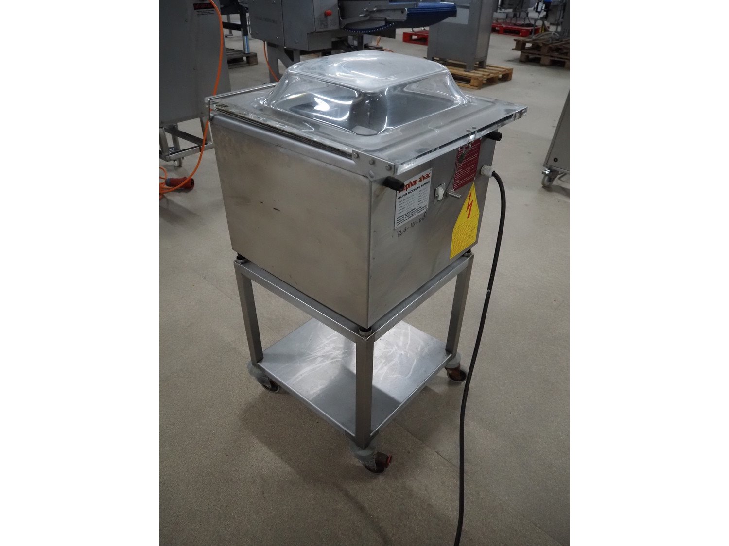 Stephan alvac vacuum machine on mobile s/s frame, type: Alvac I 90, machine number: 9114-4210, 230 V, 1 Ph, 50 Hz, 4.9 A, 0.75 kW, seal length: 420 mm, dimensions chamber: 430 mm x 380 mm, Busch vacuum pump, type: 021-336, total dimensions: 500 mm x 480 mm x 1070 mm. Kavel locatie: Amfoor 6, 4421 SE Kapelle, Nederland
