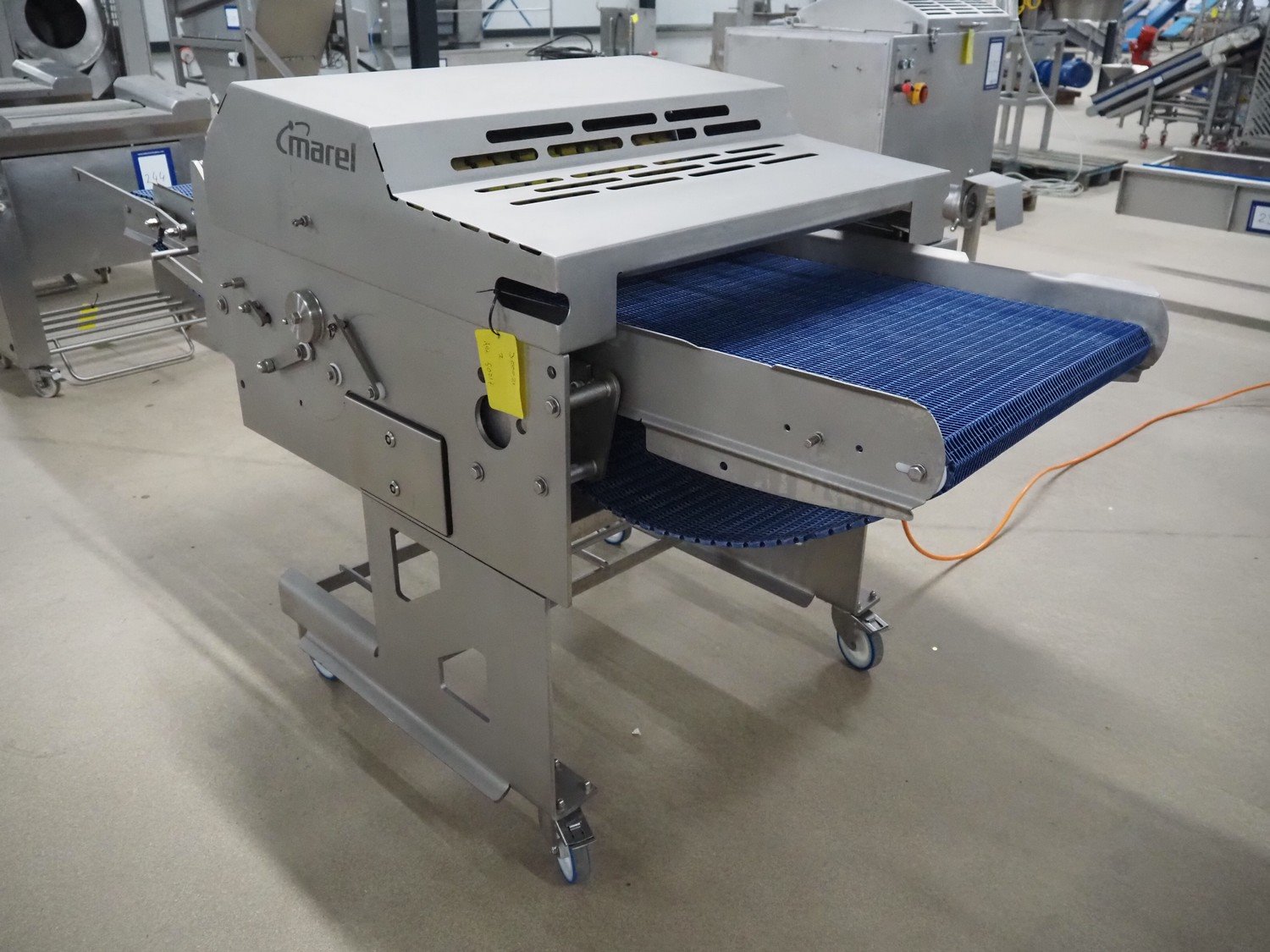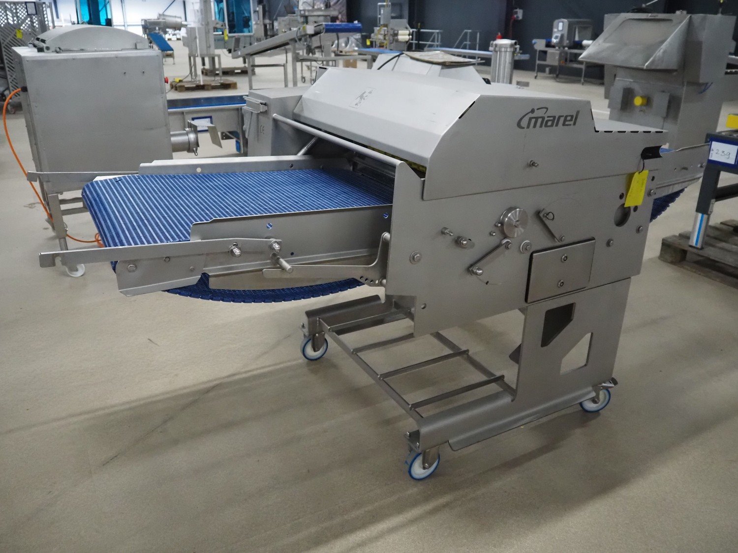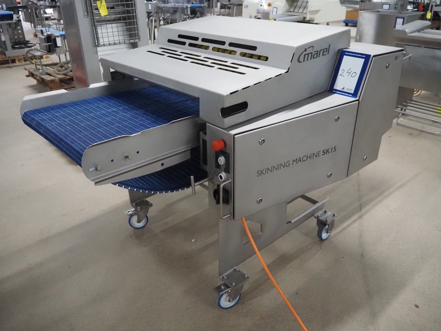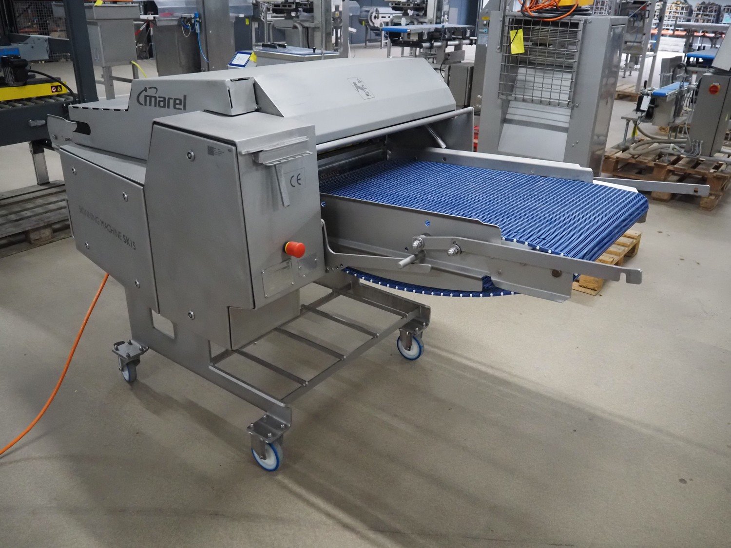 Marel mobile skinning and derinding machine, model: SK 15-320 20 INCH, type: 9838643, serial number: 10421662, year of construction: 2019, 400 V, 3 Ph, 50 Hz, 3.5 A, weight: 408 kg, working width: 500 mm, plastic mesh belt, belt width: 500 mm, total dimensions: 2200 mm x 1000 mm x 1300 mm. Kavel locatie: Amfoor 6, 4421 SE Kapelle, Nederland