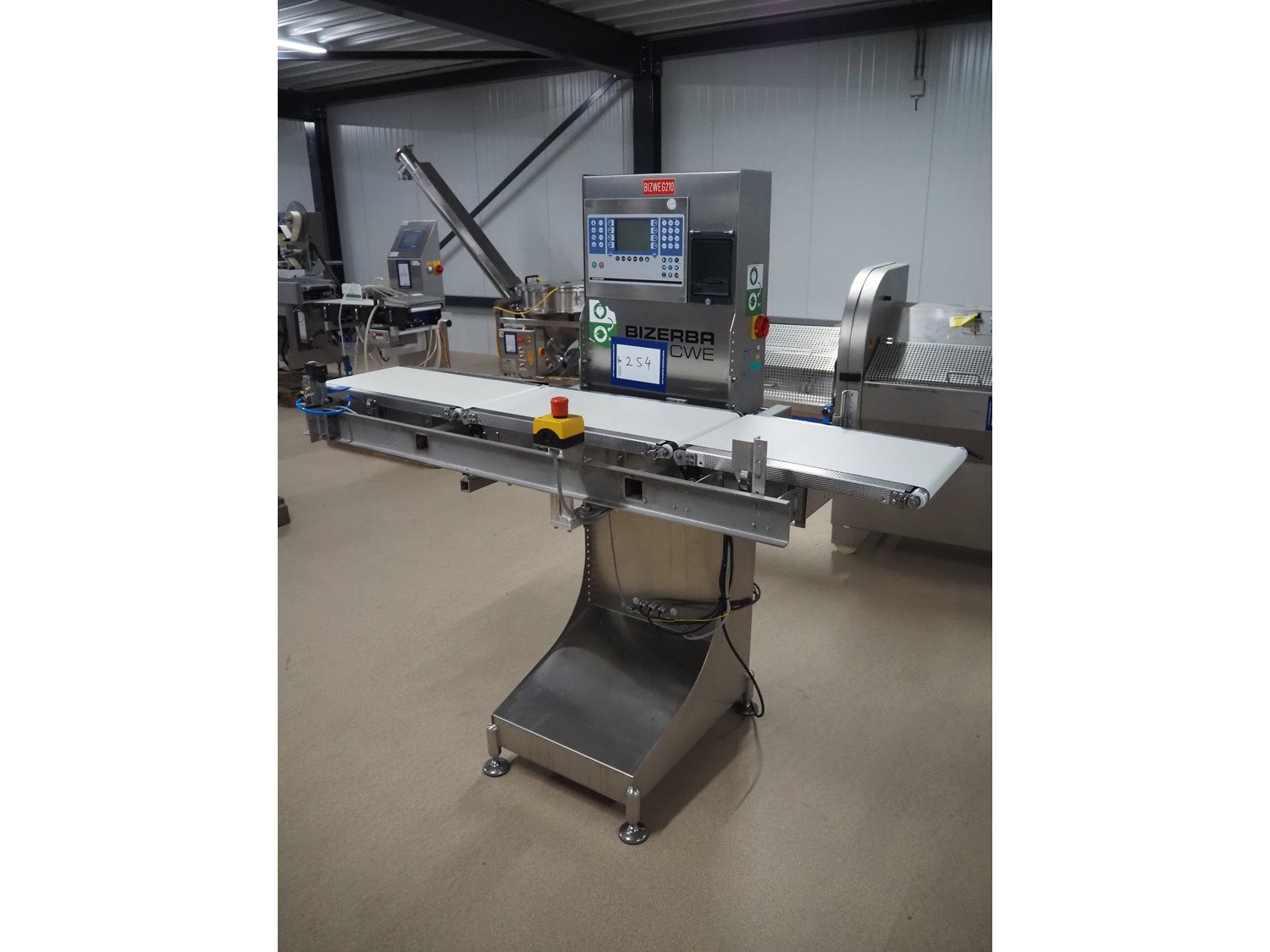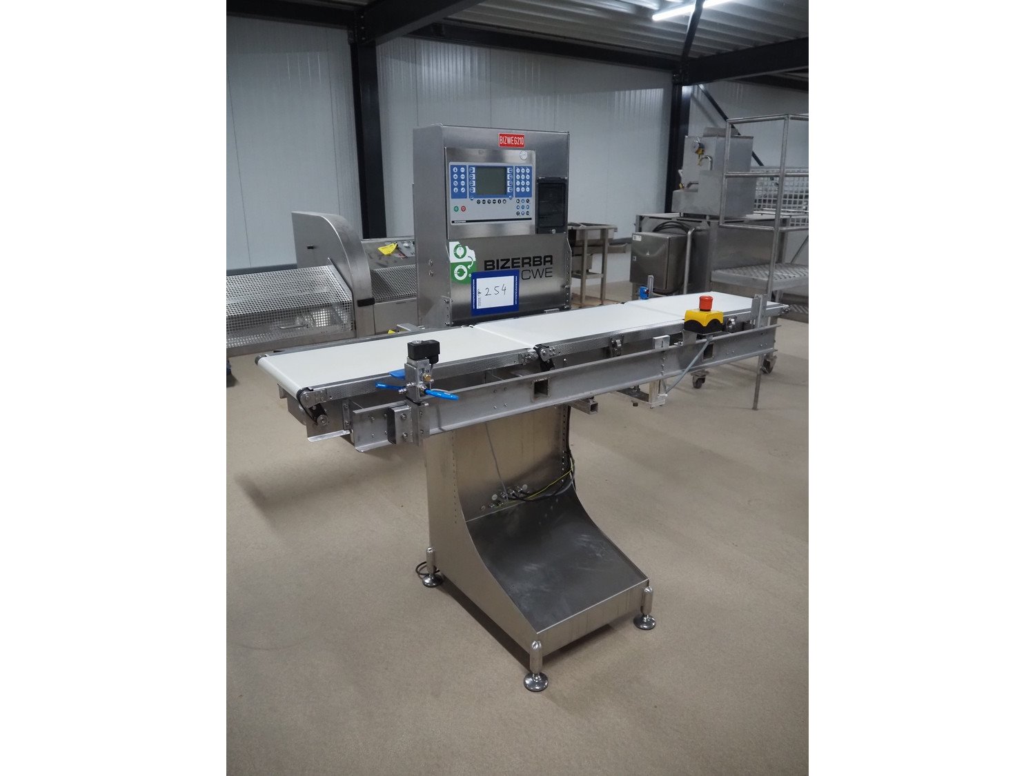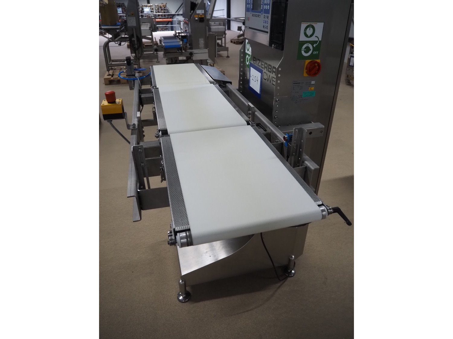 Bizerba checkweigher, model: CWE, number: 10754550, 200/220-240 V, 50/60 Hz, 5/3 A, maximum weight: 1500/3000 gram, minimum weight: 50 gram, e=d= 0.5/1 gram, plastic belt, belt width: 300 mm, total dimensions: 1800 mm x 920 mm x 1700 mm. Kavel locatie: Amfoor 6, 4421 SE Kapelle, Nederland