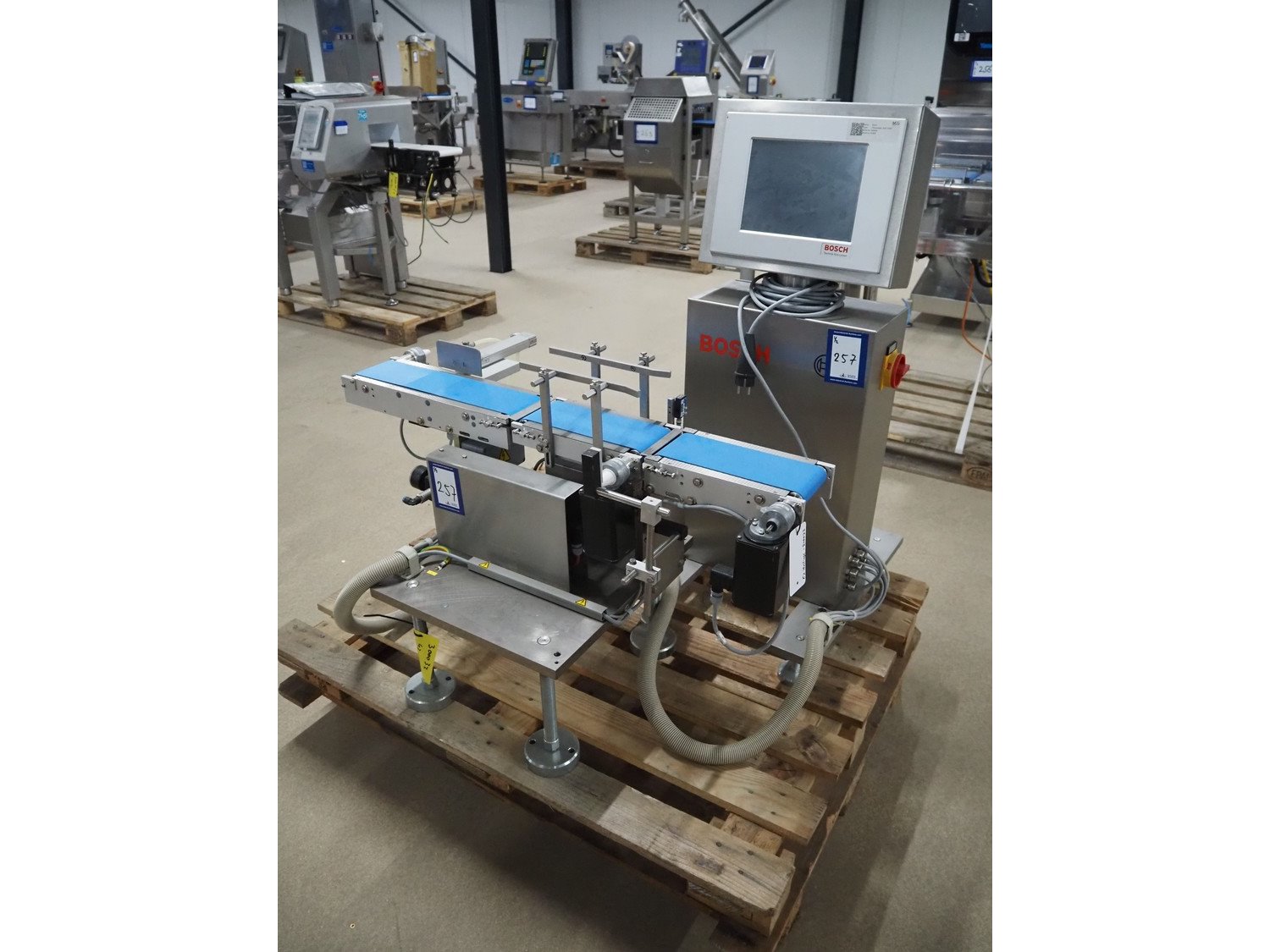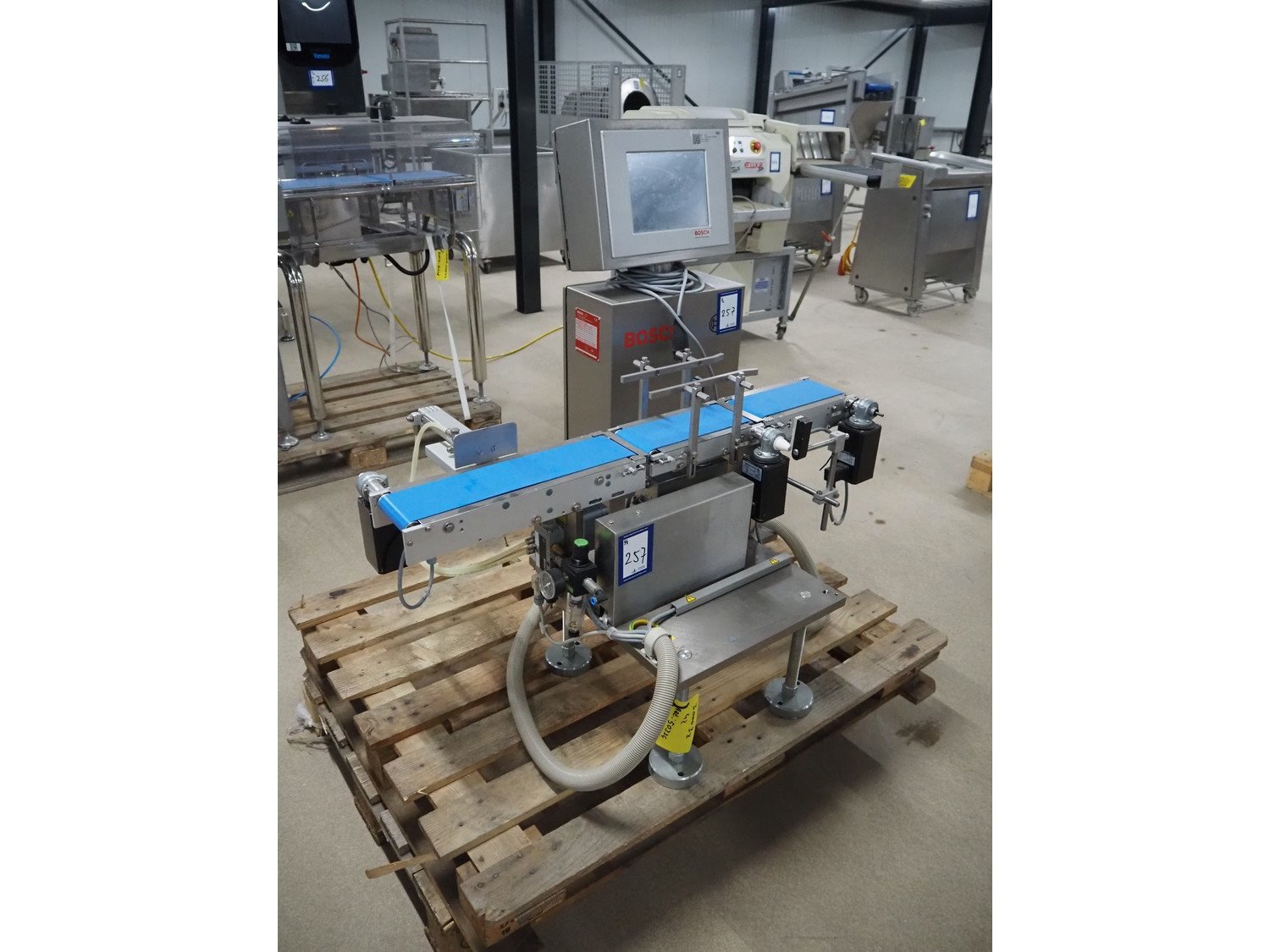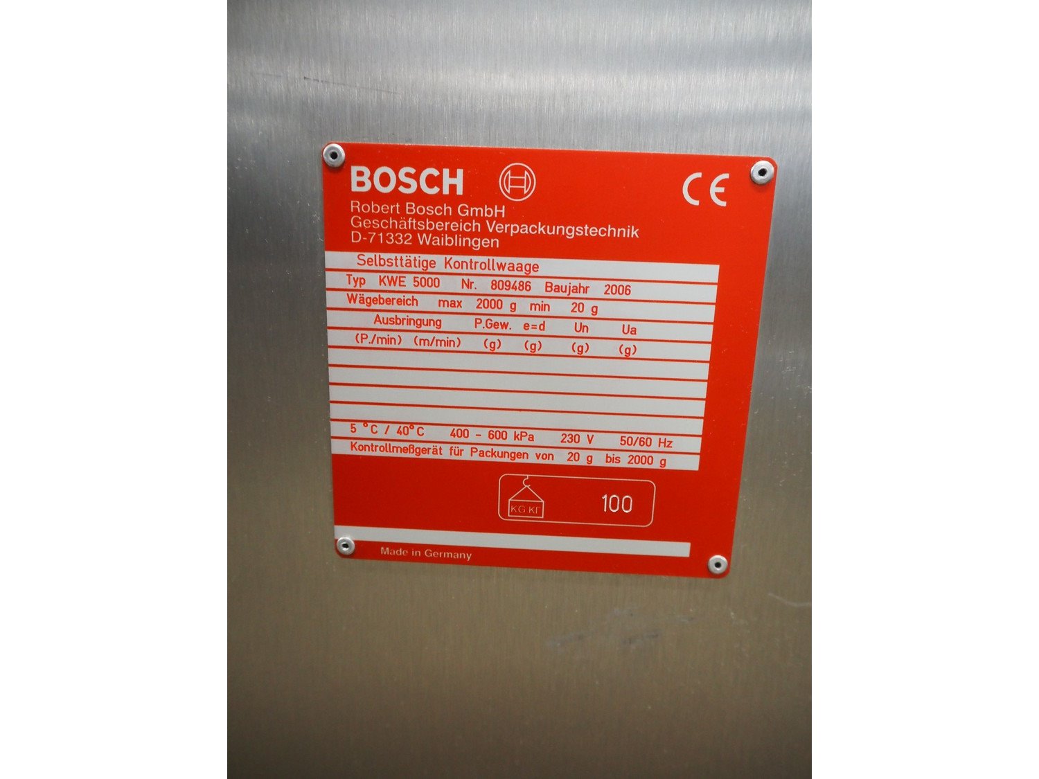 Bosch checkweigher with rejector, type: KWE 5000, number: 809486, year of construction: 2006, 230 V, 1 Ph, 50/60 Hz, 16/3 A, maximum capacity: 2000 g, minimum capacity: 20 g, plastic belts, belt width: 100 mm, total dimensions: 1050 mm x 1050 mm x 1050 mm. Kavel locatie: Amfoor 6, 4421 SE Kapelle, Nederland