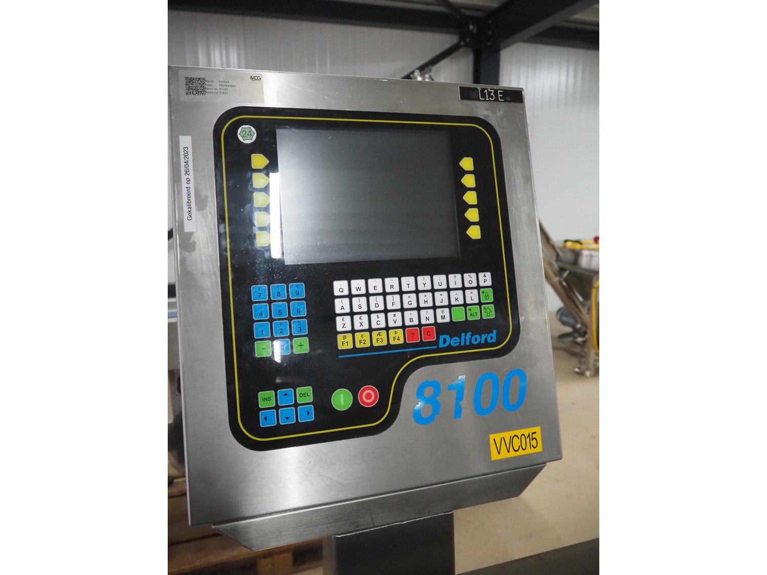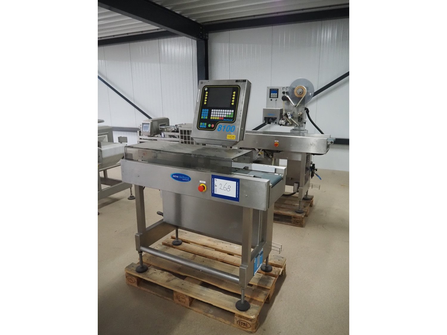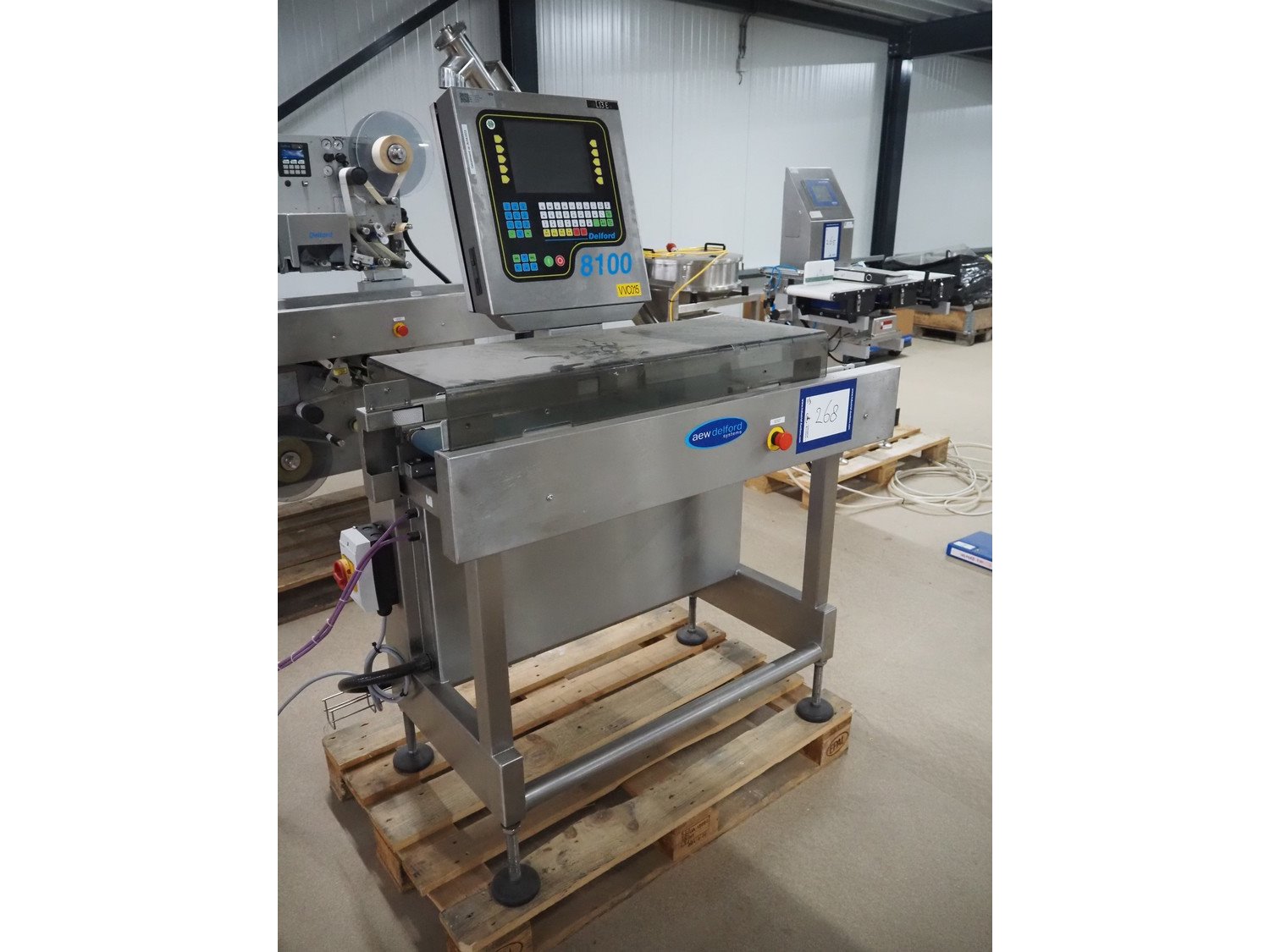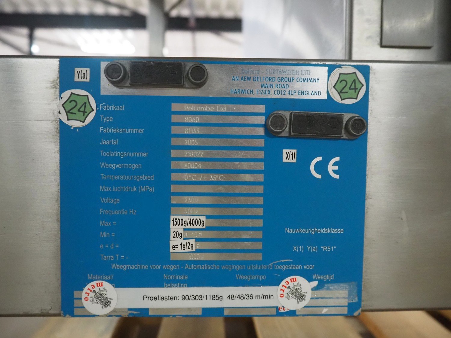AEW Delford checkweigher with labelling machine, type checkweigher: 8060, fabrication number: 81133, year of construction: 2005, 230 V, 50 Hz, maximum weight: 1500-4000 gram, minimum weight: 20-40 gram, e =1-2 gram, T = -1000 gram, type labeller: 8000, plastic belt, belt width: (2x) 90 mm and 195 mm, dimensions checkweigher: 1500 mm x 700 mm x 1630 mm and dimensions labelling machine: 1200 mm x 700 mm x 1530 mm. Kavel locatie: Amfoor 6, 4421 SE Kapelle, Nederland