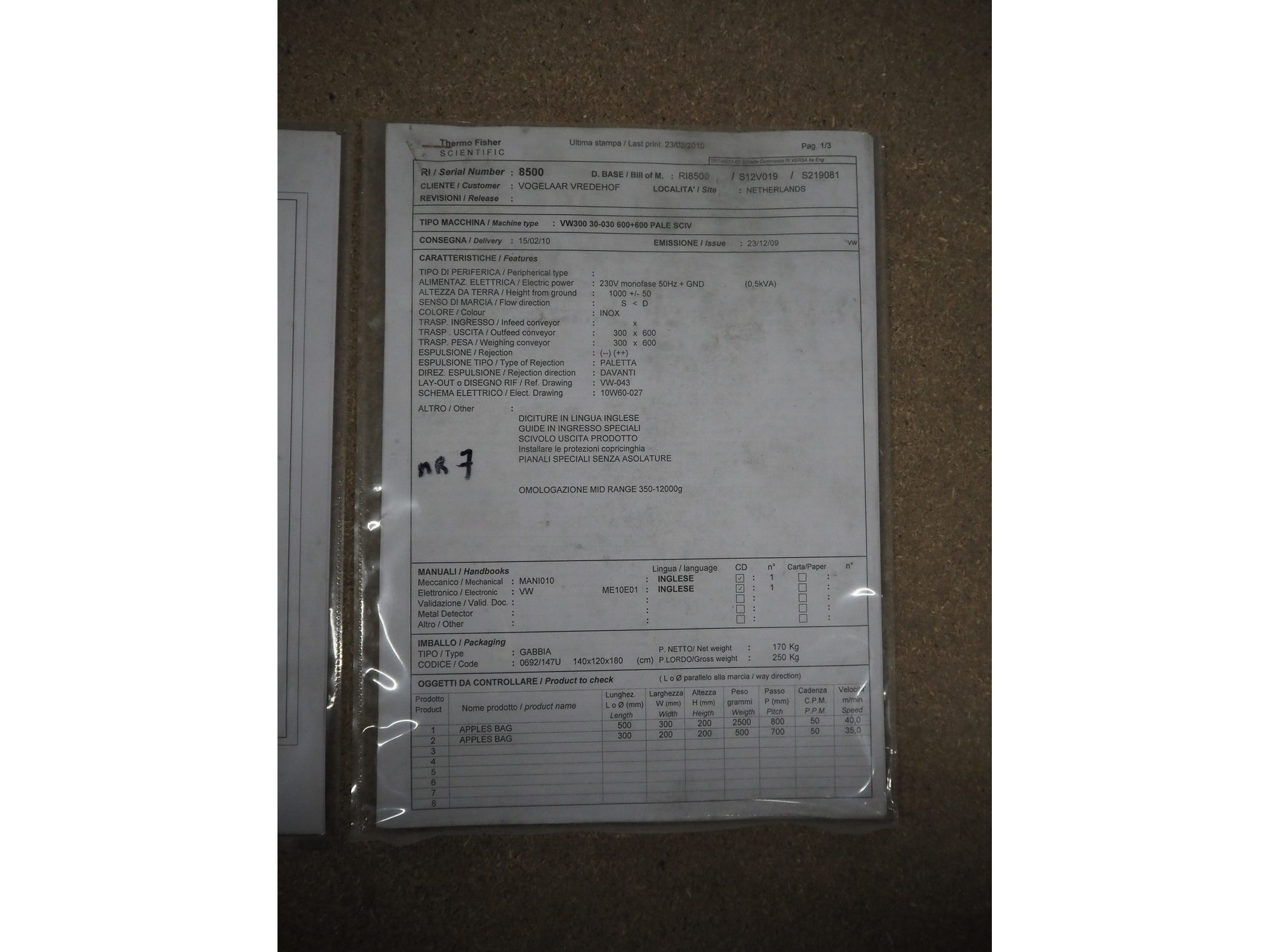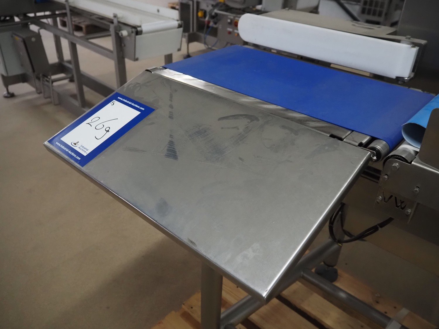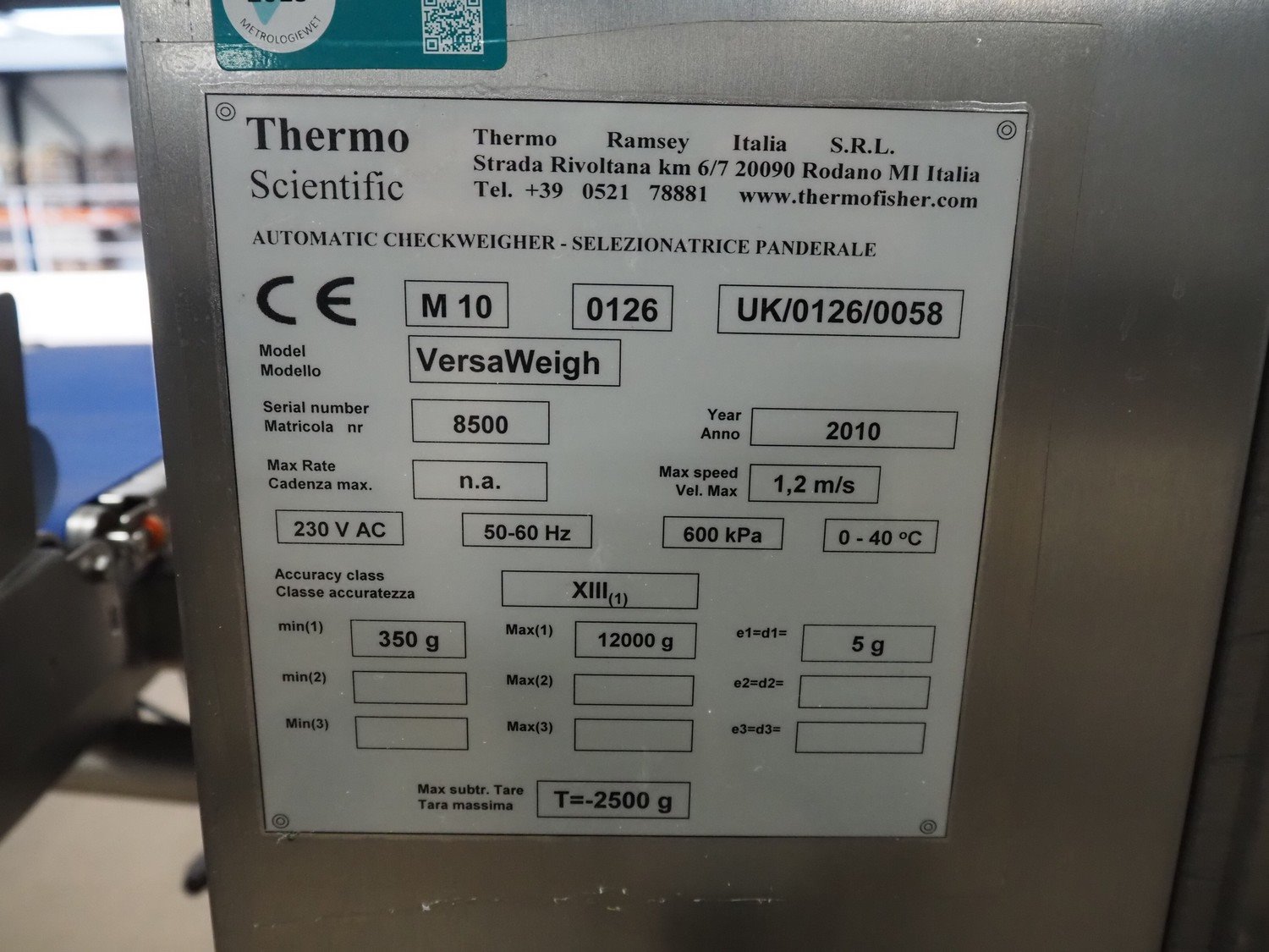 Thermo Scientific checkweigher with rejector, model: VersaWeigh, serial number: 8500, year of construction: 2010, 230 V, 50-60 Hz, minimum weight: 350 gram, maximum weight: 12000 gram, e=d= 5 gram, maximum speed: 1.2 m/s, plastic belt, belt width: 300 mm, total dimensions: 1250 mm x 1100 mm x 1550 mm. Kavel locatie: Amfoor 6, 4421 SE Kapelle, Nederland