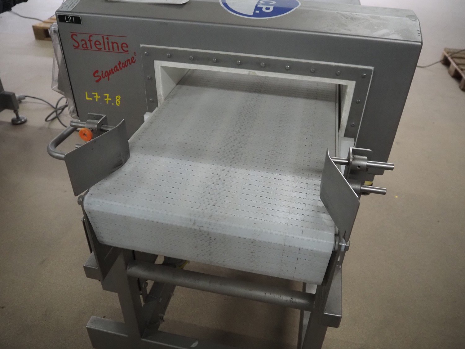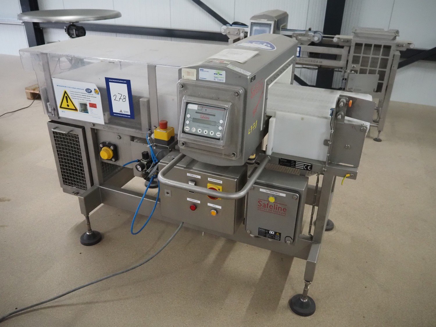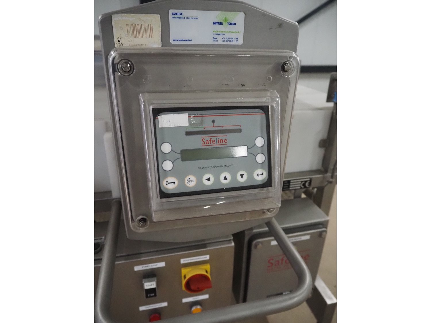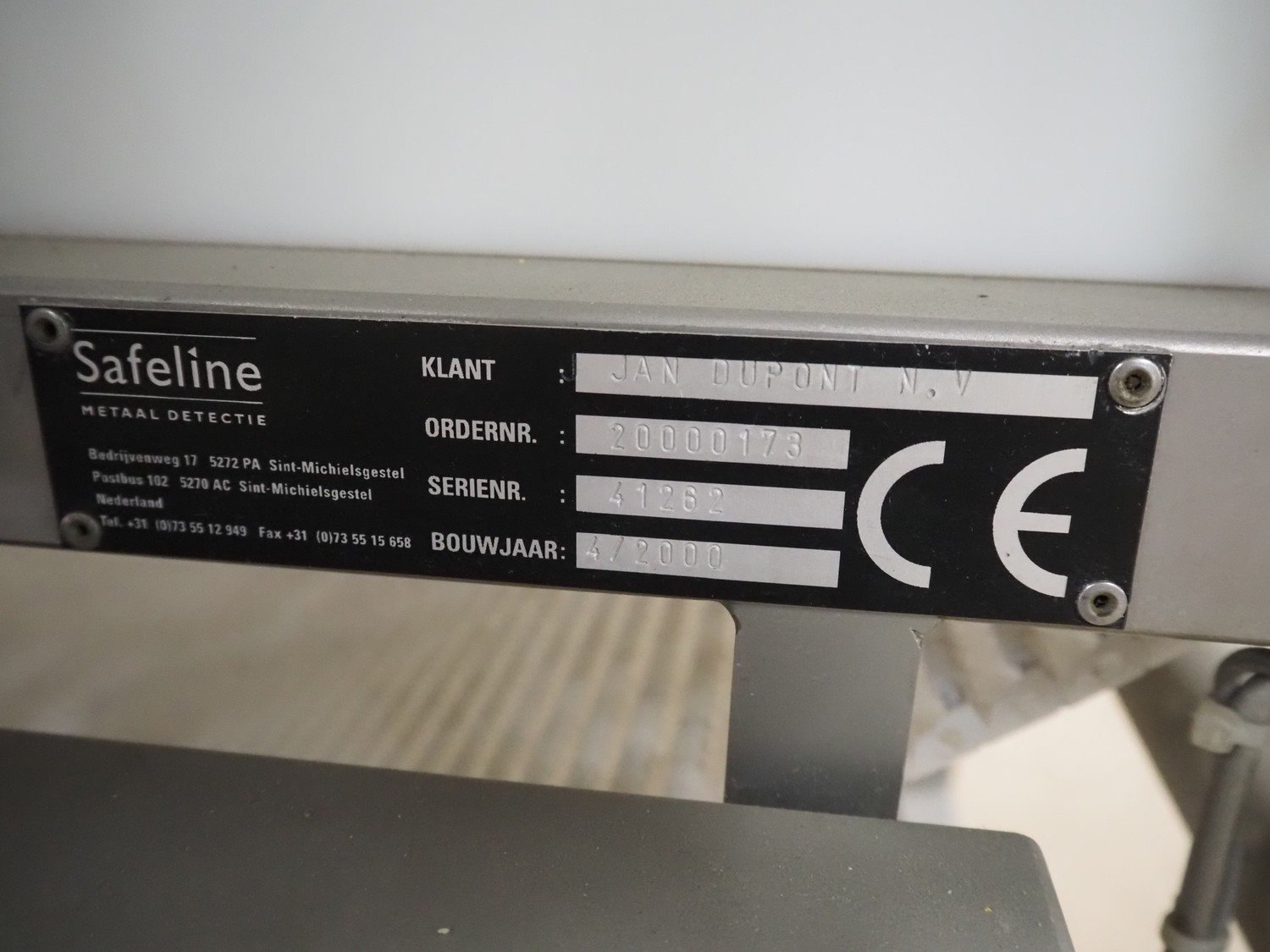 Safeline metal detector, serial number: 41262, year of construction: 4/2000, 100-240 Vac, 50/60 Hz, 330 W, plastic belt, belt width: 430 mm, clearance: 450 mm x 95 mm, total dimensions: 1750 mm x 1050 mm x 1130 mm. Kavel locatie: Amfoor 6, 4421 SE Kapelle, Nederland