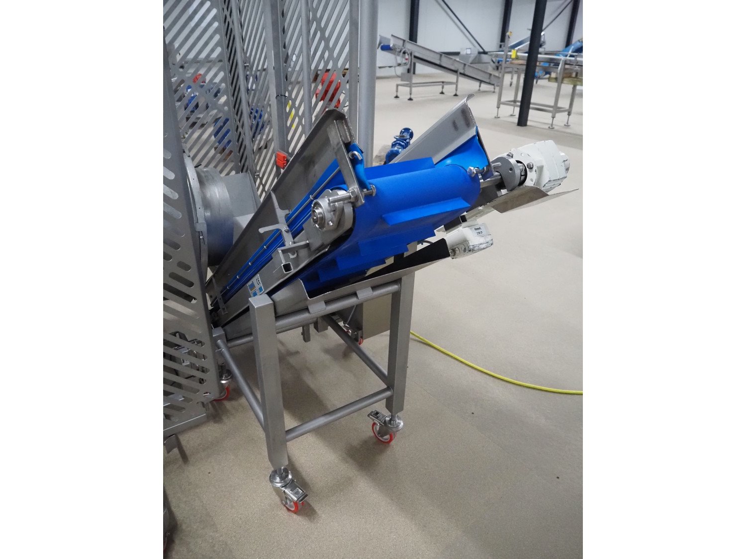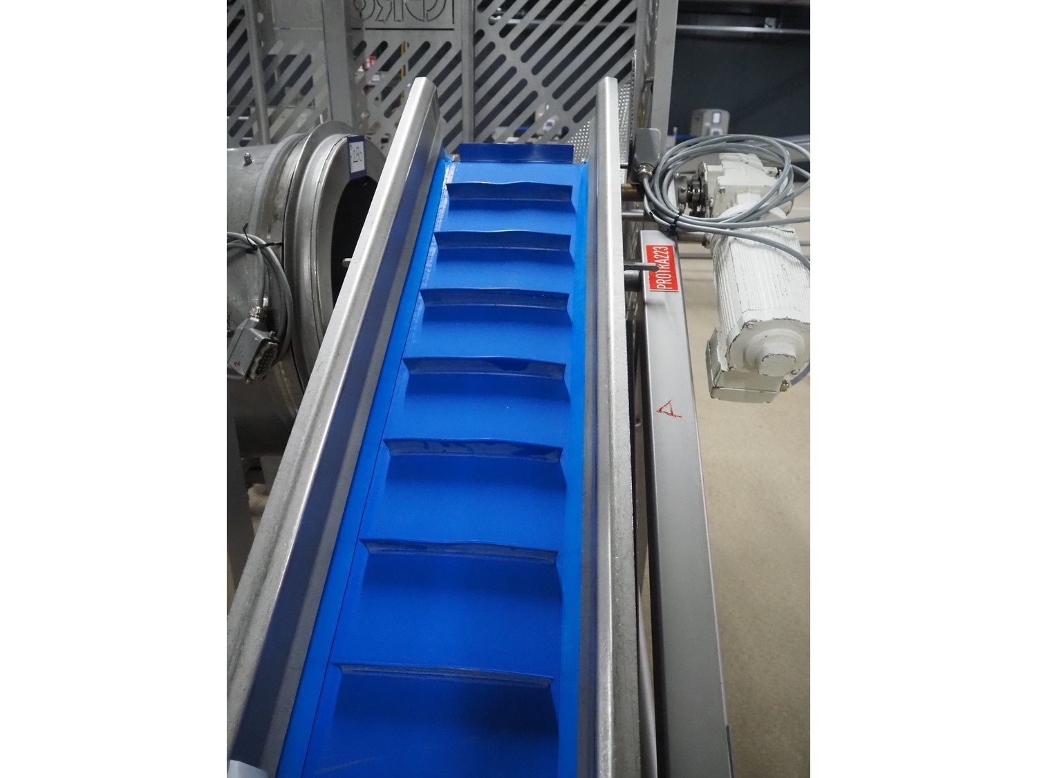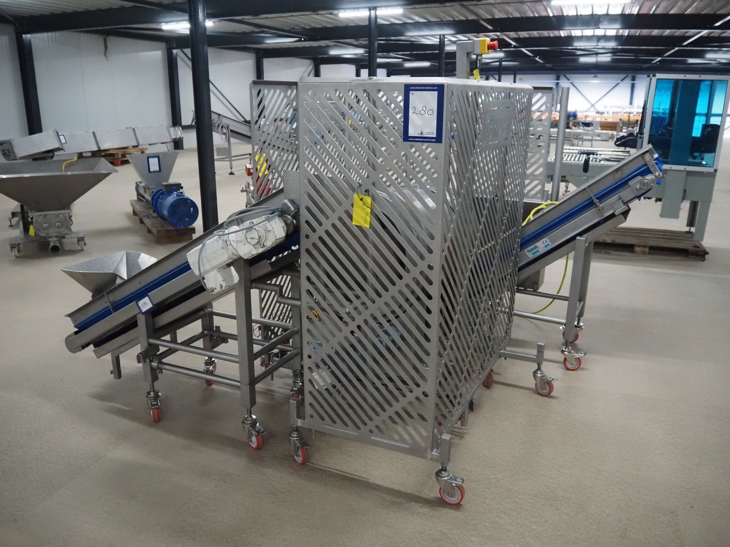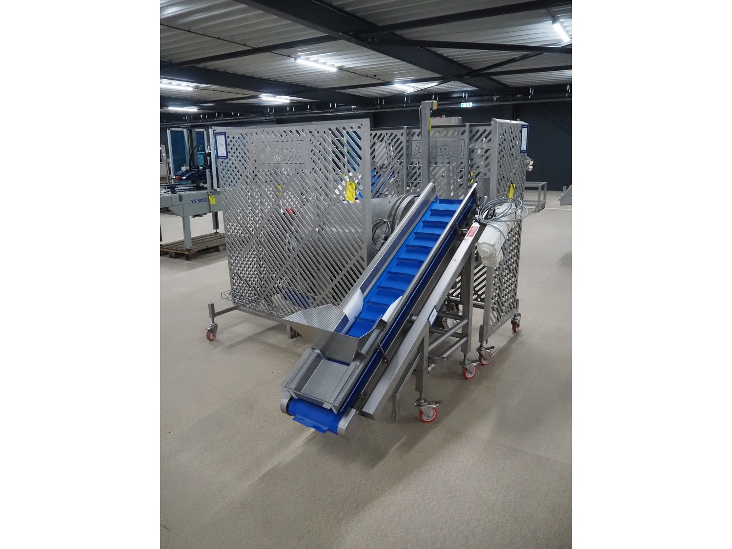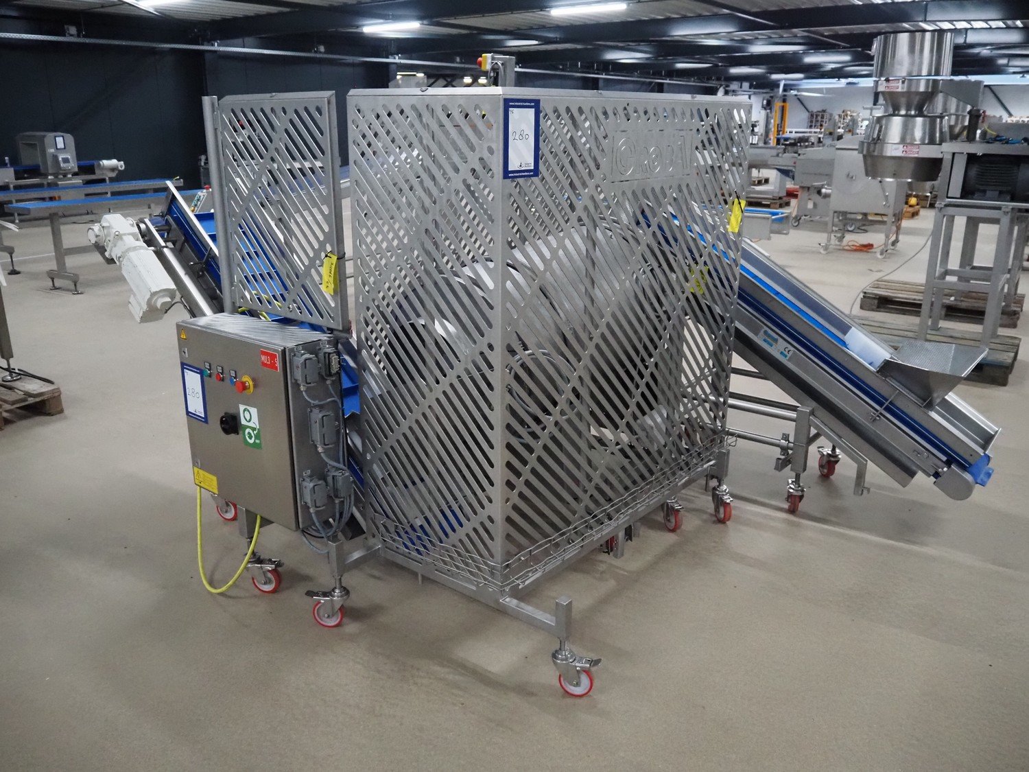 Groba cheese cube distributor with infeed and outfeed belt: Infeed elevating belt, type: TB-304,L=1600-29°, number: 122698, year of construction: 2014, weight: 115 kg, plastic belt with dividers, belt width: 250 mm, dividers height: 35 mm, distance between dividers: 120 mm, elevating height: 1130 mm, elevating belt dimensions: 1470 mm x 670 mm x 1250 mm.Cube distributor, type: PM-625, number: 122698, year of construction: 2014, weight: 215 kg, infeed: Ø 485 mm, outfeed: Ø 400 mm, drum length: 1020 mm, cube distributor dimensions: 1620 mm x 600 mm x 1290 mmOutfeed elevating belt, type: TB-304, L=1600-38,5°, number: 122698, year of construction: 2014, machine weight: 150 kg, plastic belt with dividers, belt width: 250 mm, dividers height: 35 mm, distance between dividers: 115 mm, elevating height: 1250 mm, elevating belt dimensions: 1600 mm x 750 mm x 1380 mm, total dimensions: 2740 mm x 2300 mm x 1850 mm. Kavel locatie: Amfoor 6, 4421 SE Kapelle, Nederland