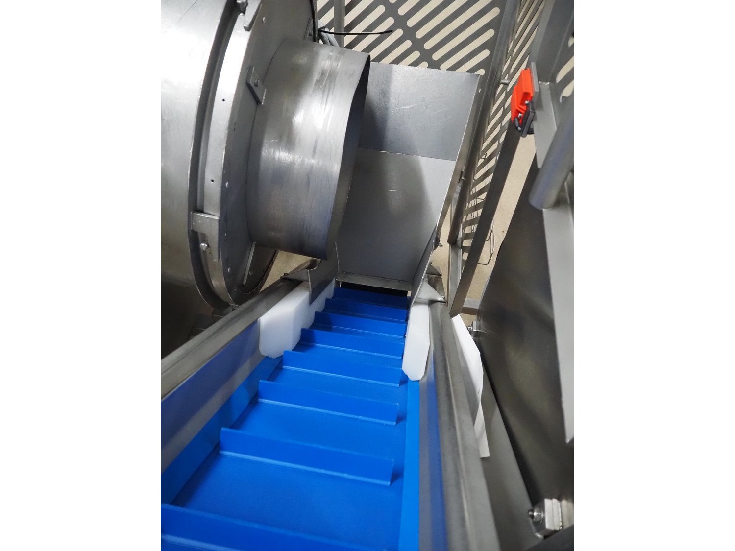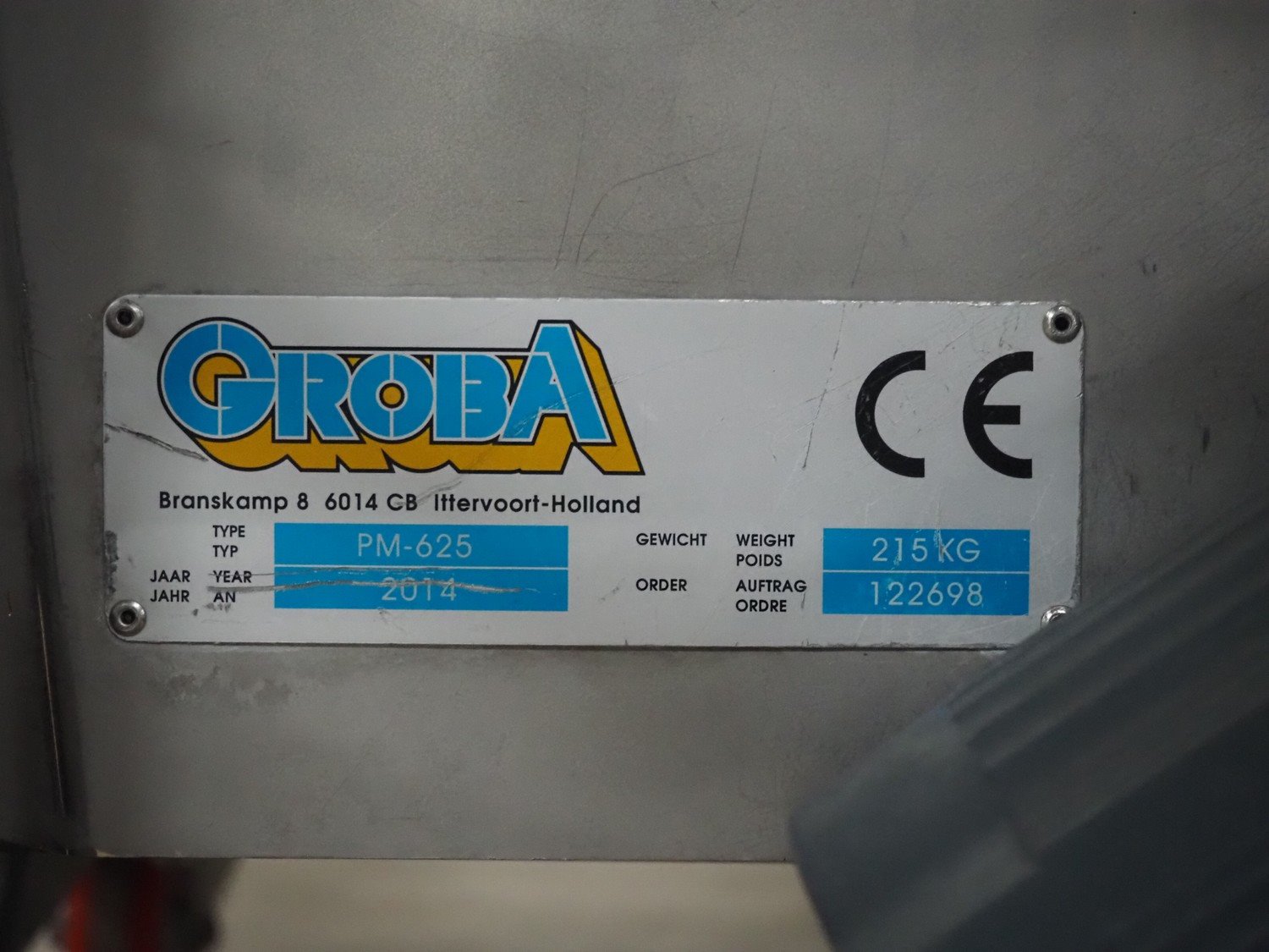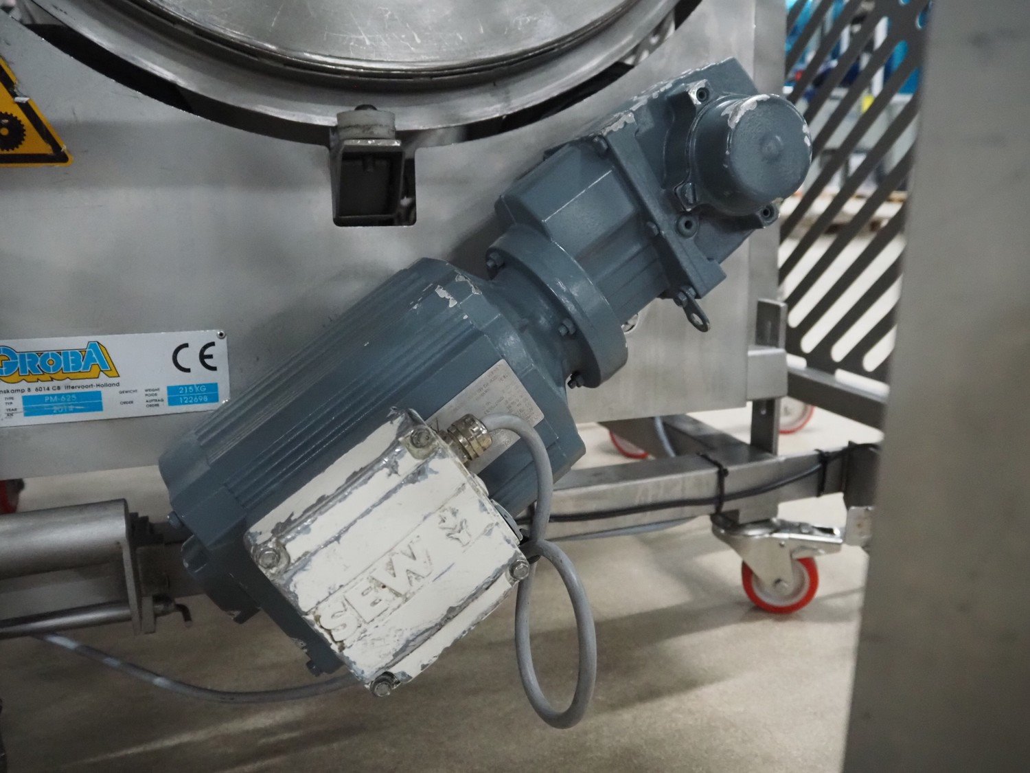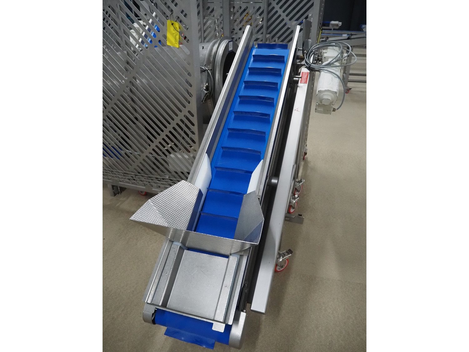 Groba cheese cube distributor with infeed and outfeed belt: Infeed elevating belt, type: TB-304,L=1600-29°, number: 122698, year of construction: 2014, weight: 115 kg, plastic belt with dividers, belt width: 250 mm, dividers height: 35 mm, distance between dividers: 120 mm, elevating height: 1130 mm, elevating belt dimensions: 1470 mm x 670 mm x 1250 mm.Cube distributor, type: PM-625, number: 122698, year of construction: 2014, weight: 215 kg, infeed: Ø 485 mm, outfeed: Ø 400 mm, drum length: 1020 mm, cube distributor dimensions: 1620 mm x 600 mm x 1290 mmOutfeed elevating belt, type: TB-304, L=1600-38,5°, number: 122698, year of construction: 2014, machine weight: 150 kg, plastic belt with dividers, belt width: 250 mm, dividers height: 35 mm, distance between dividers: 115 mm, elevating height: 1250 mm, elevating belt dimensions: 1600 mm x 750 mm x 1380 mm, total dimensions: 2740 mm x 2300 mm x 1850 mm. Kavel locatie: Amfoor 6, 4421 SE Kapelle, Nederland