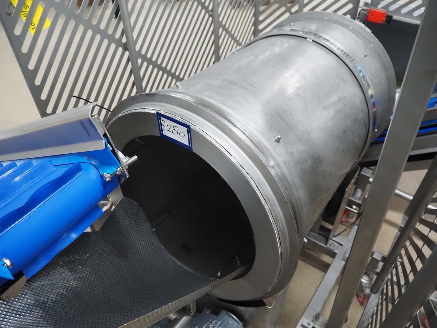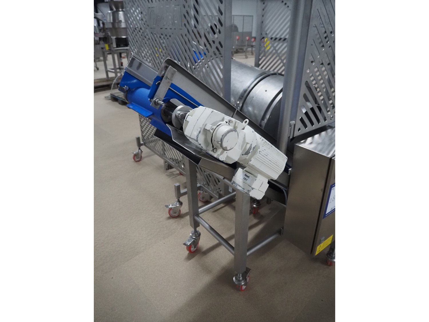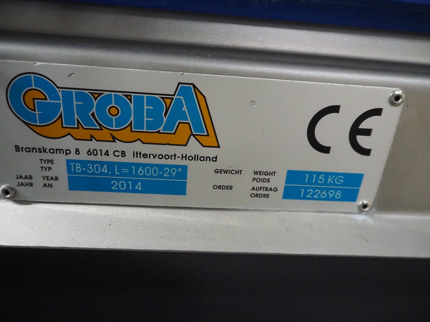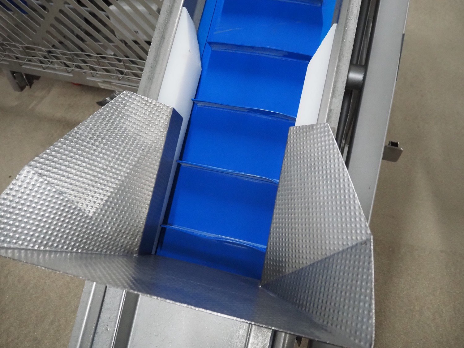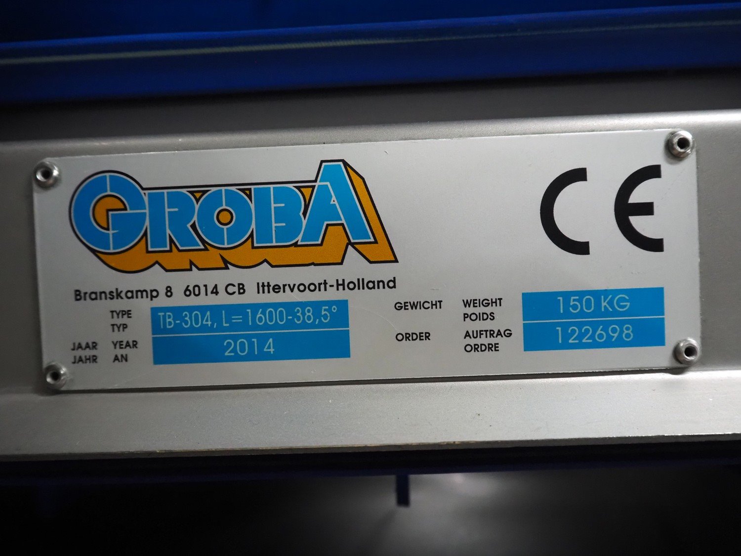 Groba cheese cube distributor with infeed and outfeed belt: Infeed elevating belt, type: TB-304,L=1600-29°, number: 122698, year of construction: 2014, weight: 115 kg, plastic belt with dividers, belt width: 250 mm, dividers height: 35 mm, distance between dividers: 120 mm, elevating height: 1130 mm, elevating belt dimensions: 1470 mm x 670 mm x 1250 mm.Cube distributor, type: PM-625, number: 122698, year of construction: 2014, weight: 215 kg, infeed: Ø 485 mm, outfeed: Ø 400 mm, drum length: 1020 mm, cube distributor dimensions: 1620 mm x 600 mm x 1290 mmOutfeed elevating belt, type: TB-304, L=1600-38,5°, number: 122698, year of construction: 2014, machine weight: 150 kg, plastic belt with dividers, belt width: 250 mm, dividers height: 35 mm, distance between dividers: 115 mm, elevating height: 1250 mm, elevating belt dimensions: 1600 mm x 750 mm x 1380 mm, total dimensions: 2740 mm x 2300 mm x 1850 mm. Kavel locatie: Amfoor 6, 4421 SE Kapelle, Nederland