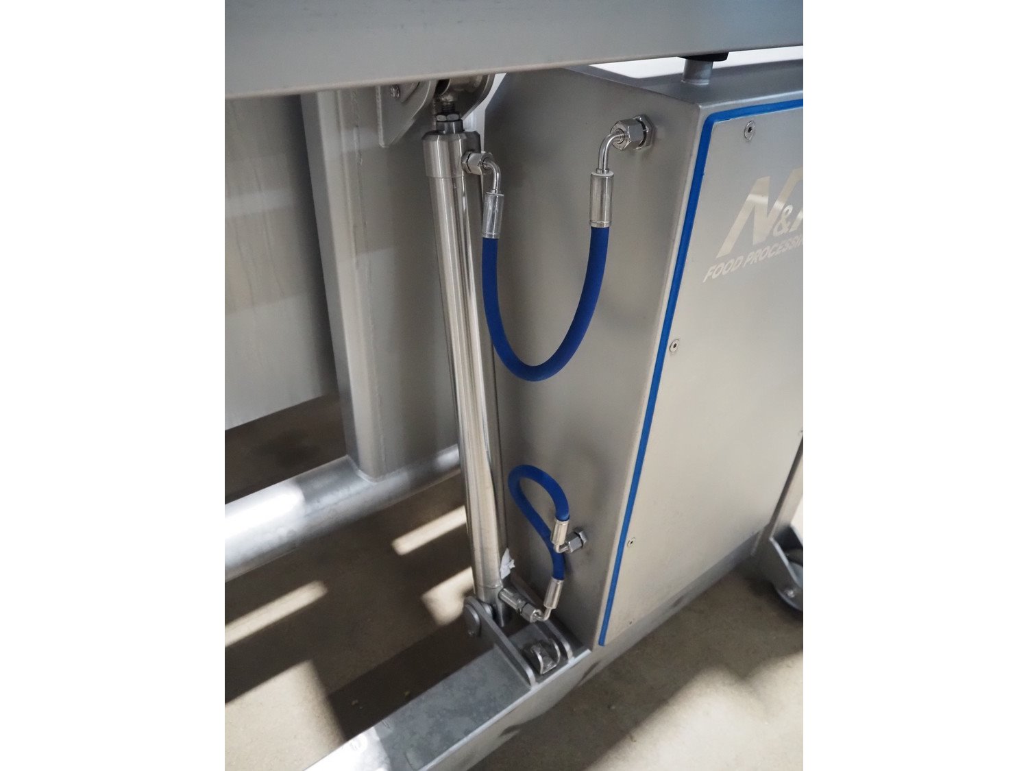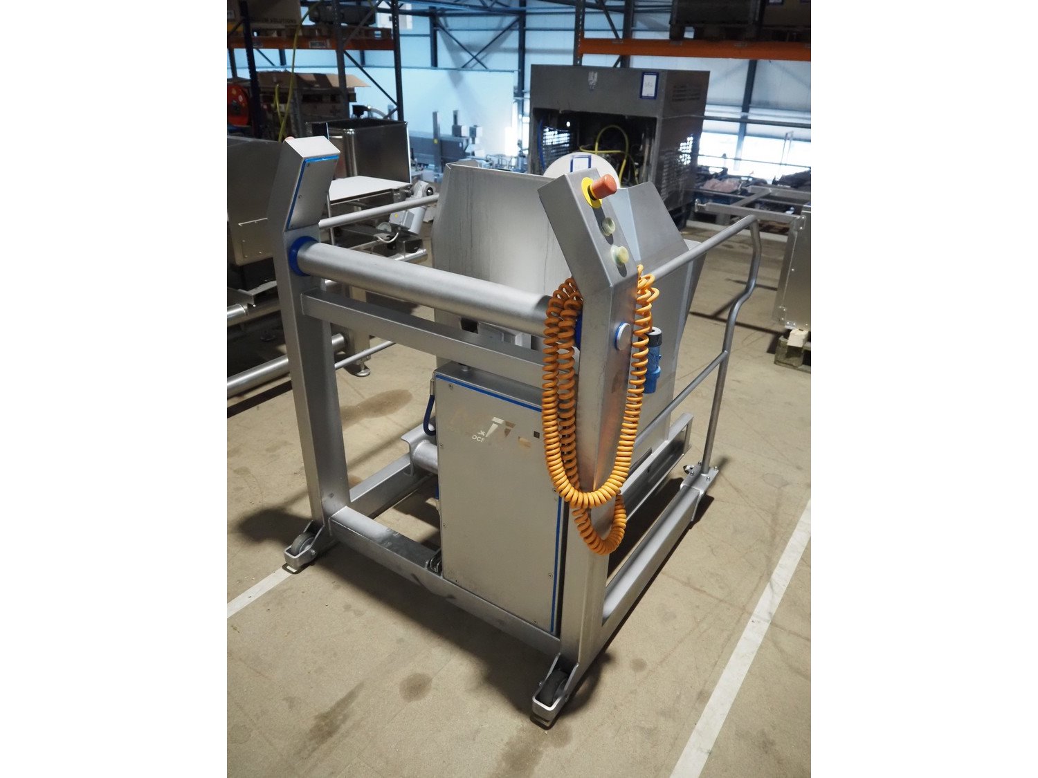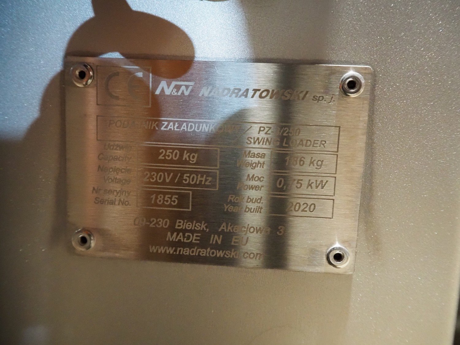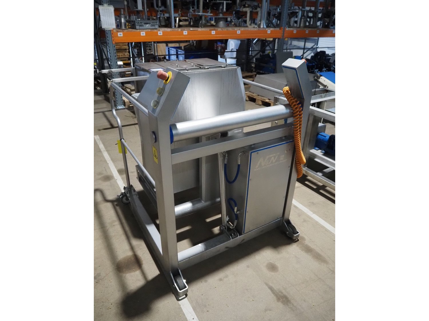 N&N Nadratowski sp.j. mobile tilting device for 200 liter meat bins, model: PZ-3/250 SWING LOADER, serial number: 1855, year of construction: 2020, 230 V, 50 Hz, 0.75 kW, capacity: 250 kg, weight: 186 kg, tilting height: 980 mm, total dimensions: 1220 mm x 960 mm x 1280 mm. Kavel locatie: Amfoor 6, 4421 SE Kapelle, Nederland