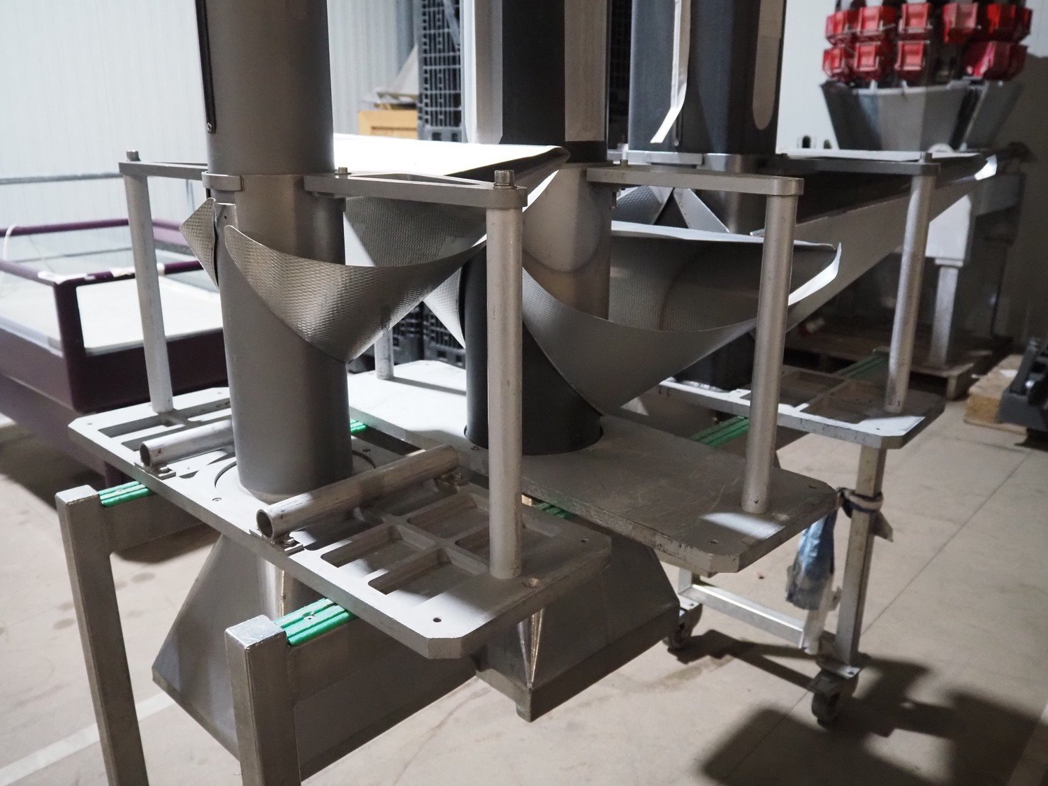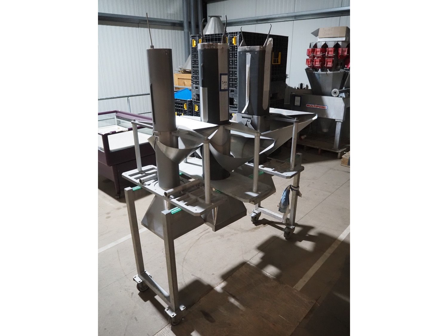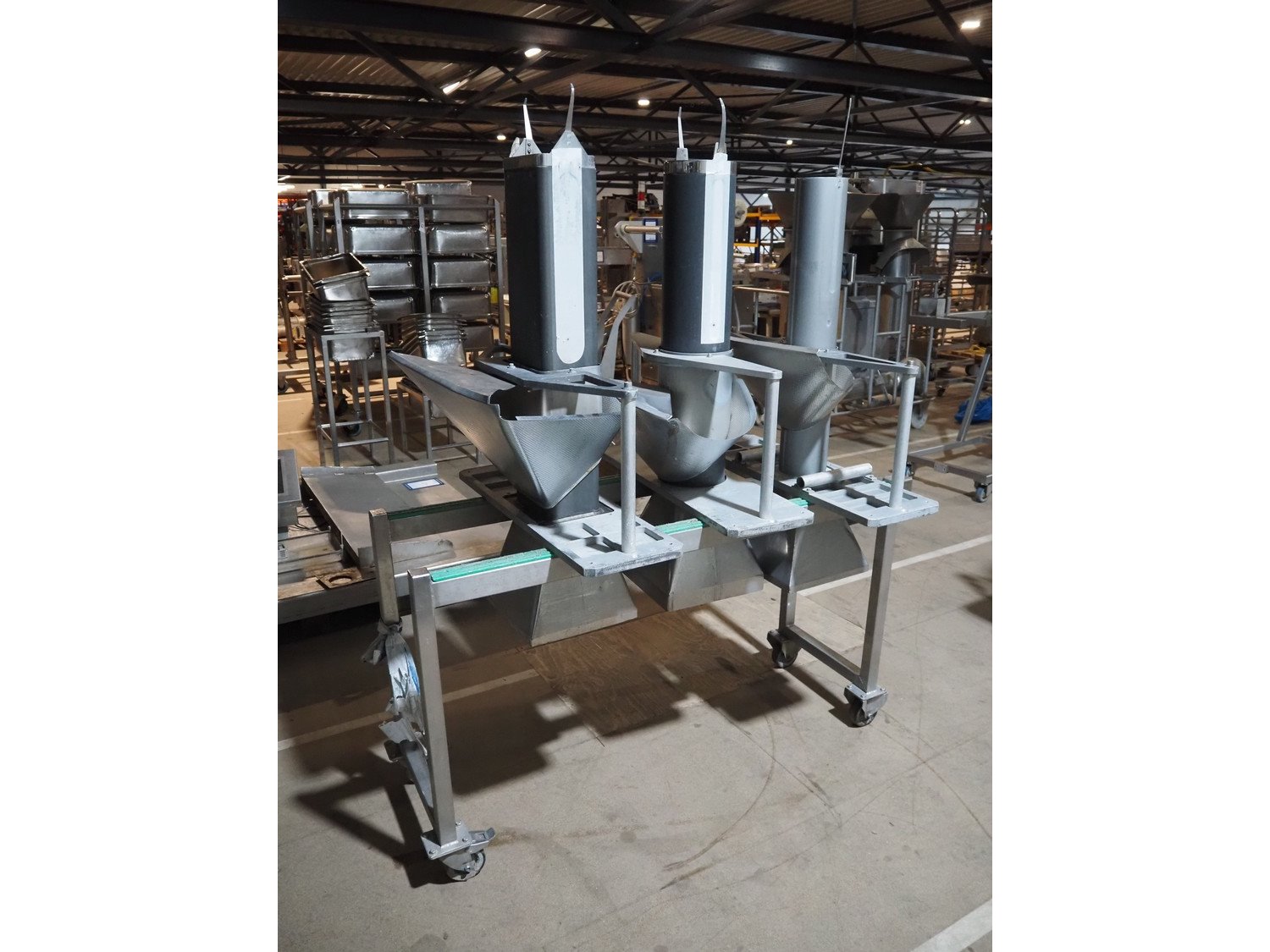 S/s trolley with 3 s/s filling pipes, clearance pipes: Ø 130 mm, Ø 170 mm and 190 mm x 140 mm, dimensions trolley: 1380 mm x 480 mm x 830 mm. Kavel locatie: Amfoor 6, 4421 SE Kapelle, Nederland