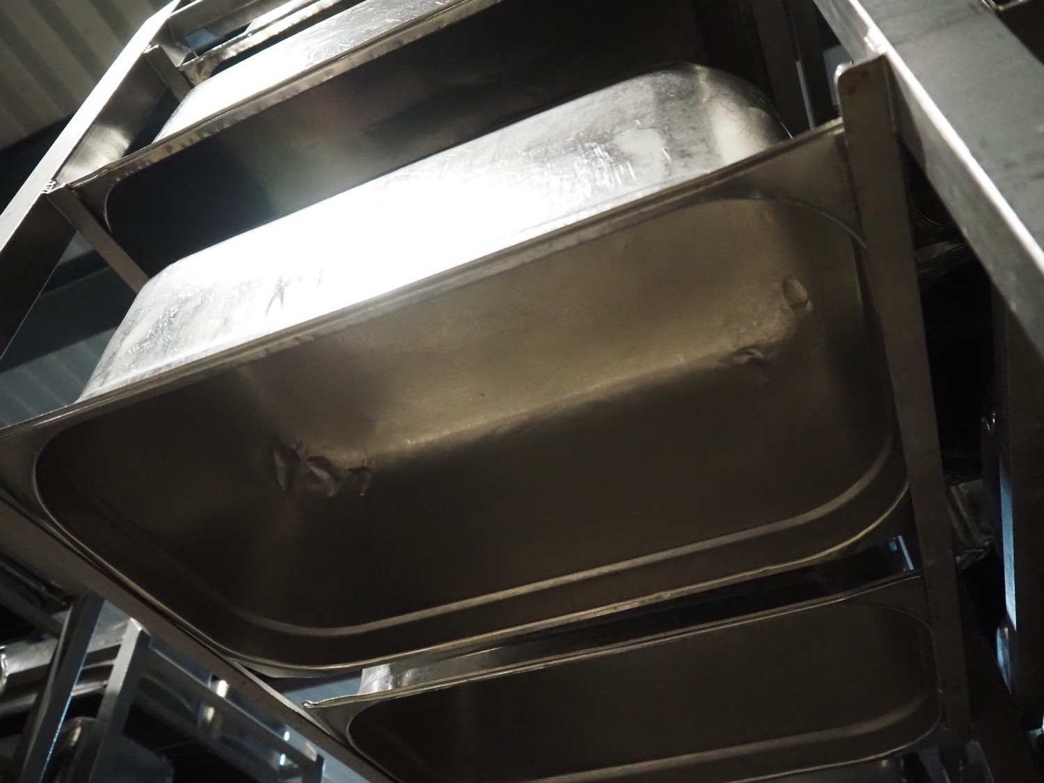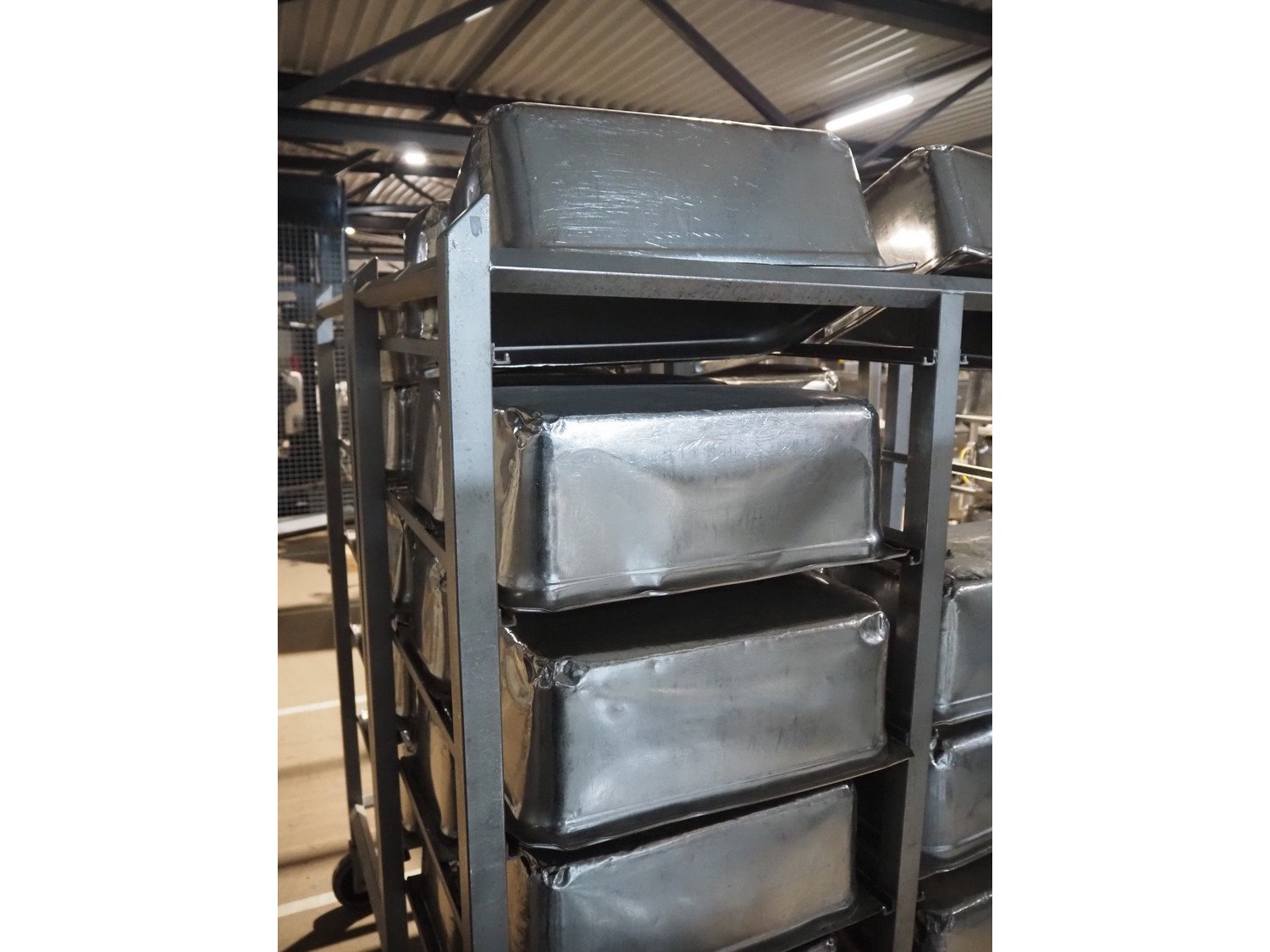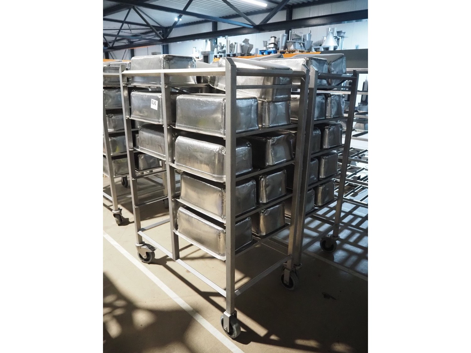 2 s/s trolleys, 2x 5 floors, dimensions each floor: 700 mm x 540 mm, total dimensions: (2x) 1210 mm x 700 mm x 1710 mm. Including large amount of s/s 1/1 gastronorm bins. Kavel locatie: Amfoor 6, 4421 SE Kapelle, Nederland